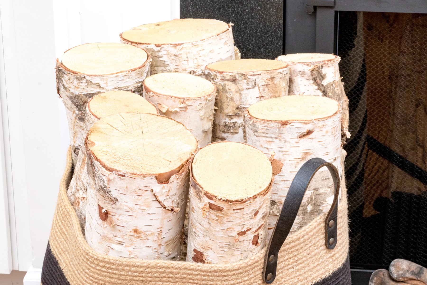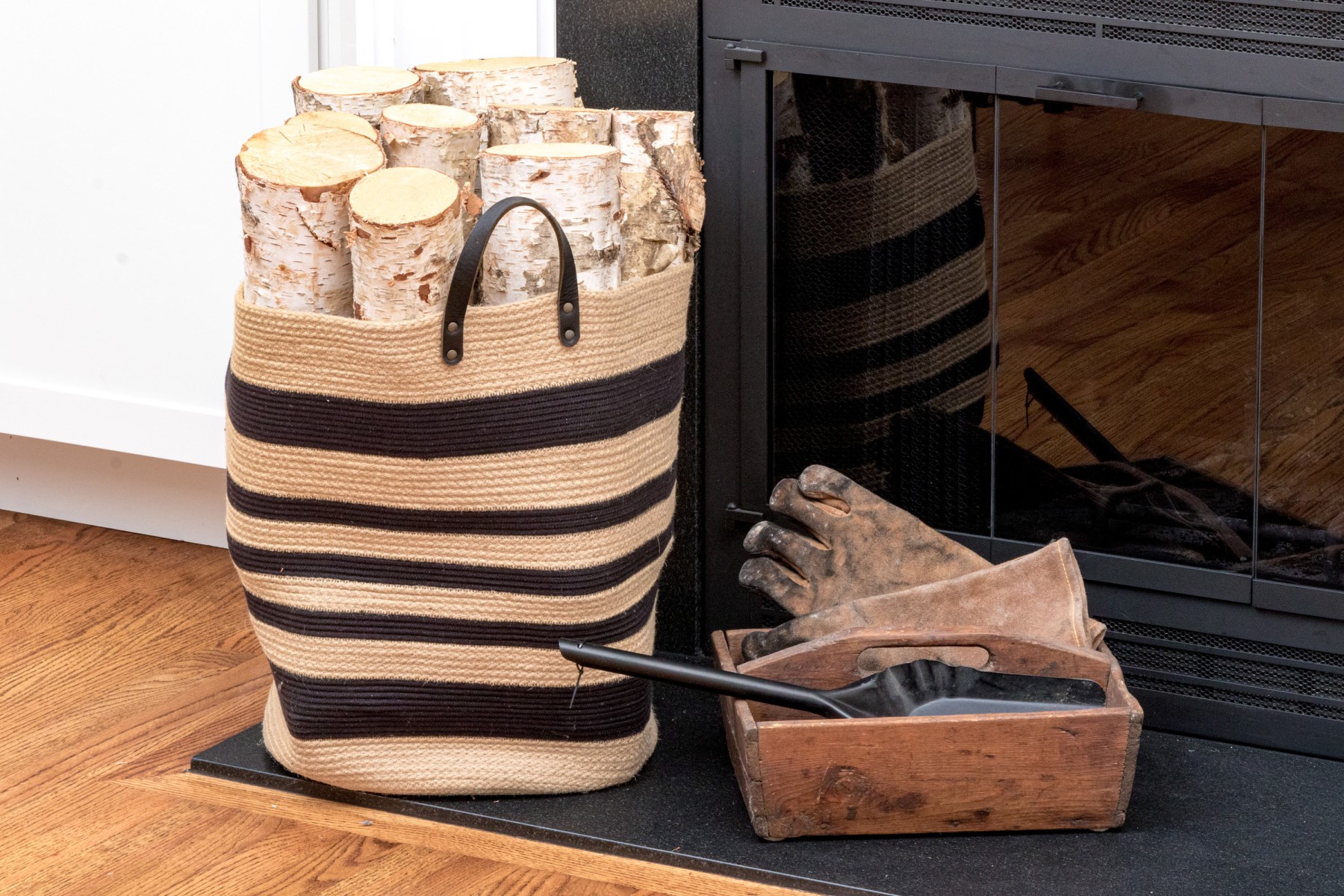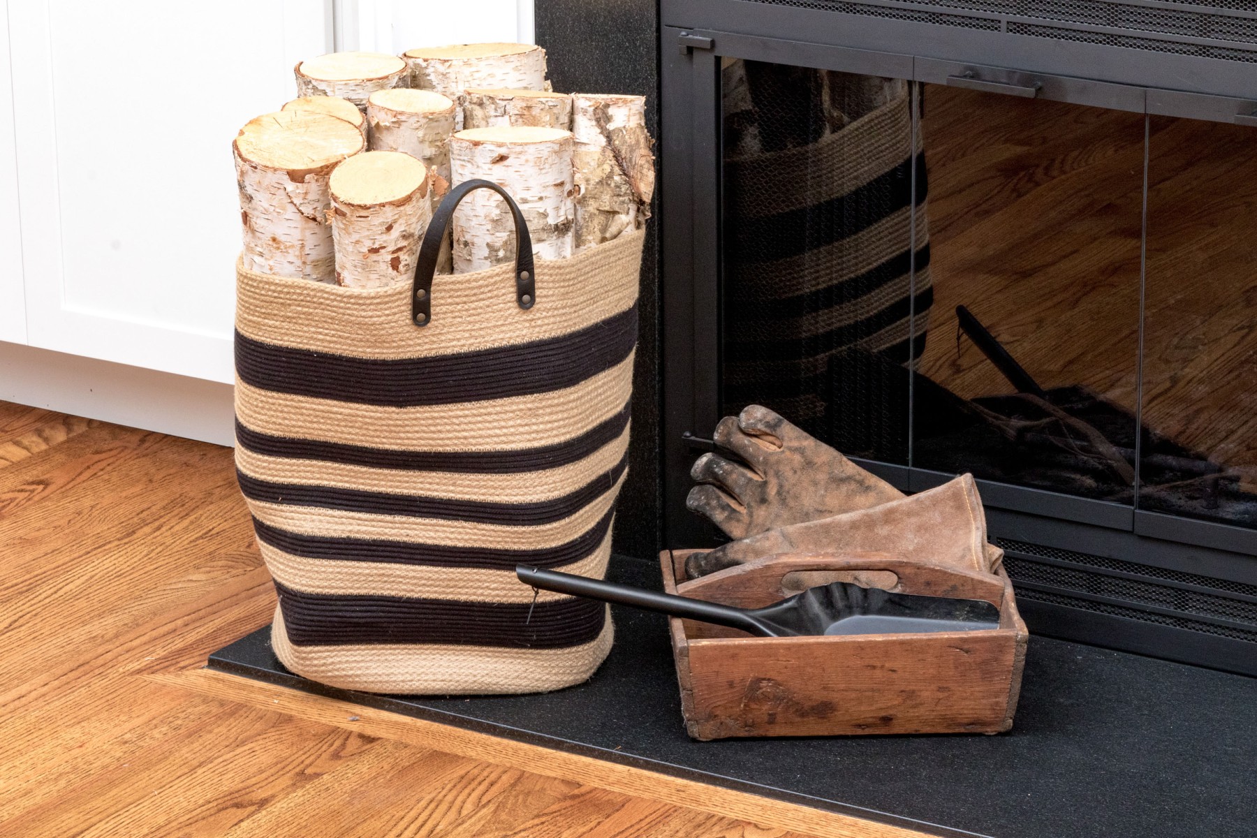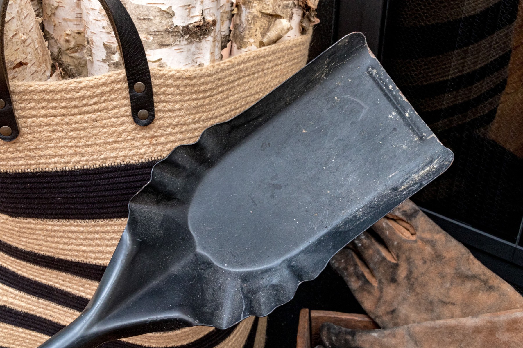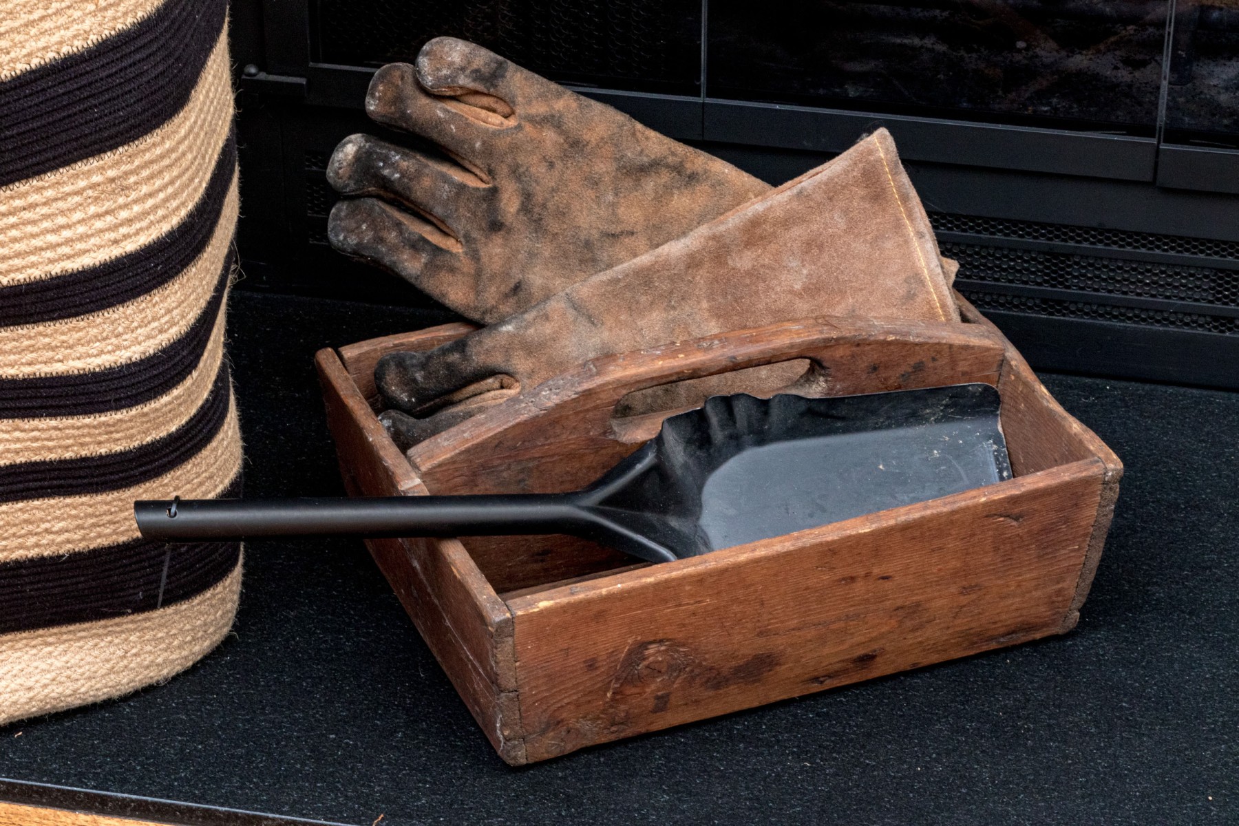A wonderful assortment of fireplace decorations including a two-handled woven basket filled with birch branches, accompanied by a rustic wood tray along with a pair of well-loved suede work gloves and a metal ash/coal shovel.