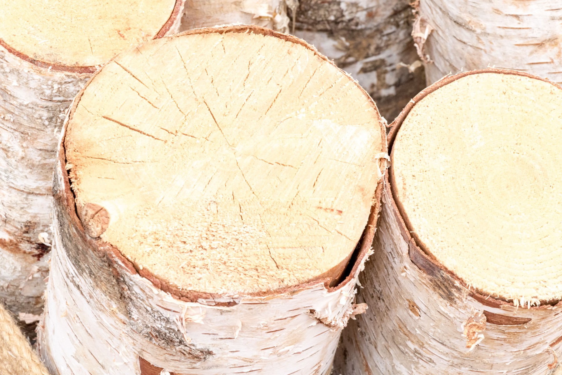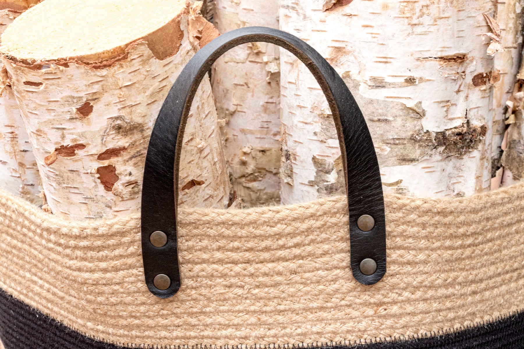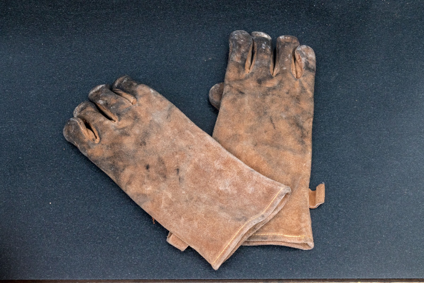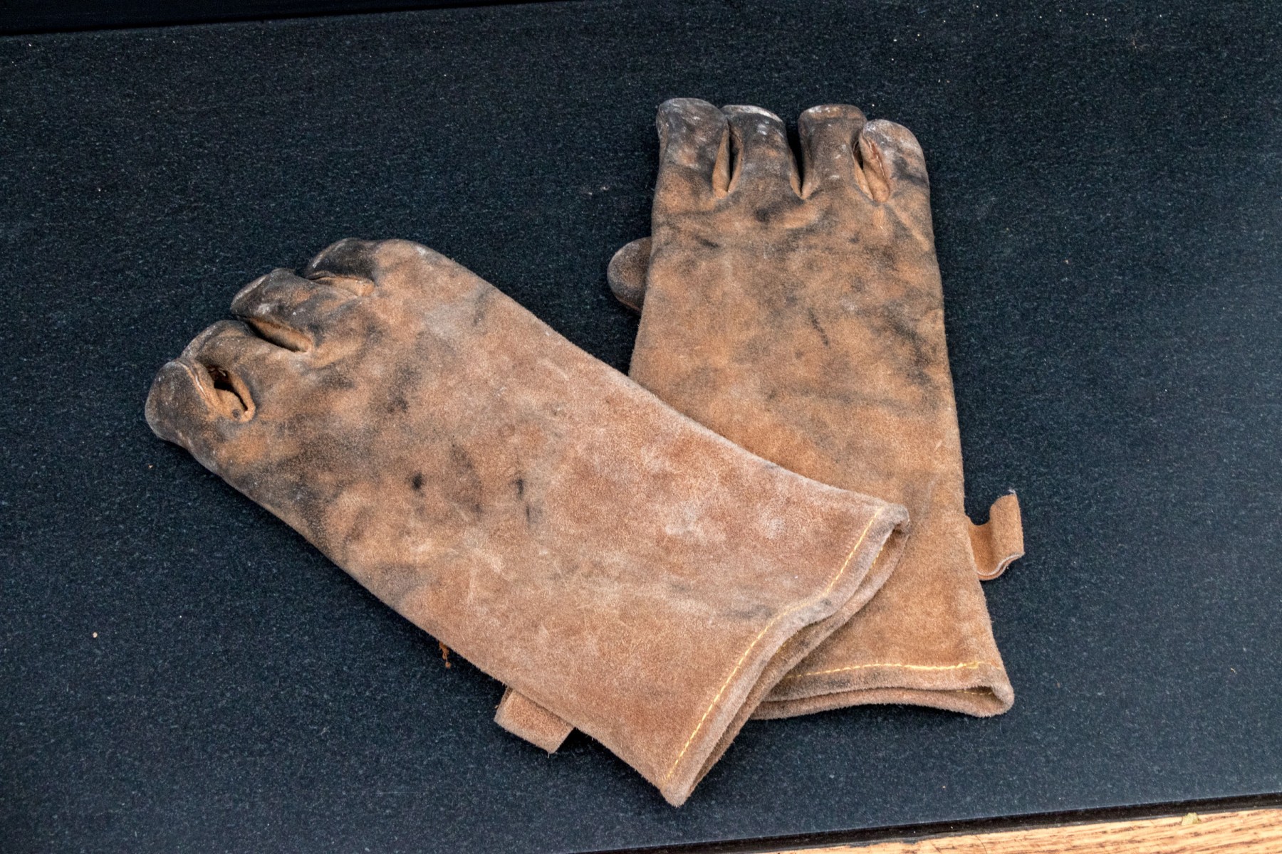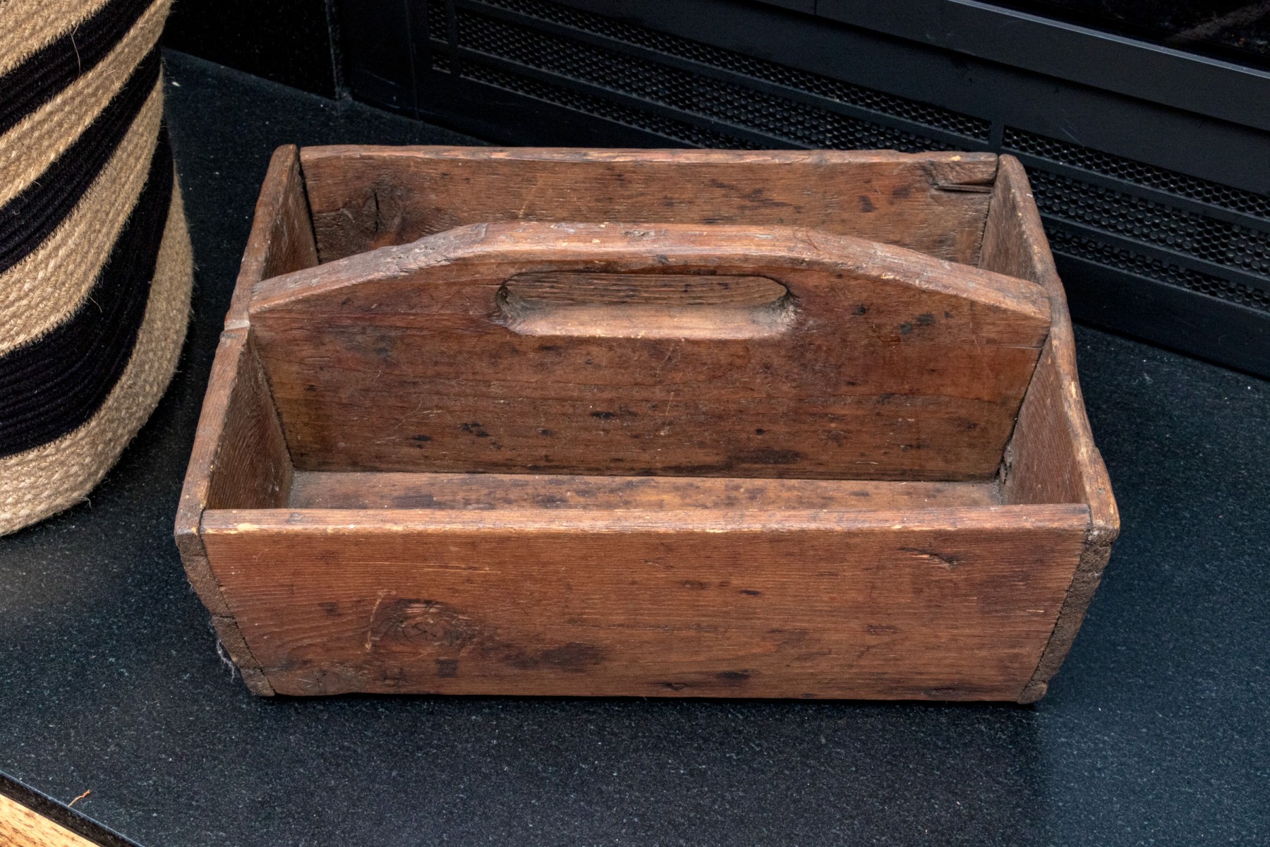 A wonderful assortment of fireplace decorations including a two-handled woven basket filled with birch branches, accompanied by a rustic wood tray along with a pair of well-loved suede work gloves and a metal ash/coal shovel.