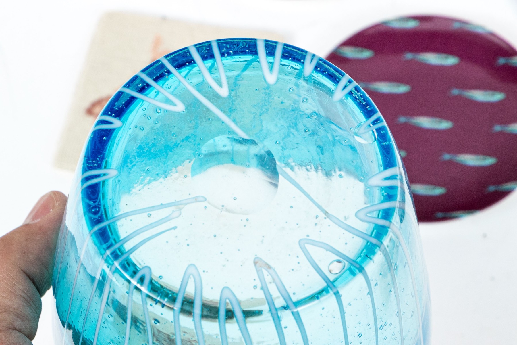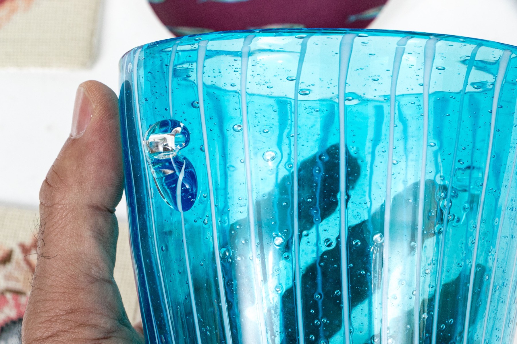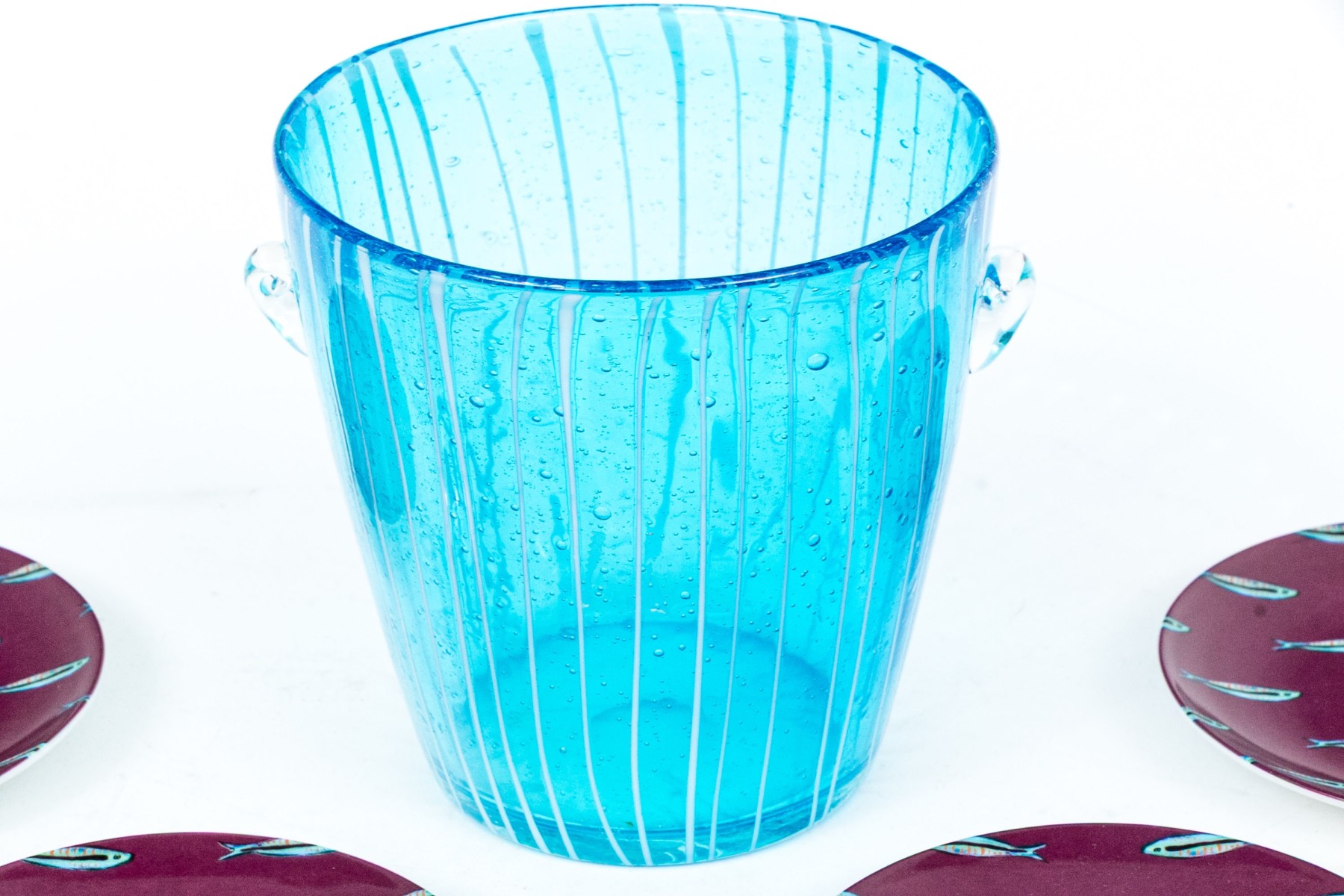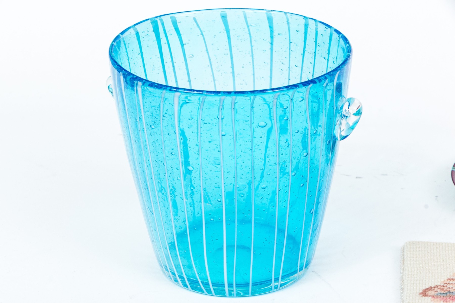 - A blown glass ice bucket, in blue ground with white vertical banding and two small moulded handles.