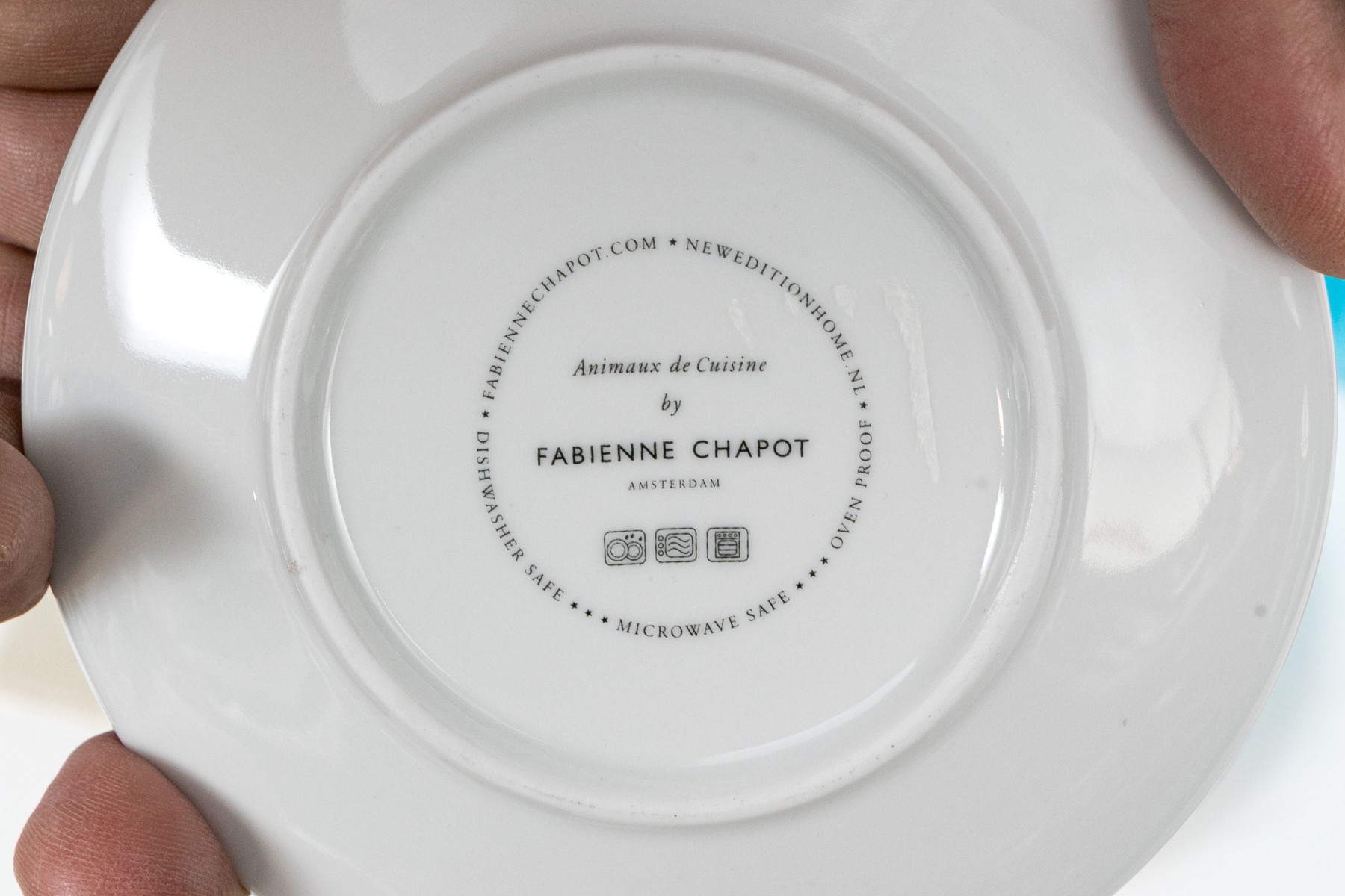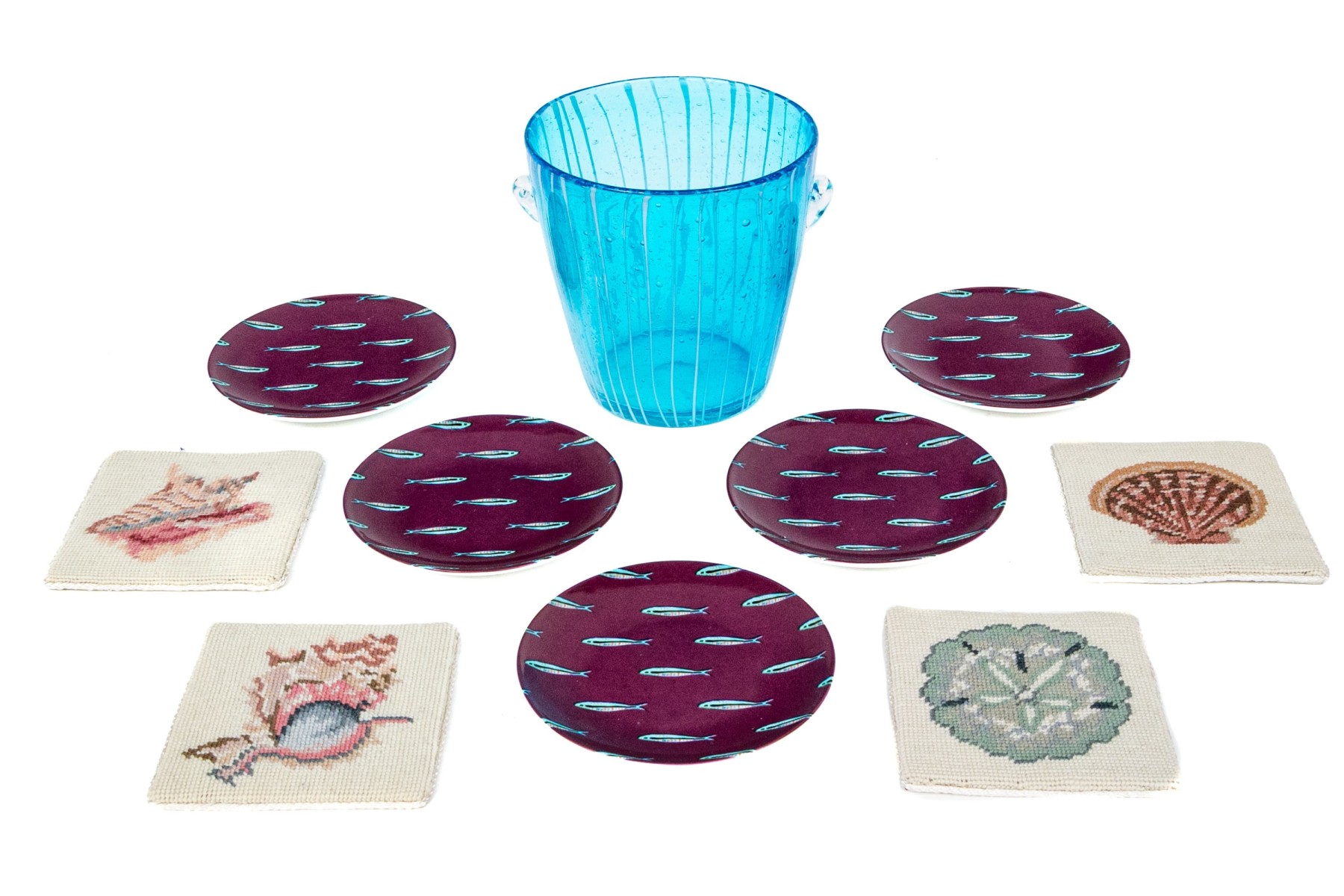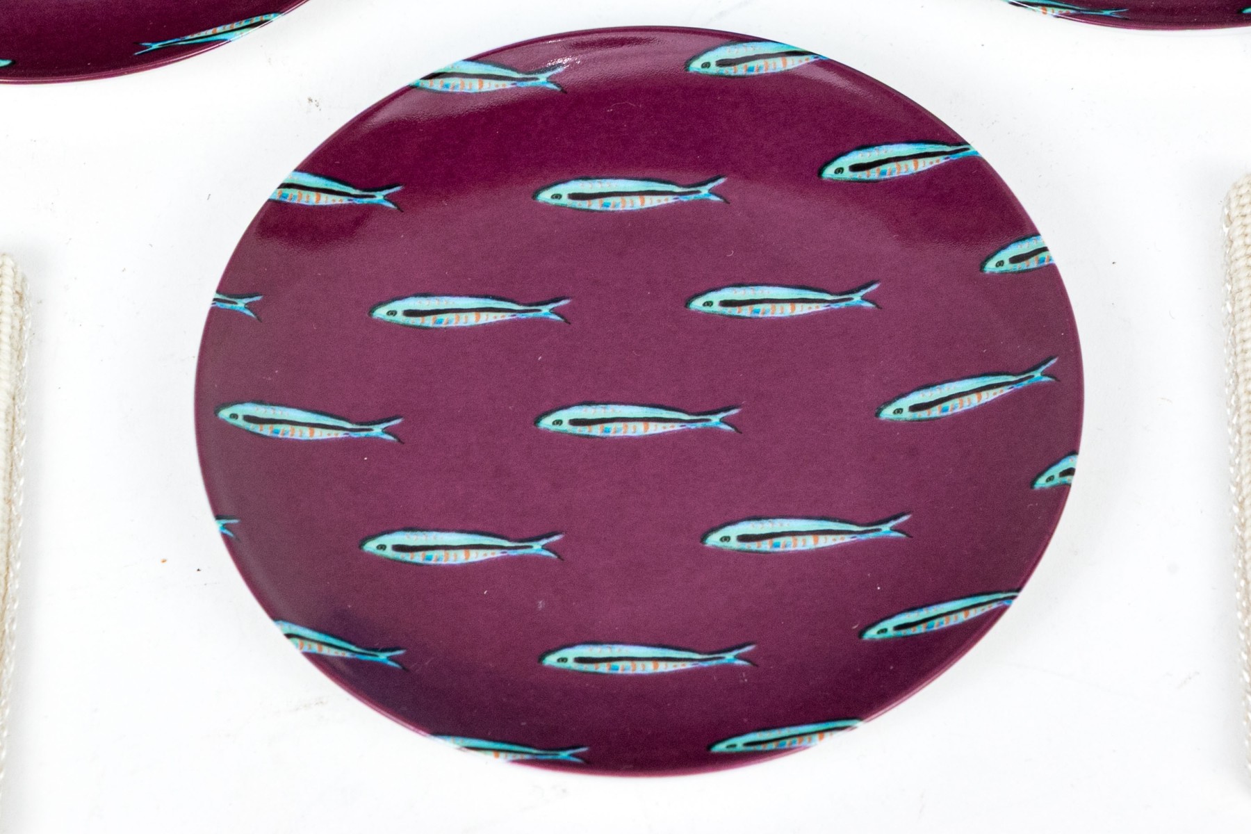 - Five Animaux de Cuisine by Fabienne Chapot, Amsterdam, ceramic saucer plates, with fish decoration on purple hued ground. Marked underfoot.