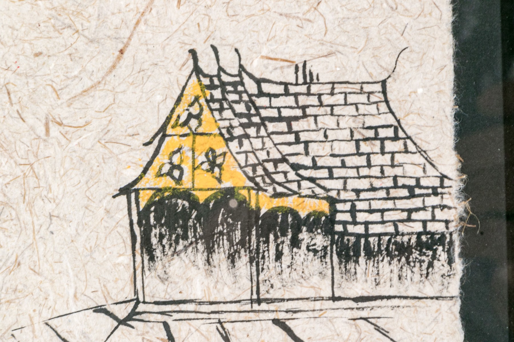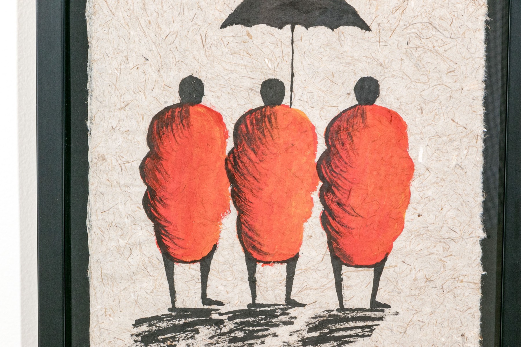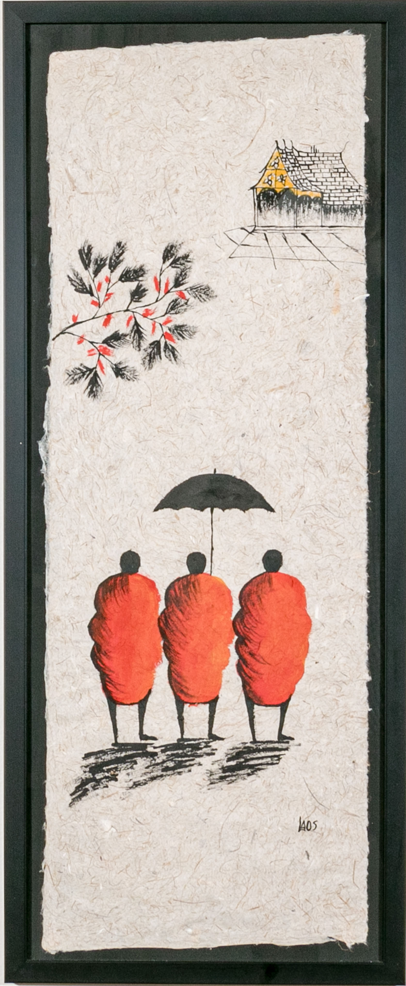 The paper made on handmade mulberry paper in the traditional style of Laos depicts a group of three figures wearing traditional red robes, one figure with an umbrella with a flowering tree branch and architecture in the distance.