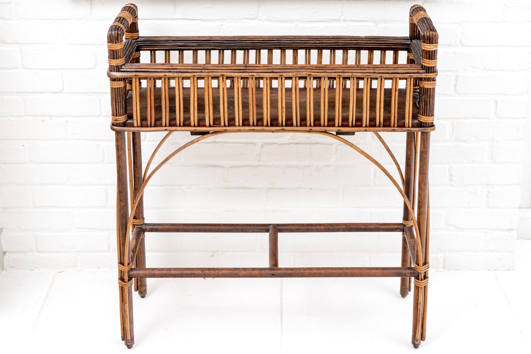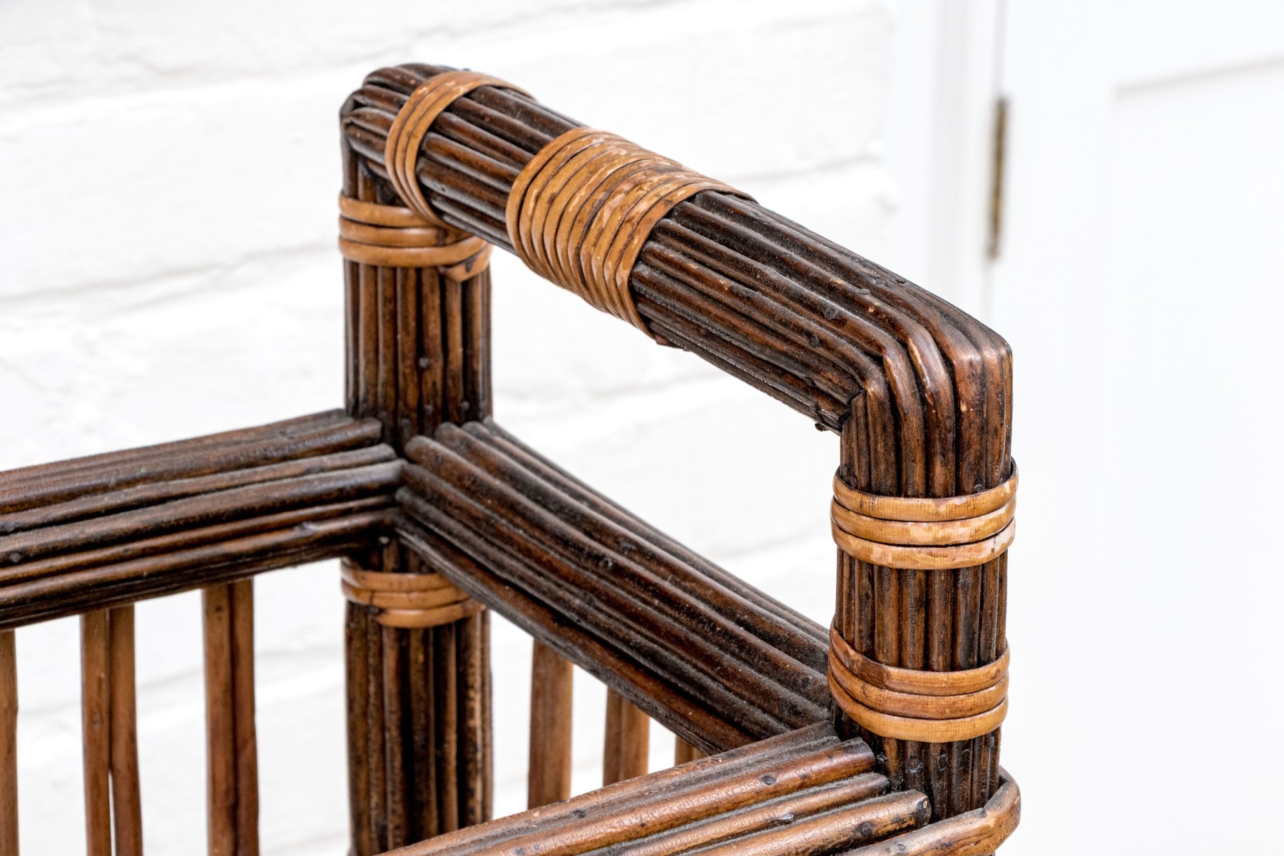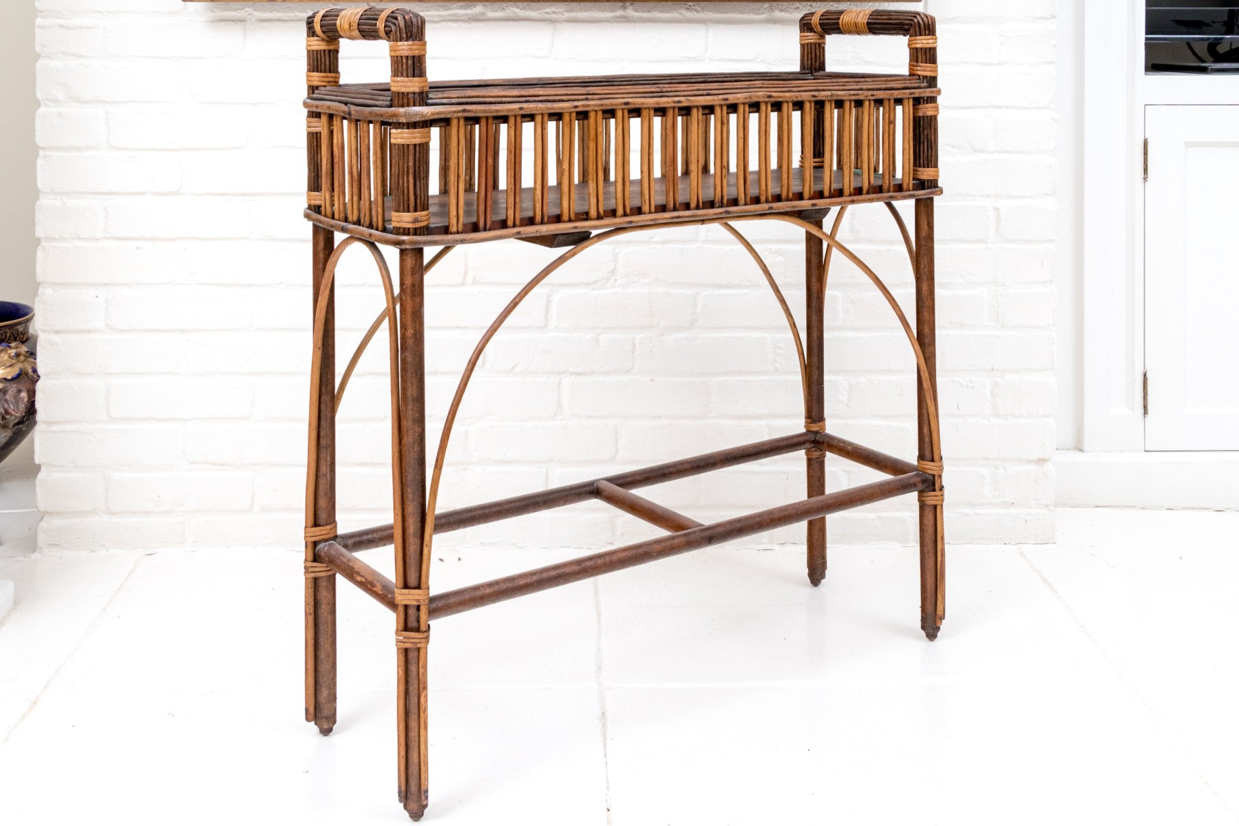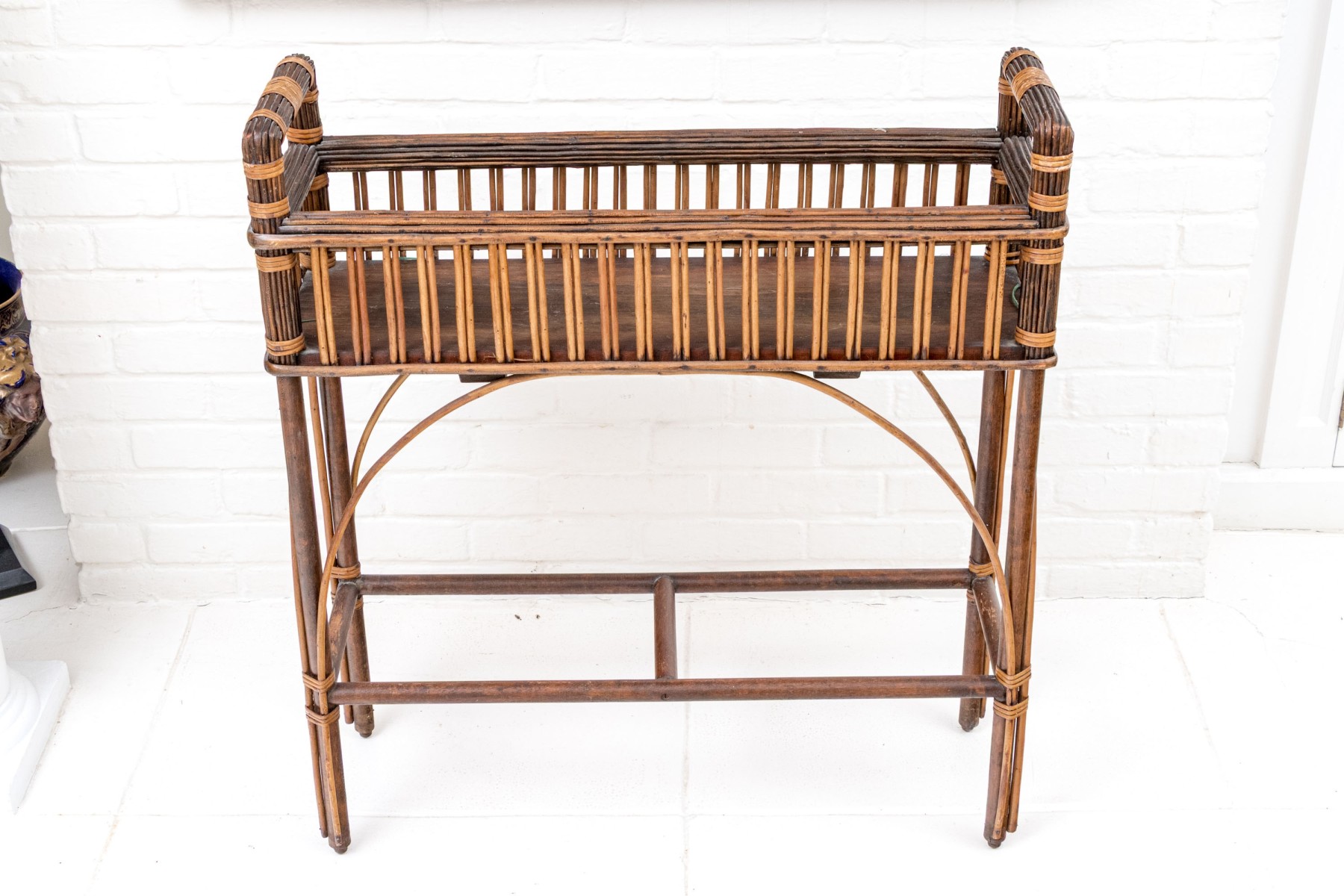 A lovely mid-century rattan planter stand featuring reeded and wrapped borders, tall twin handle at the sides, and double rail galleries around the rectangular planter top supported by dowel legs with a box stretcher.