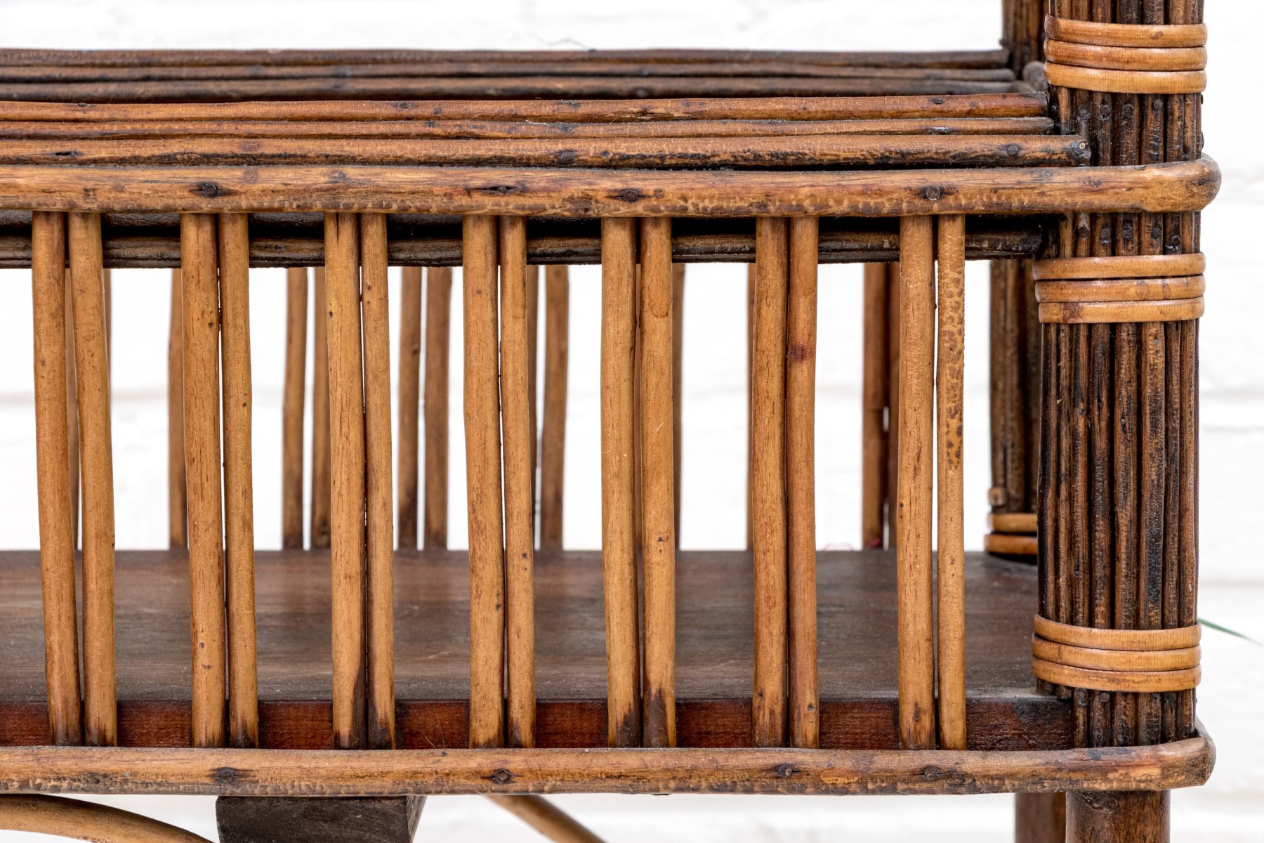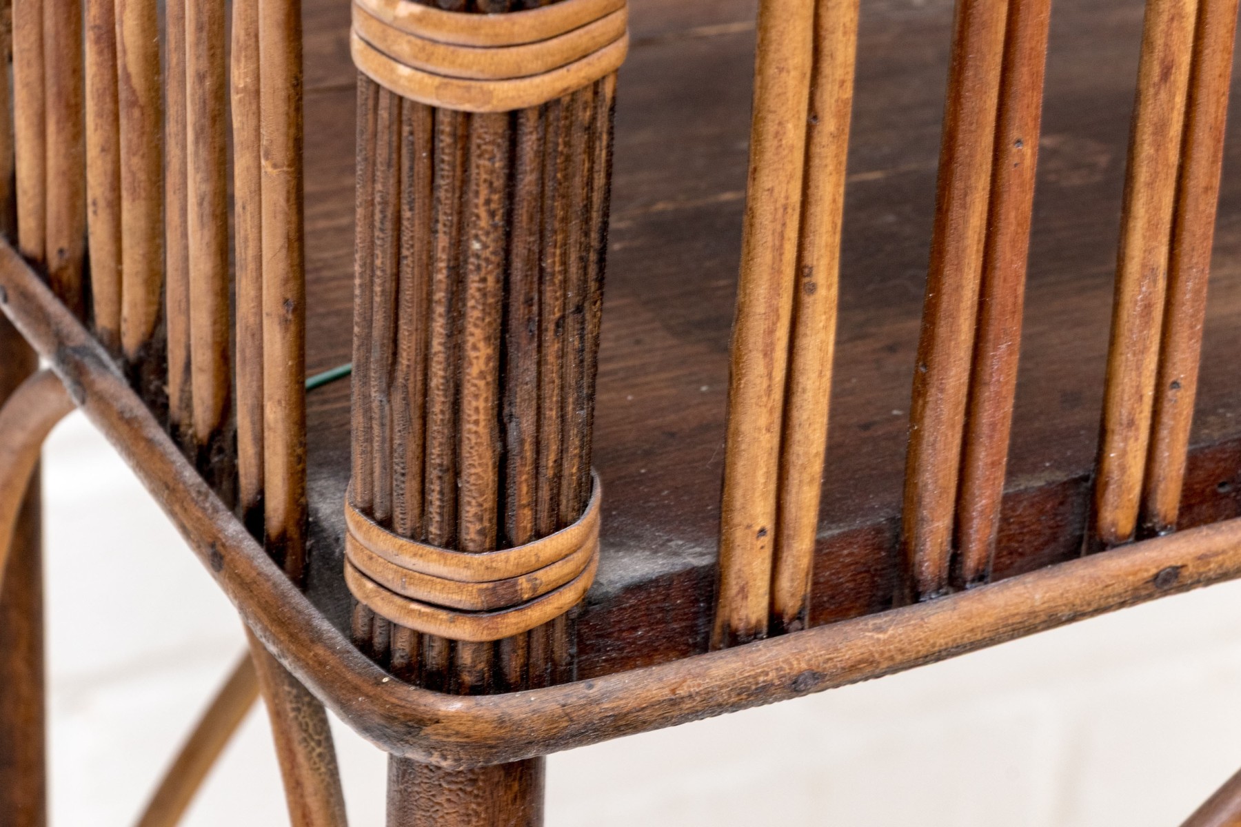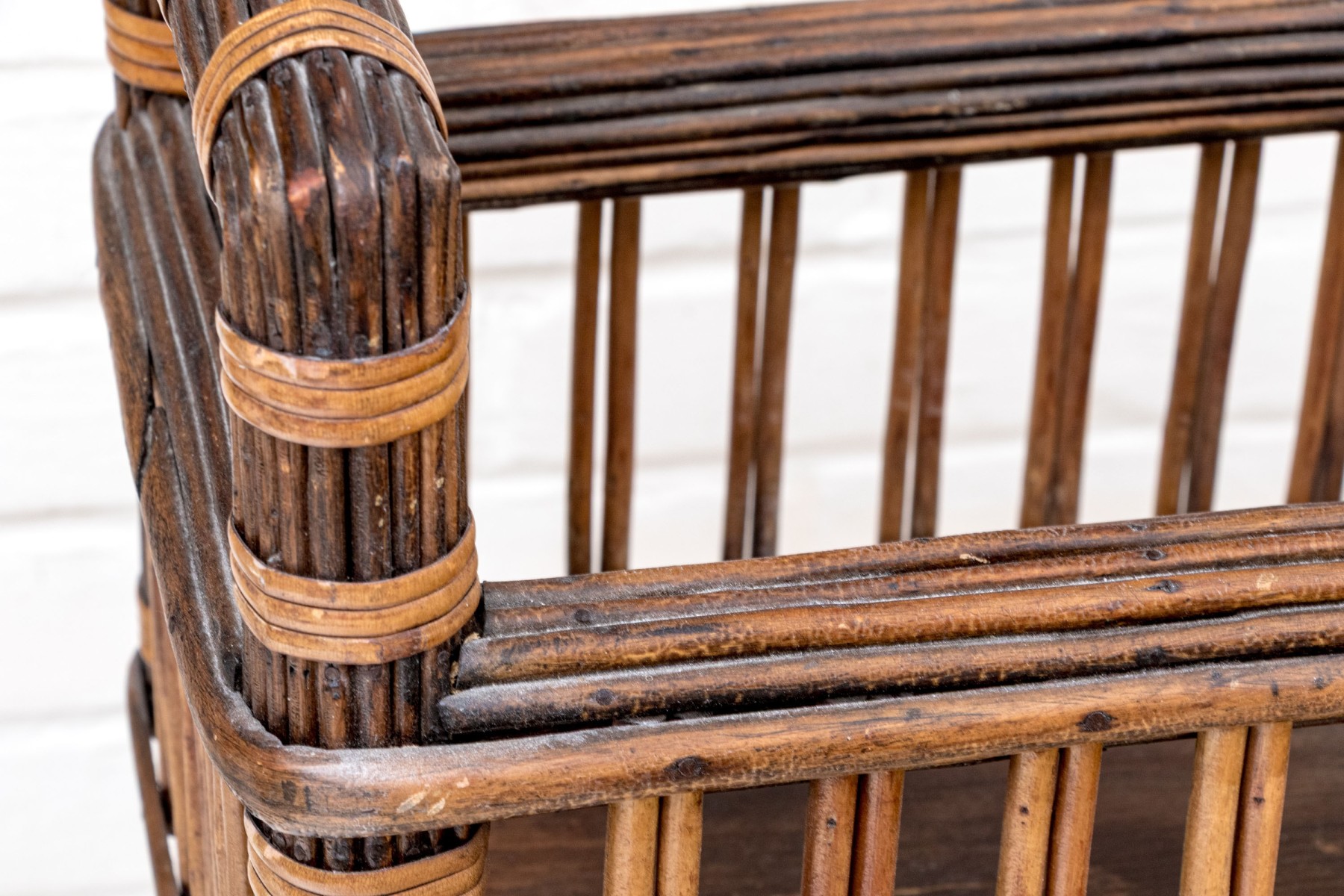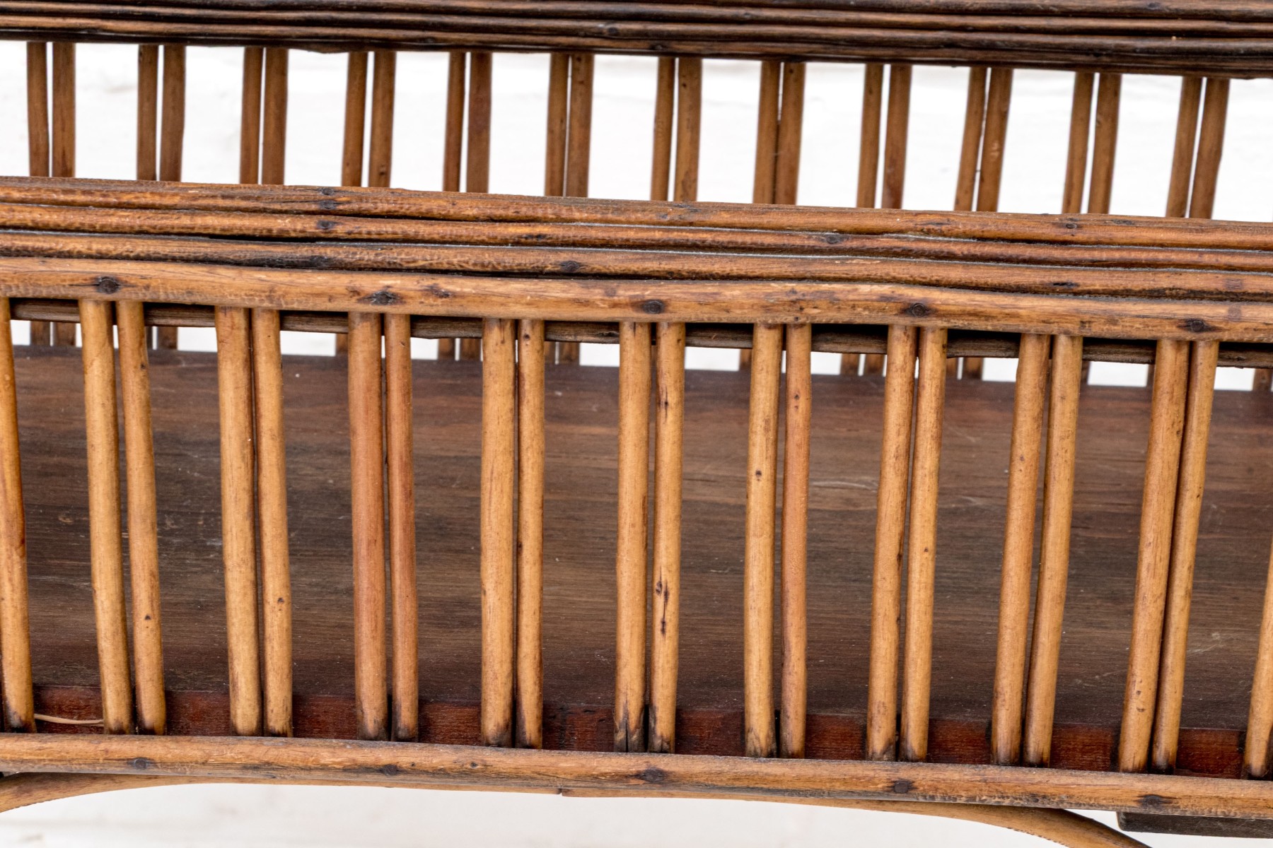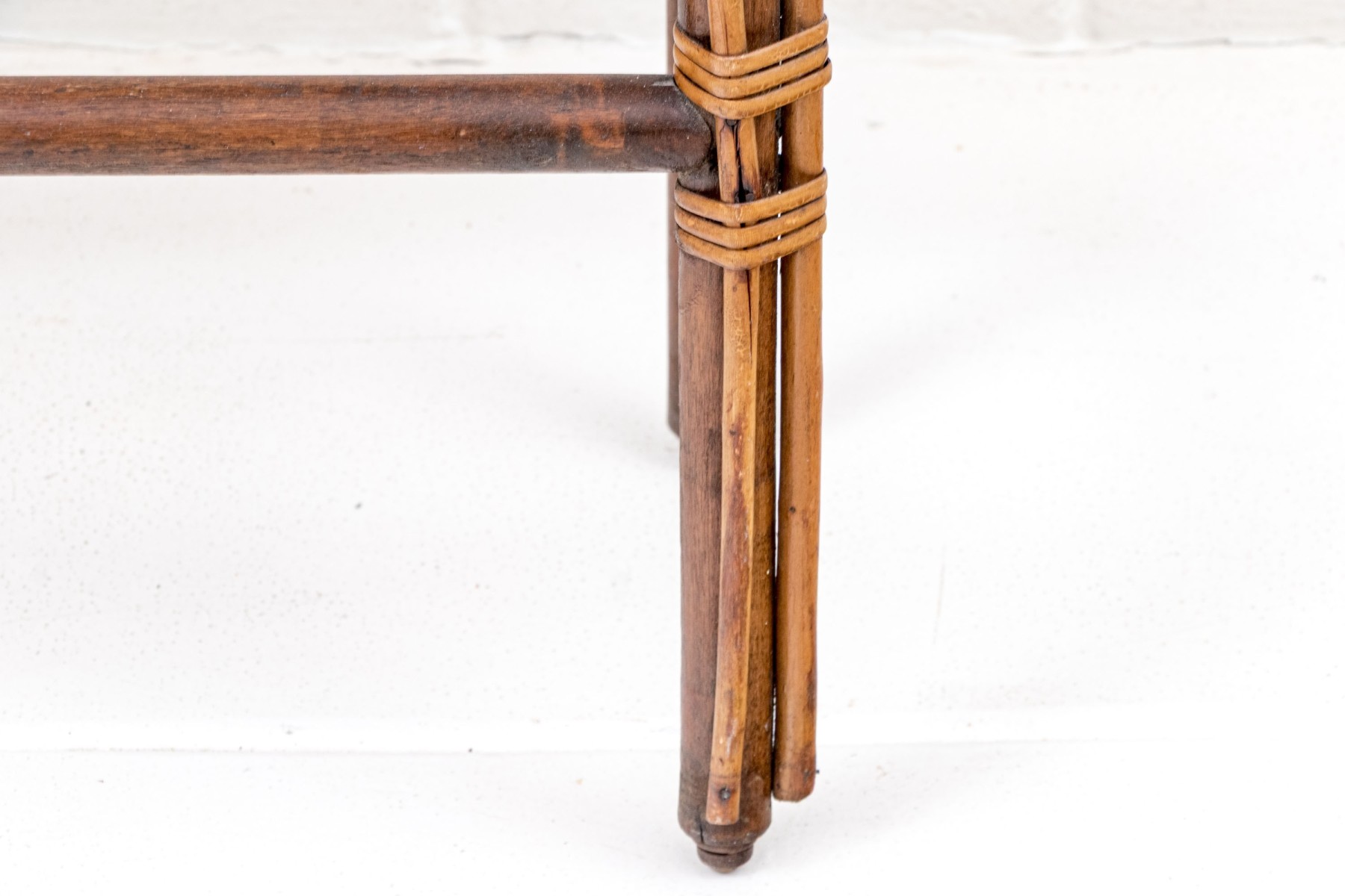 A lovely mid-century rattan planter stand featuring reeded and wrapped borders, tall twin handle at the sides, and double rail galleries around the rectangular planter top supported by dowel legs with a box stretcher.