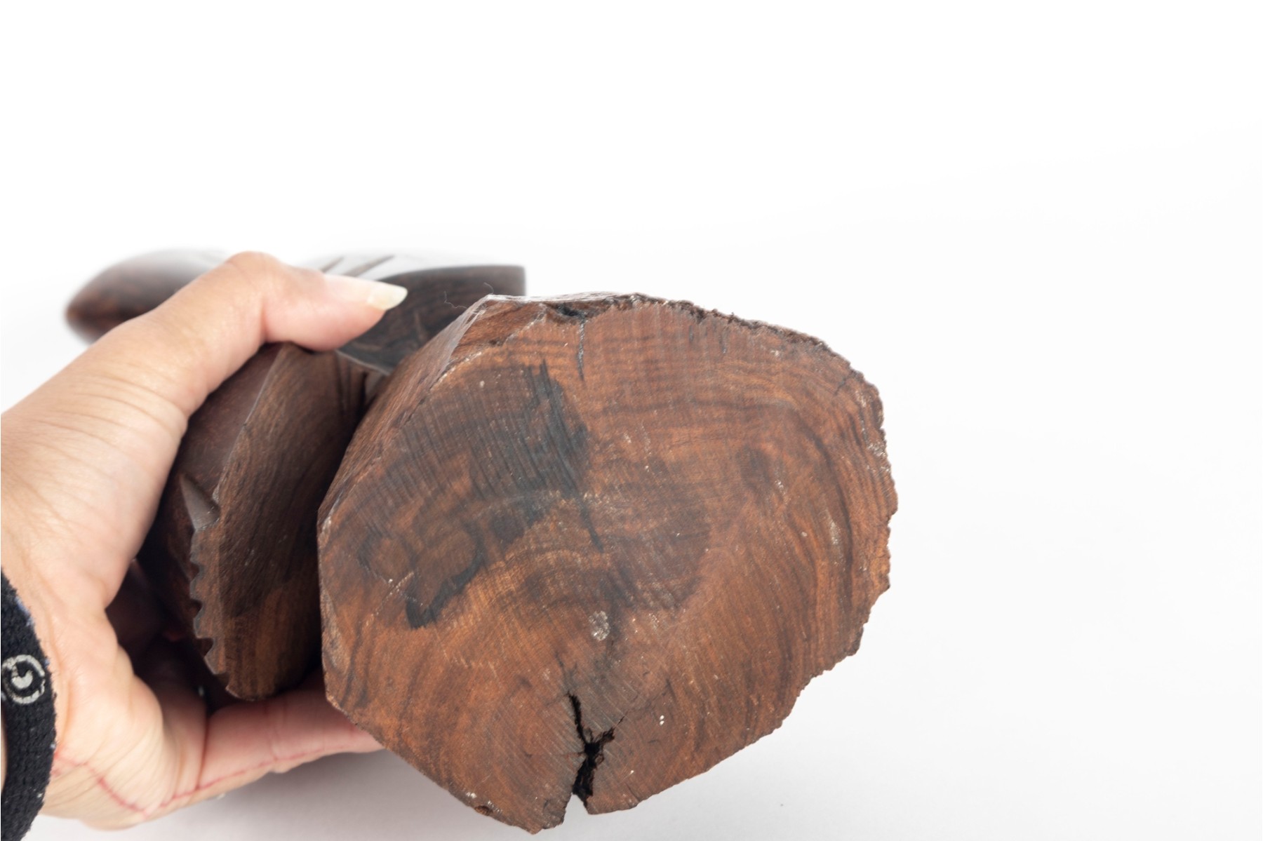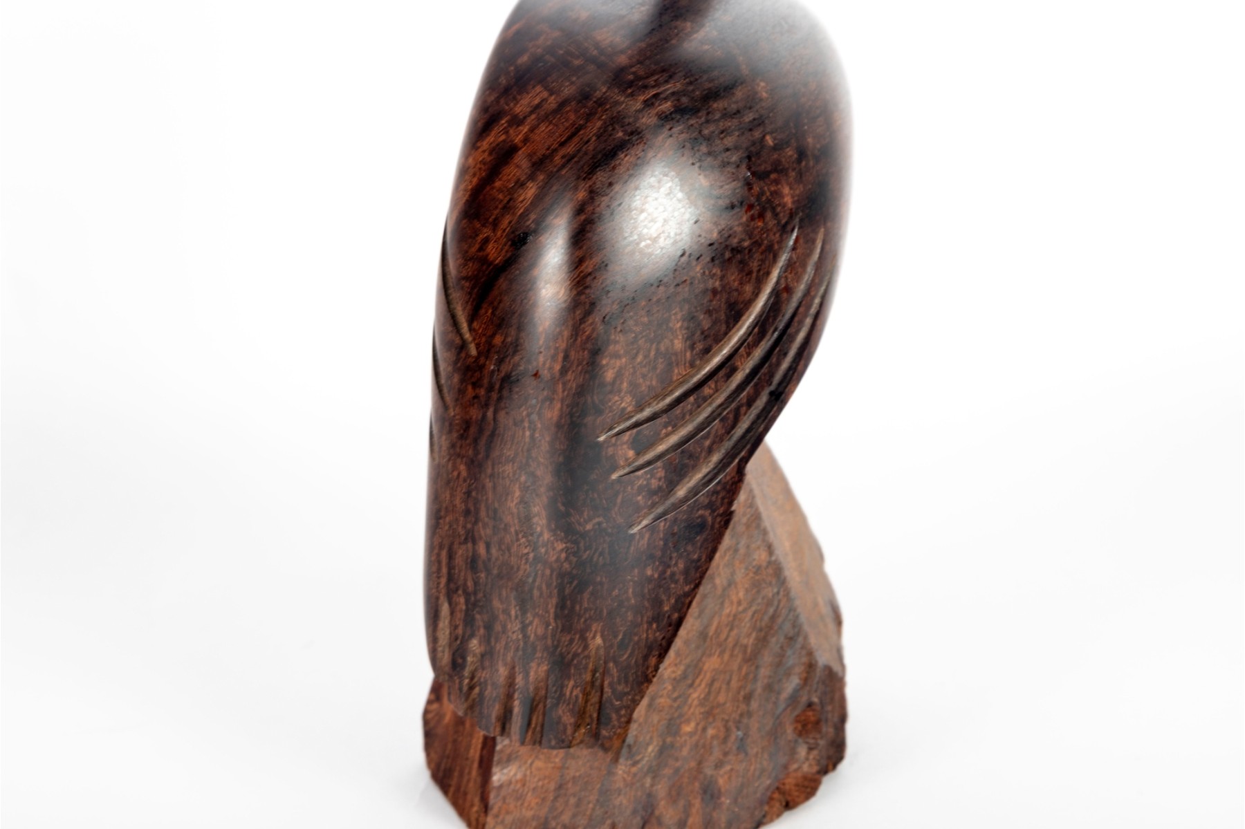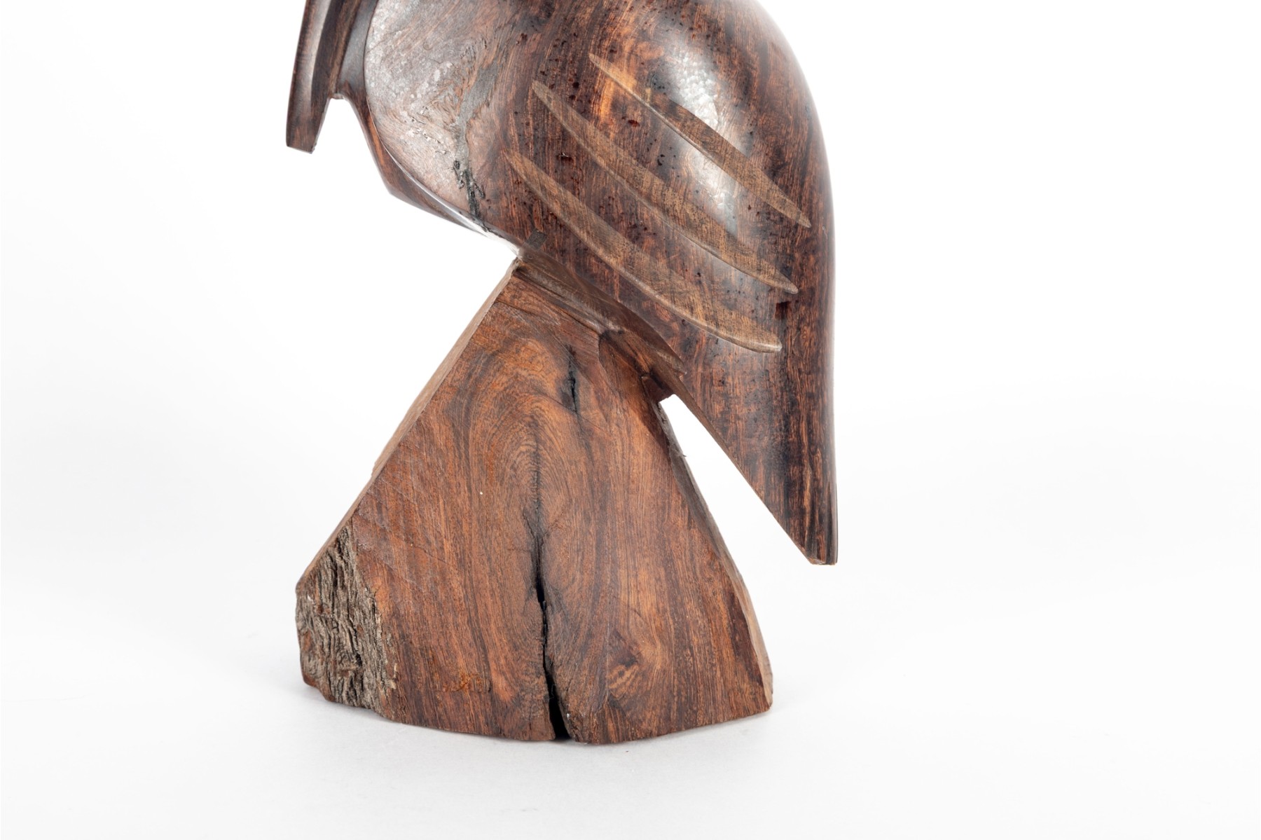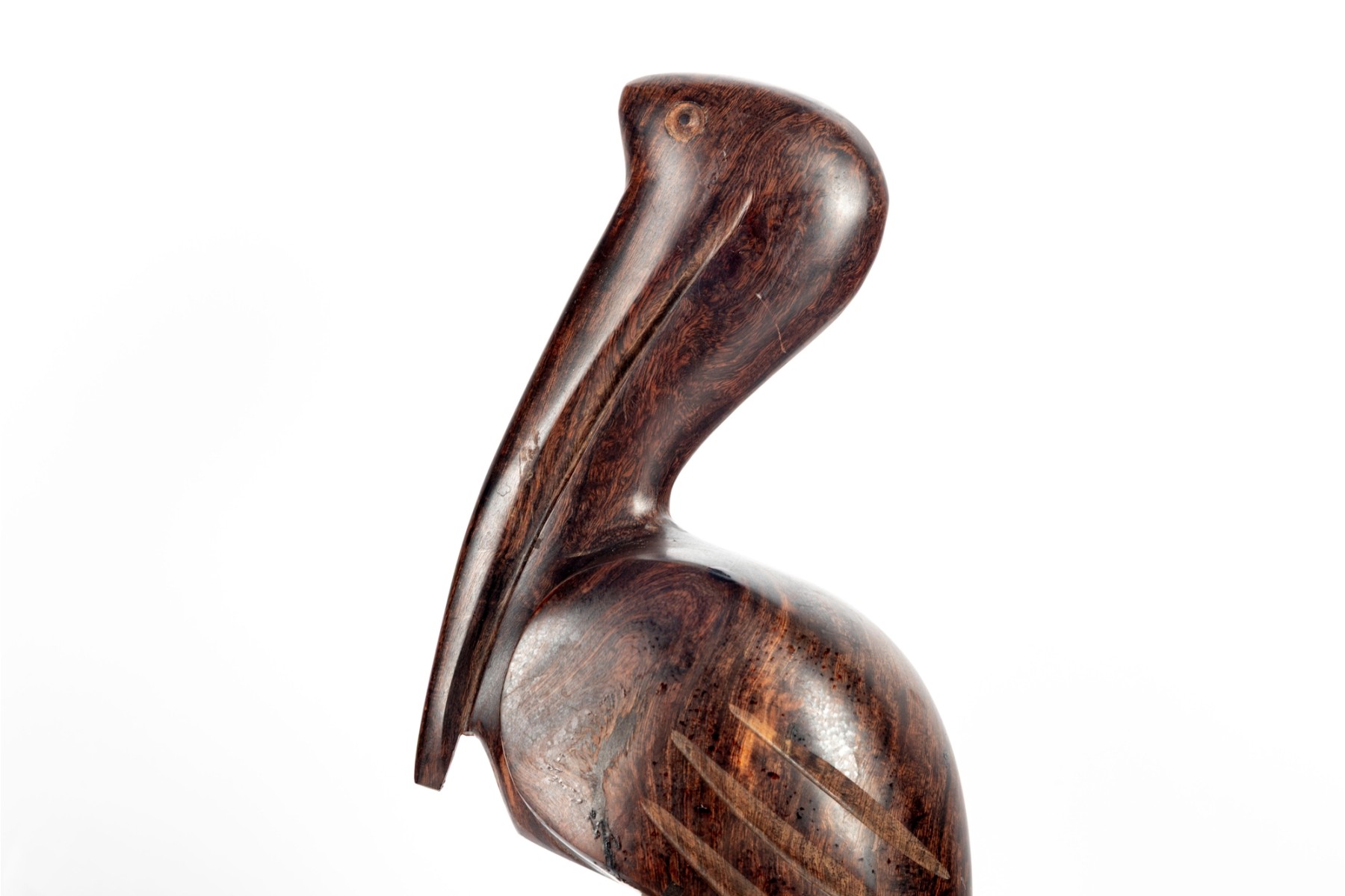 A poised sculpture of a pelican crafted and carved from wood with an exquisite grain. The base is left primitively cut, adding to its hand-crafted charm.