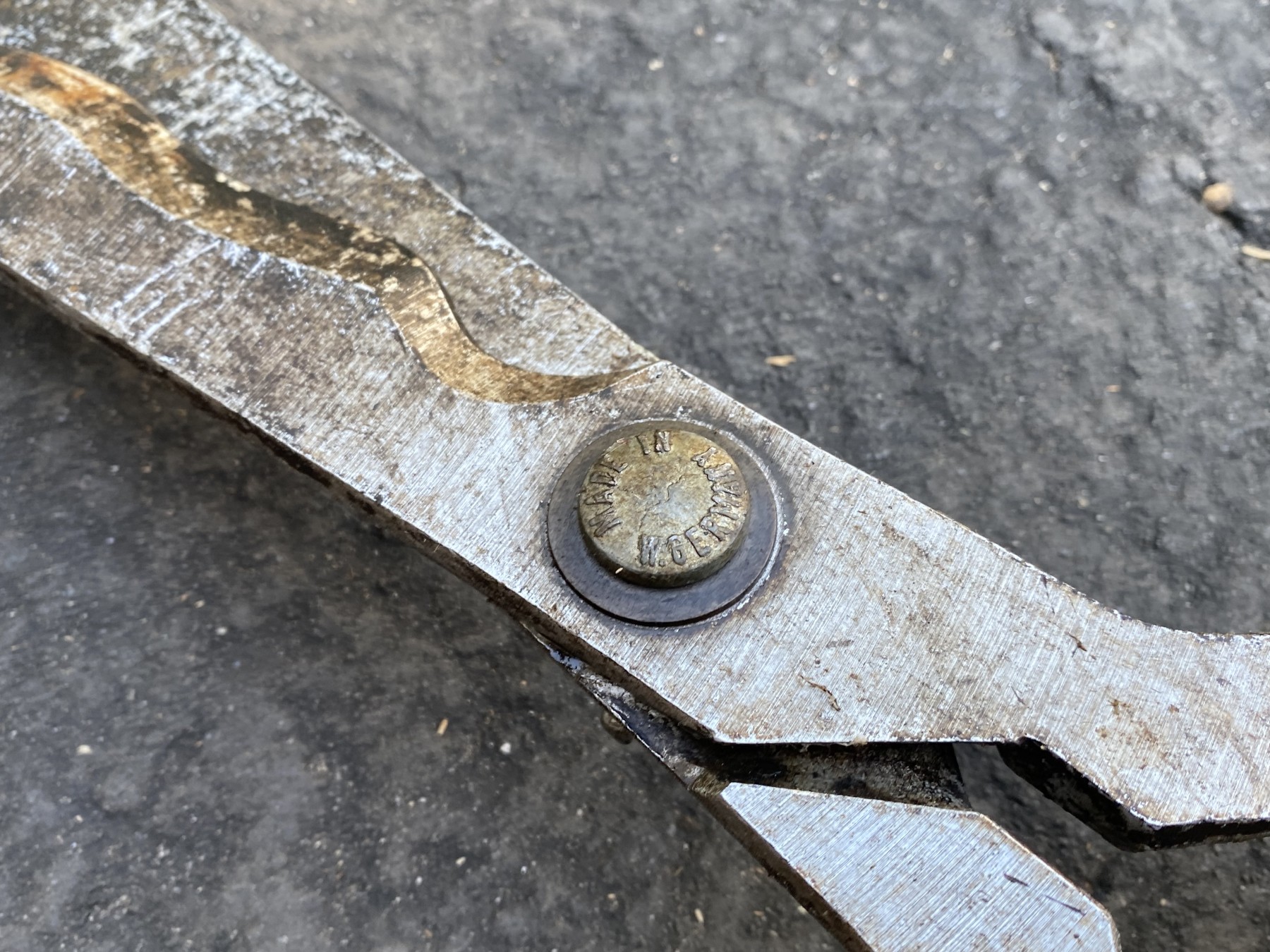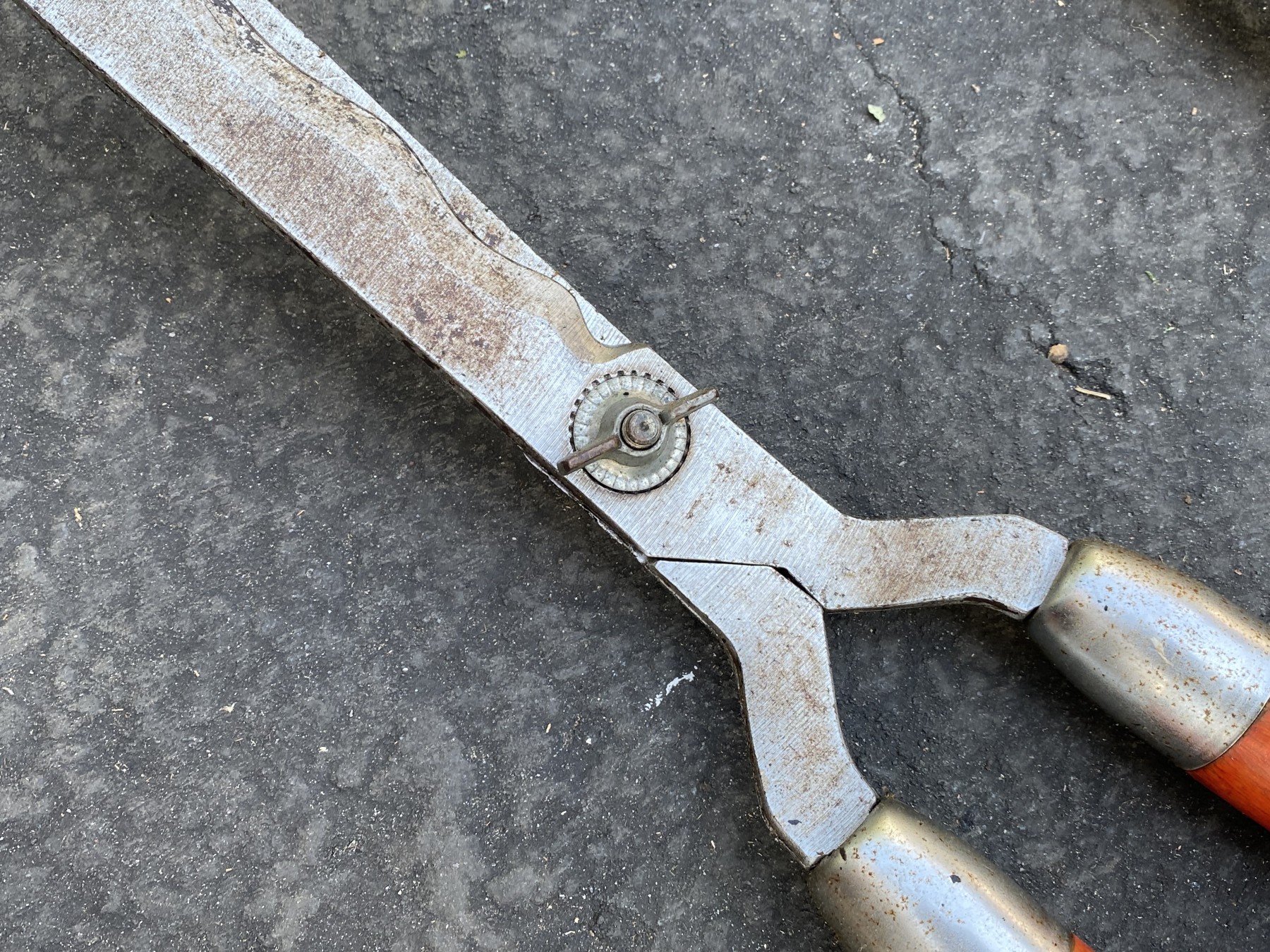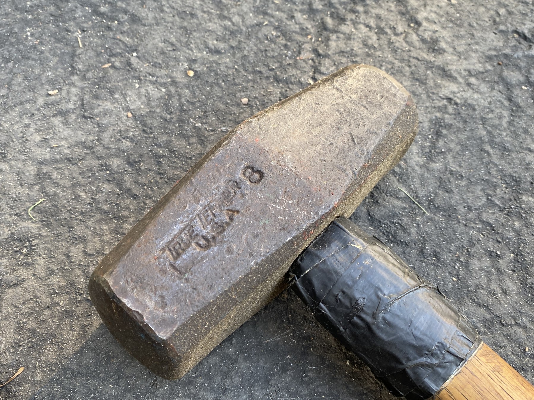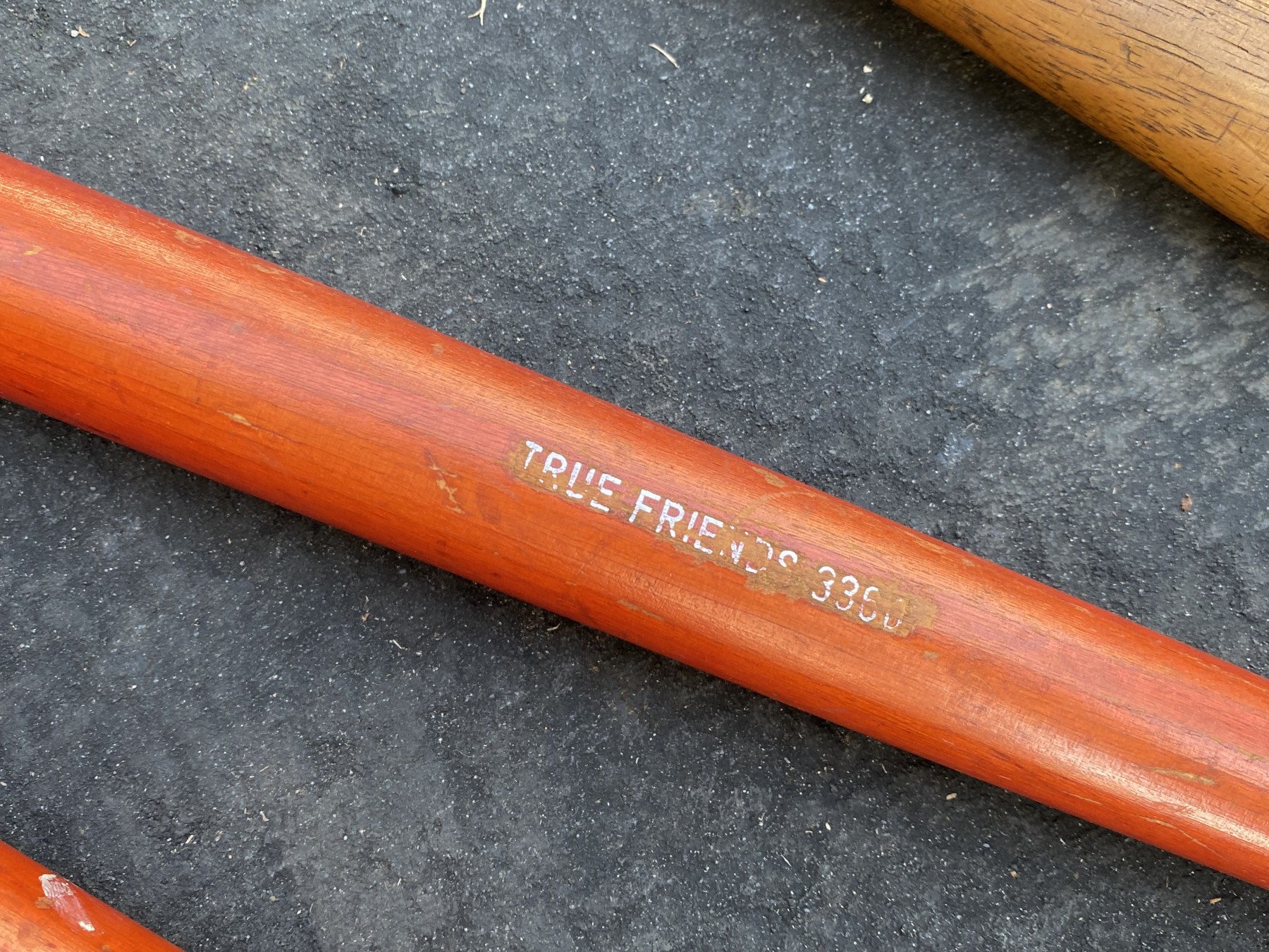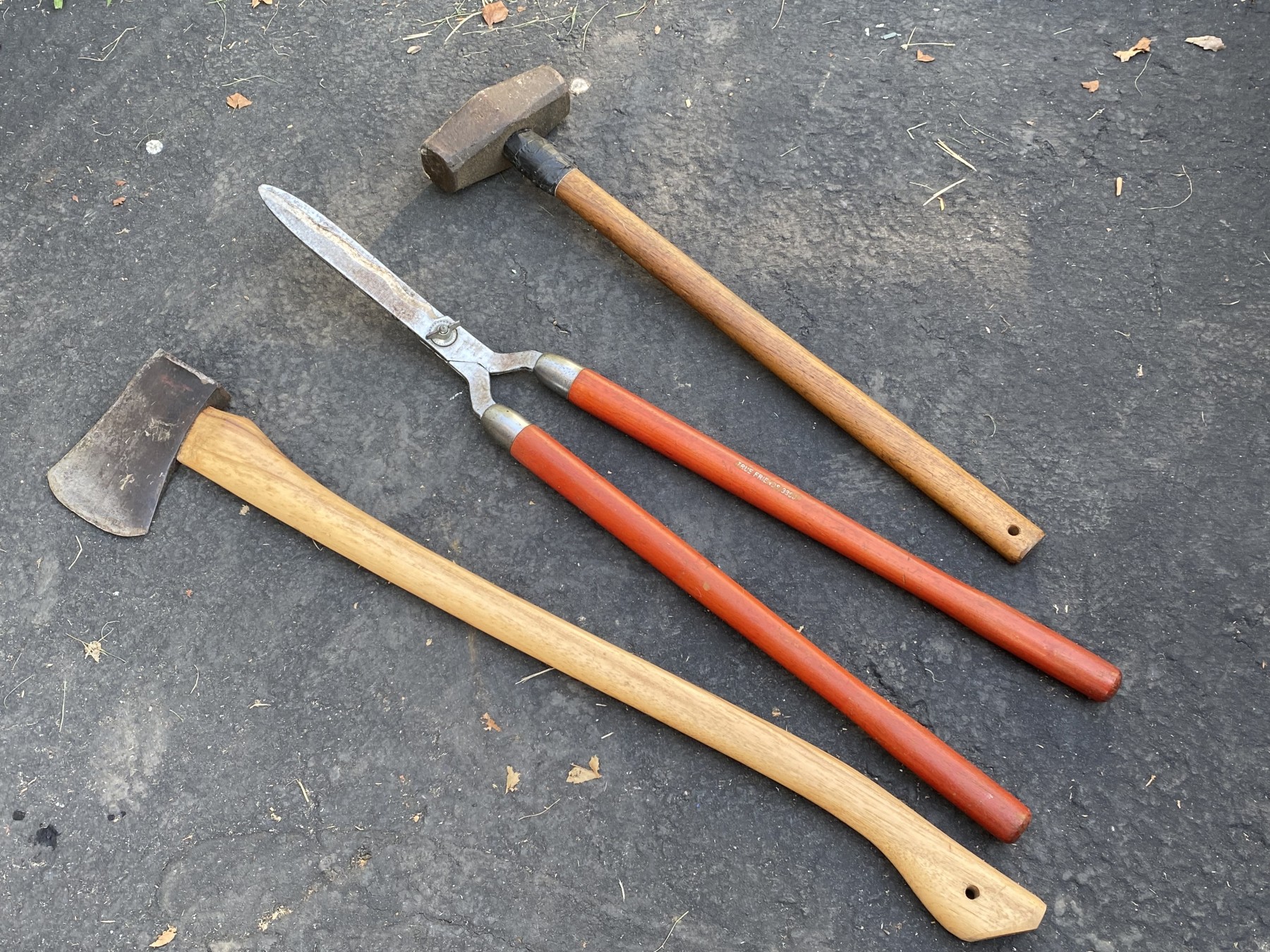 A handy trio of wood handled tools including an Ames True Temper sledge hammer, True Friends 3360 shears, and an axe.