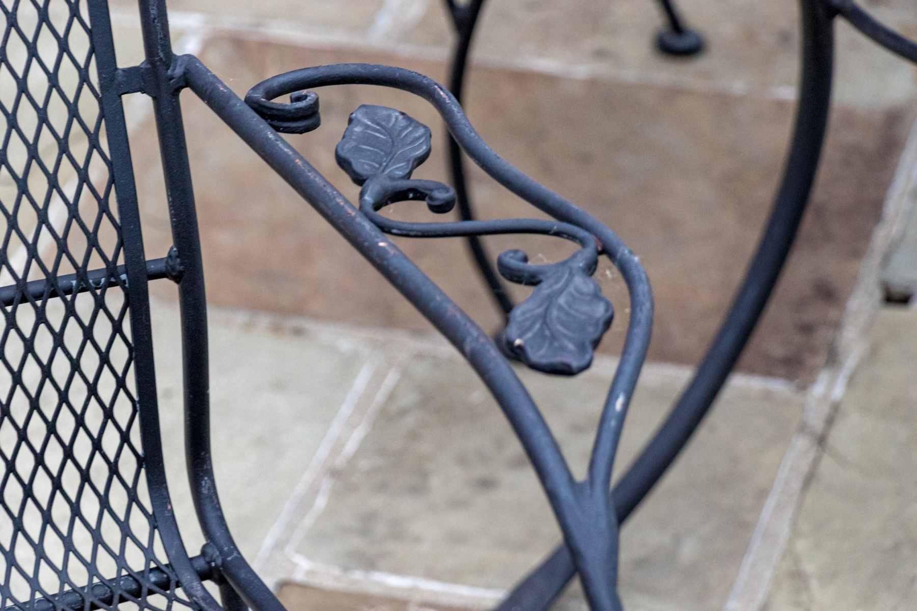 A delightful outdoor dining set in classic Woodard style, including four armchairs with black wrought iron frame showcasing pretty scrolled vine along camelback top rails, leading down wire mesh backs with continuous curve into the seats and finishing with scrolled arms and saber legs. The table follows suit with an oval top and a hole at the center for use with an umbrella, raised on elegantly curved legs with an oval box stretcher for support.
