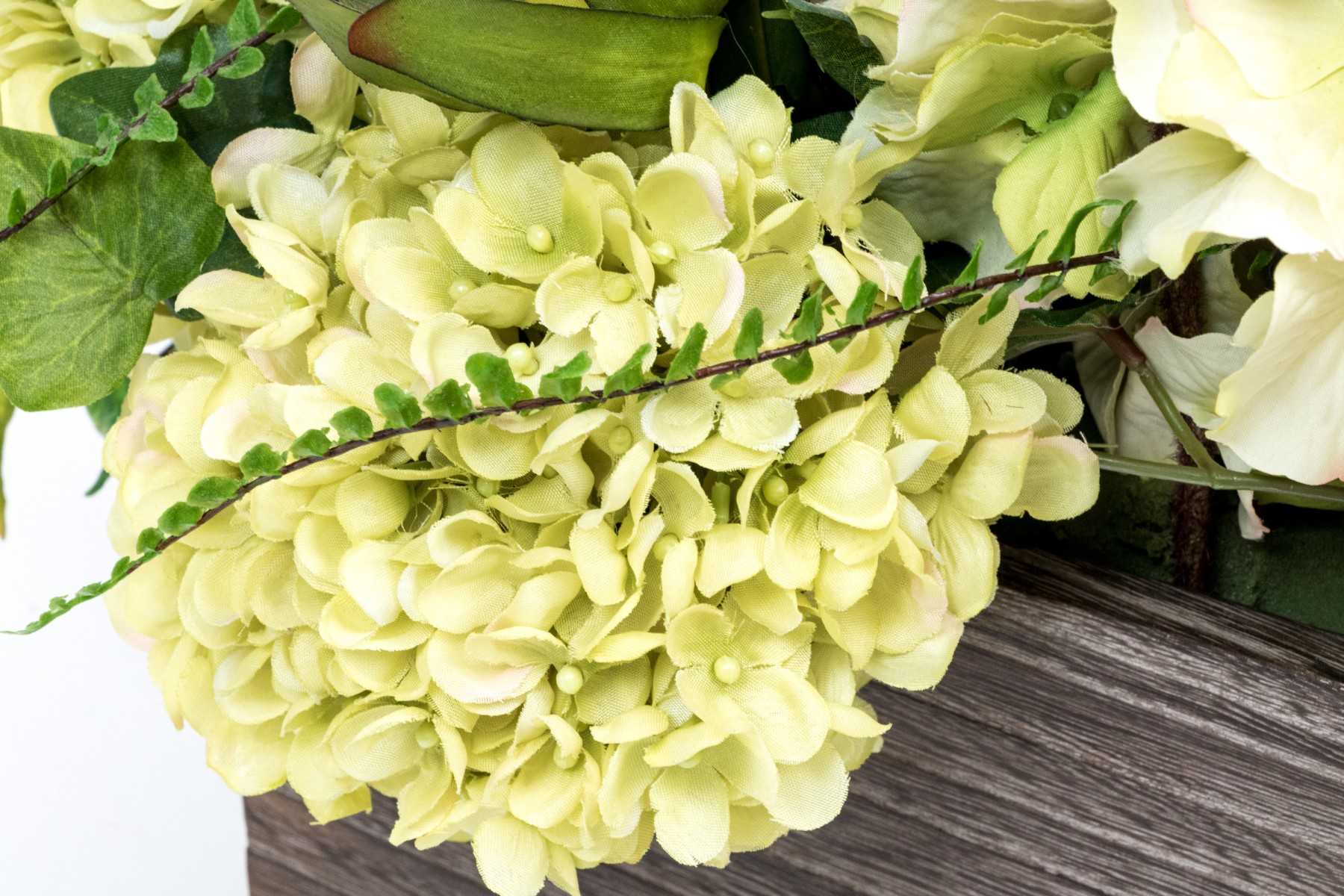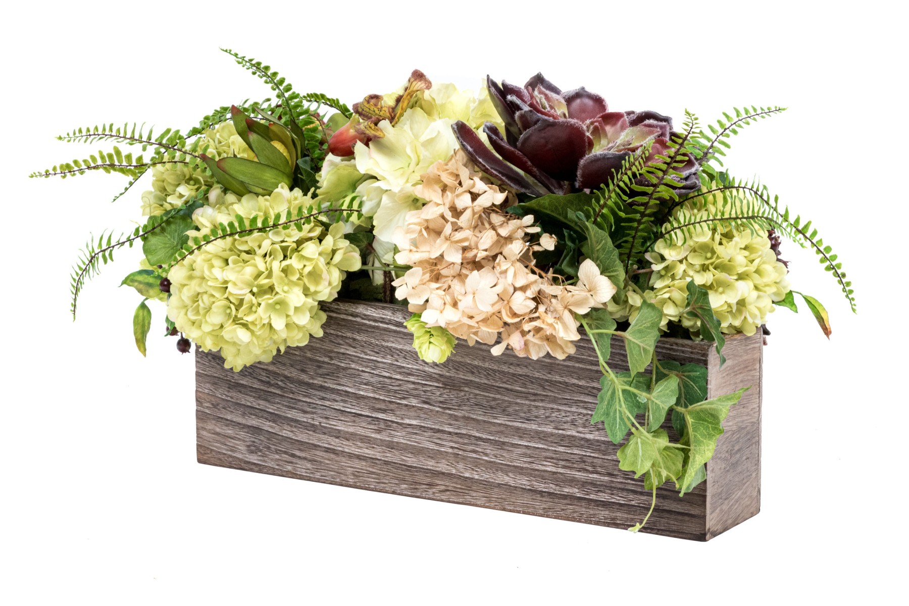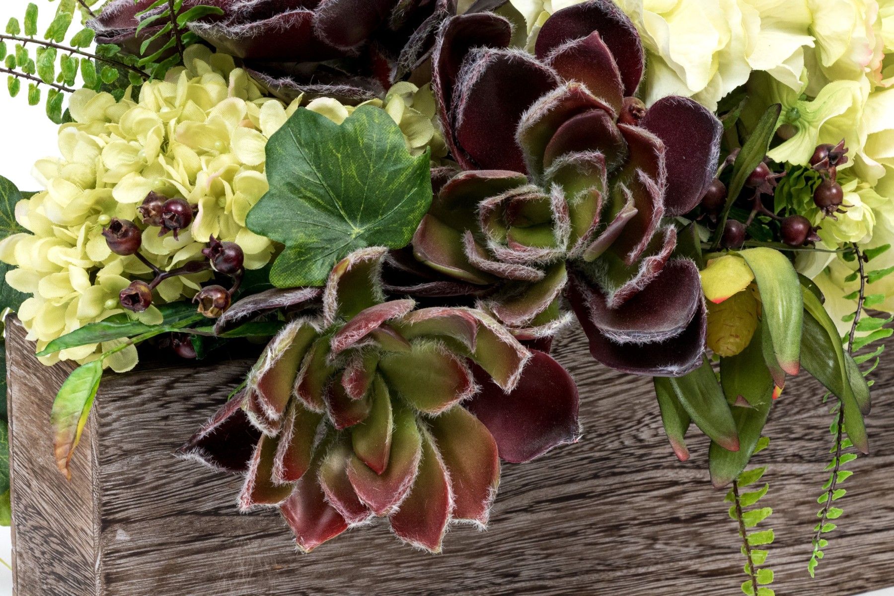 Rectangular wooden planters filled with a variety of faux flowers and foliage including ferns, hydrangeas and succulents.