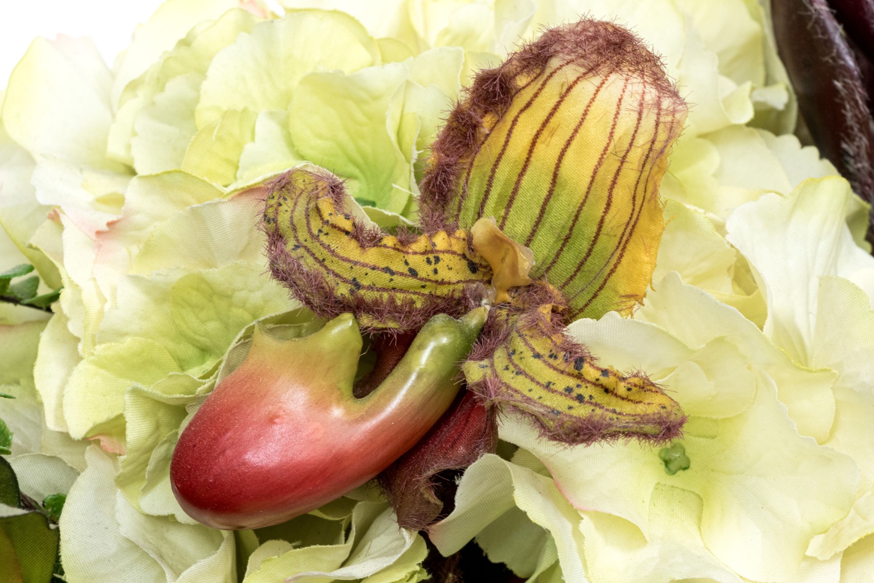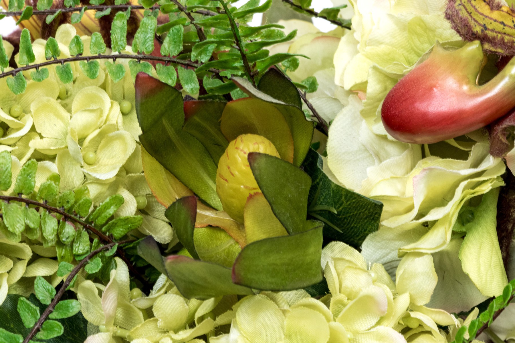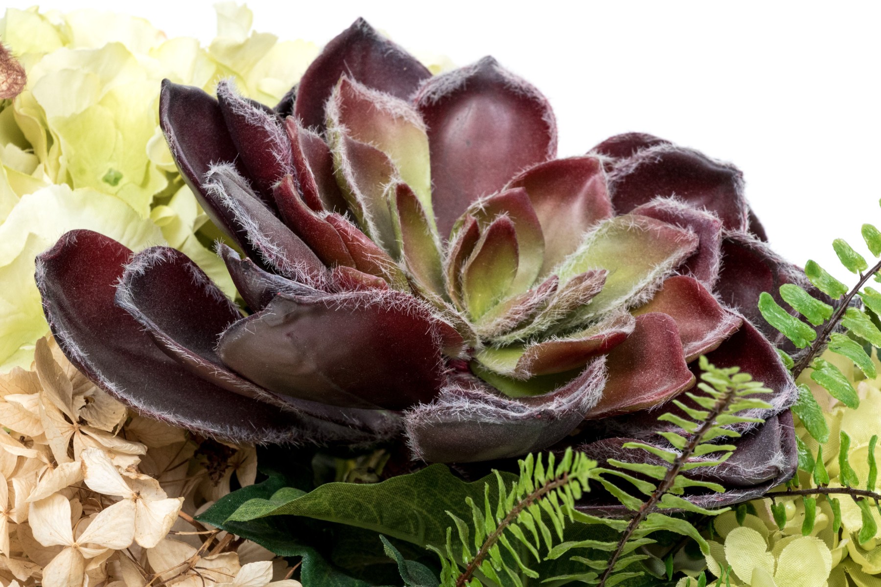 Rectangular wooden planters filled with a variety of faux flowers and foliage including ferns, hydrangeas and succulents.