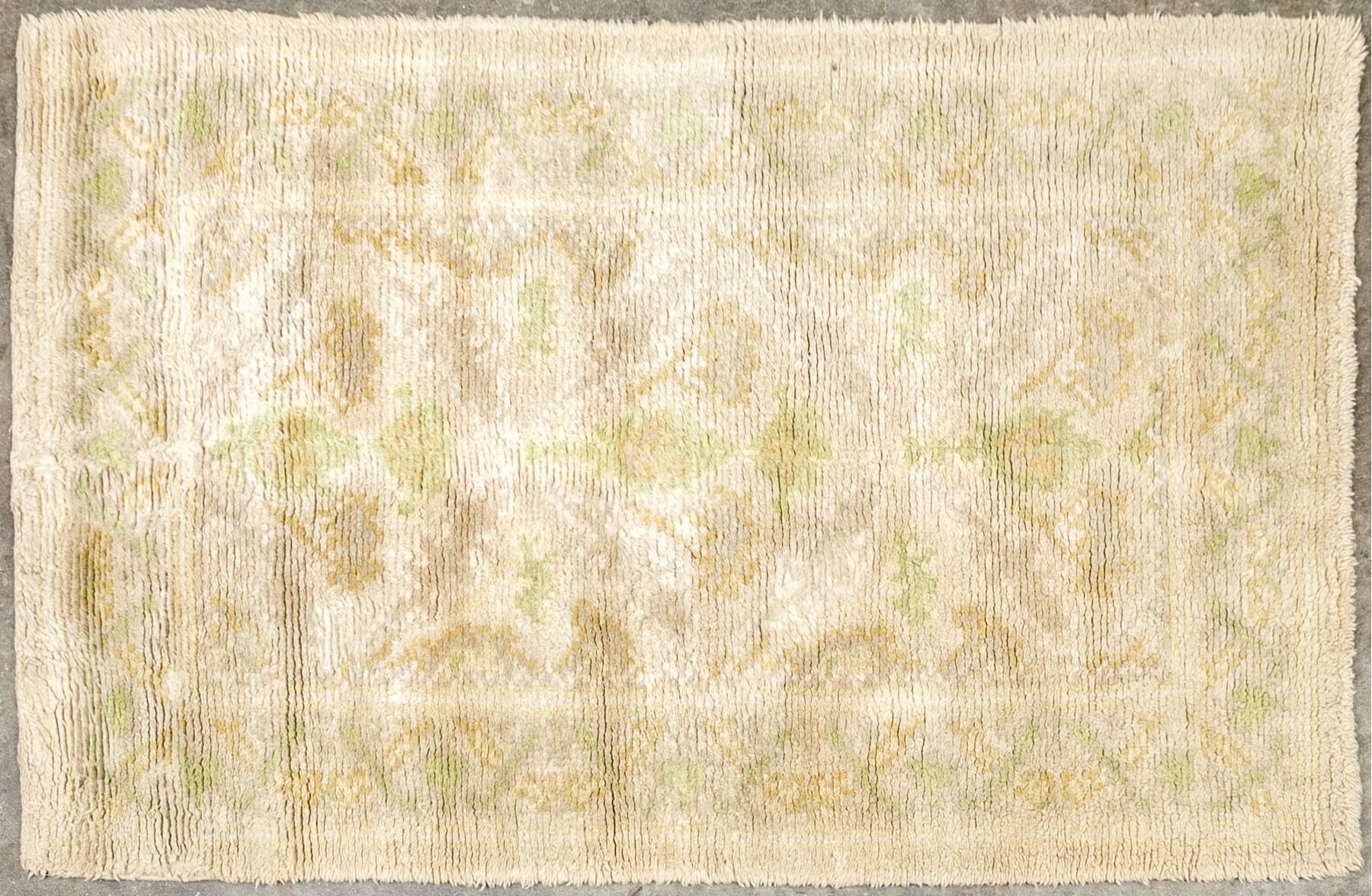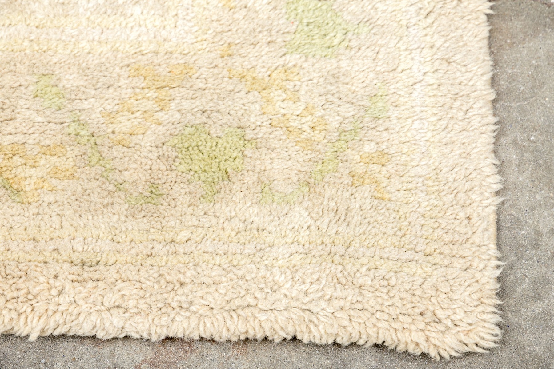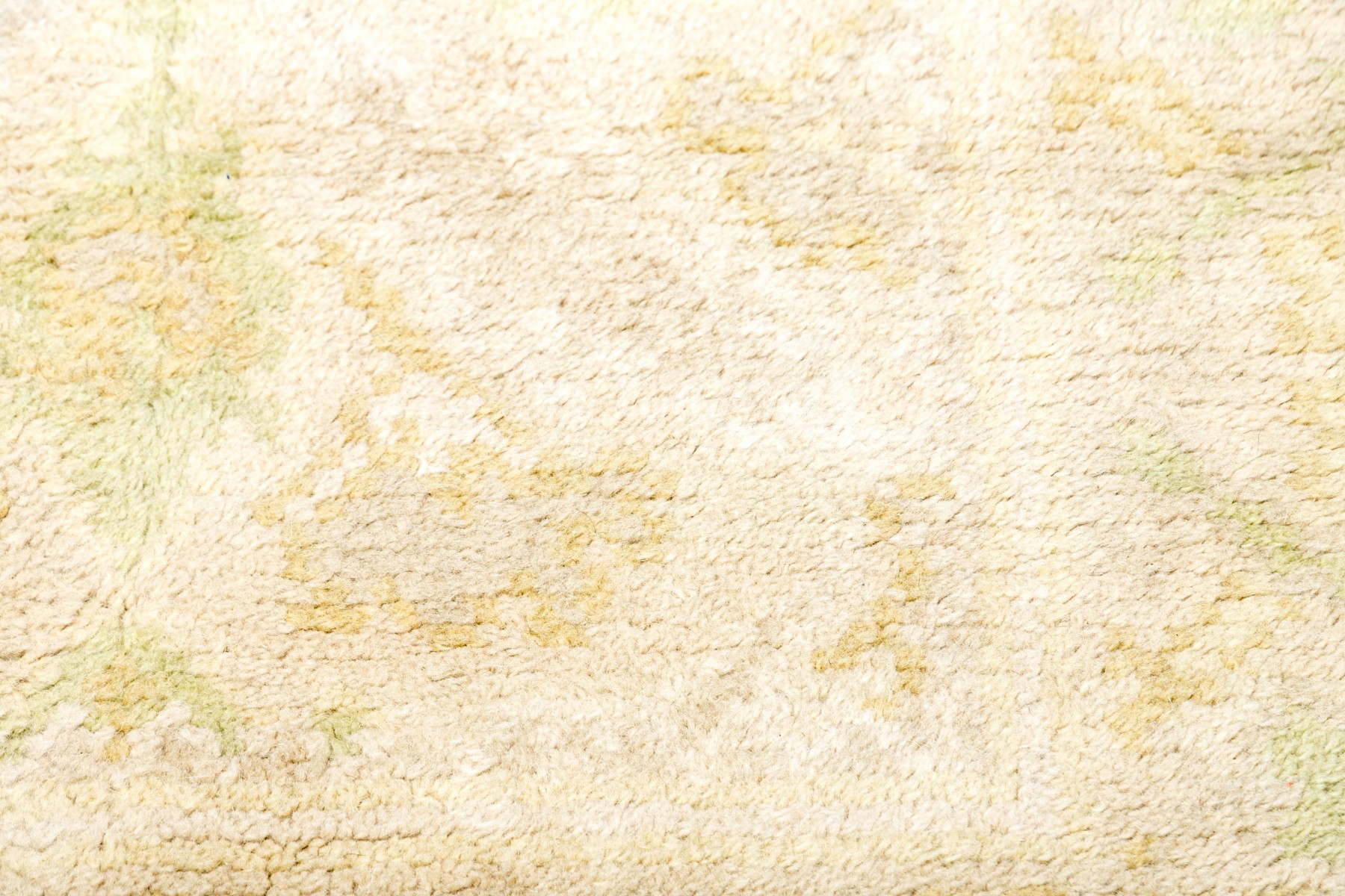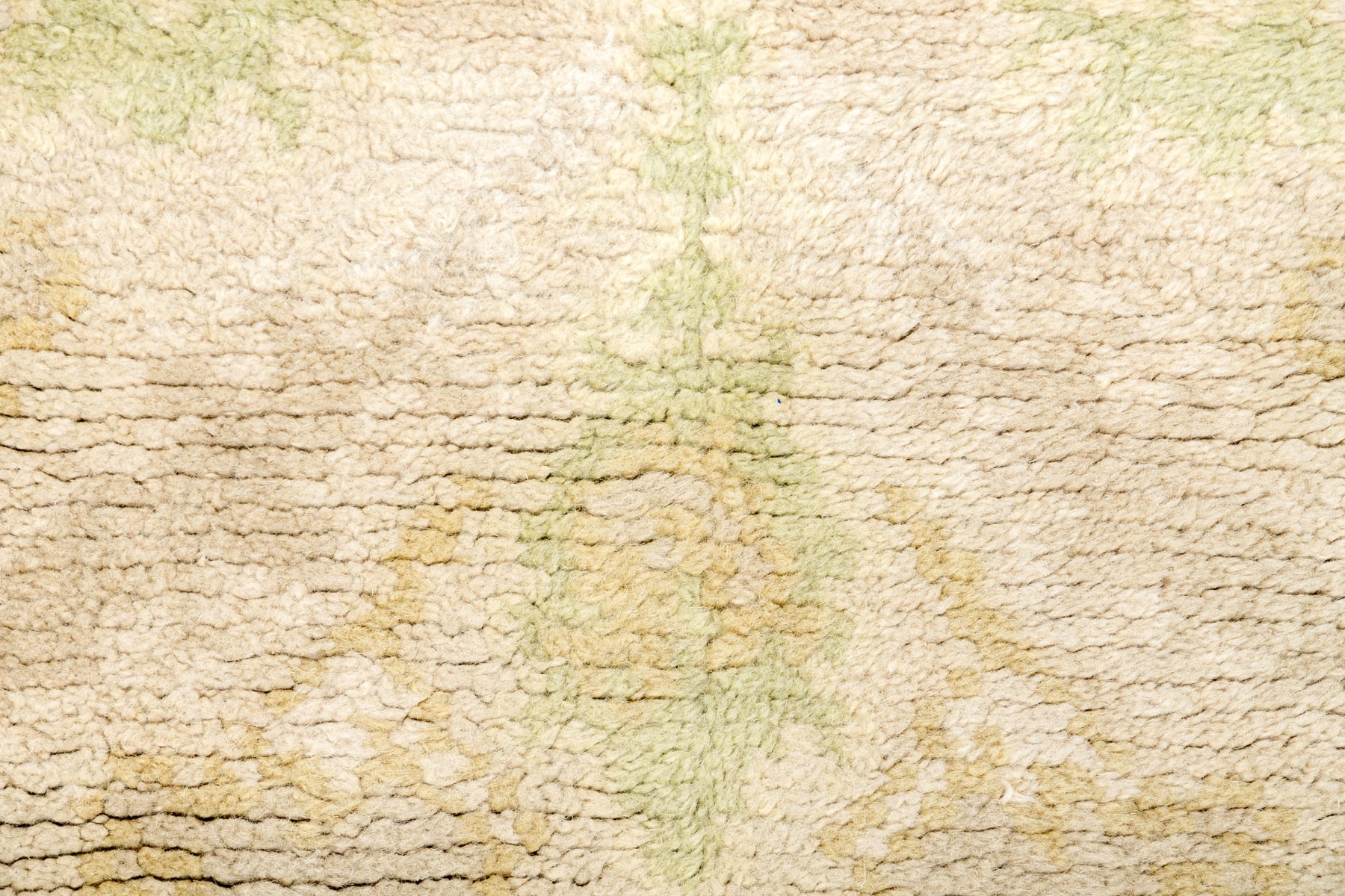 Muted colors, greens and an overall beige toned pile.