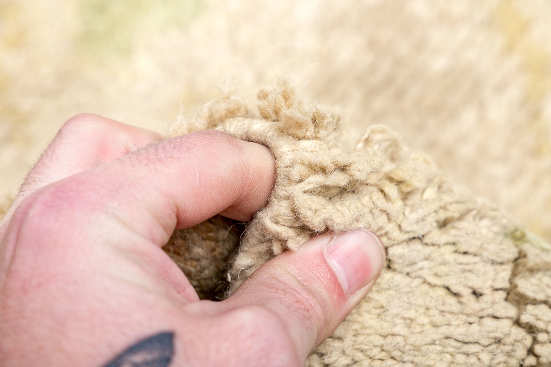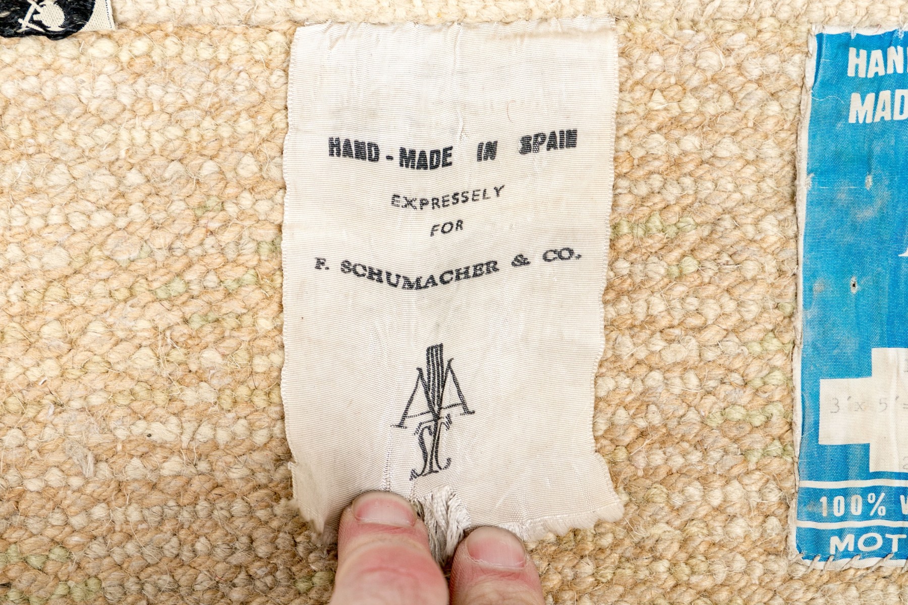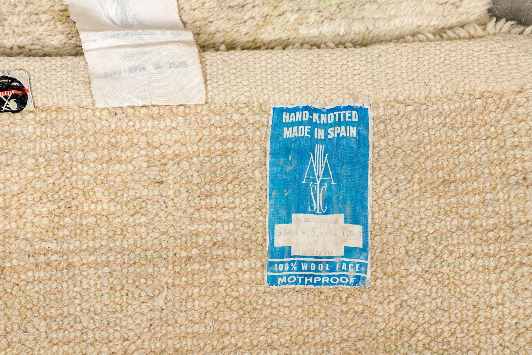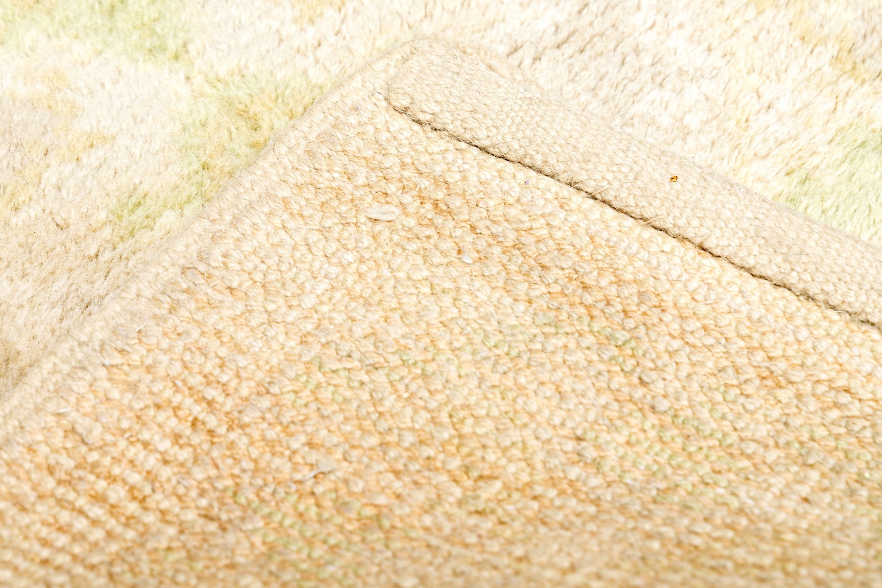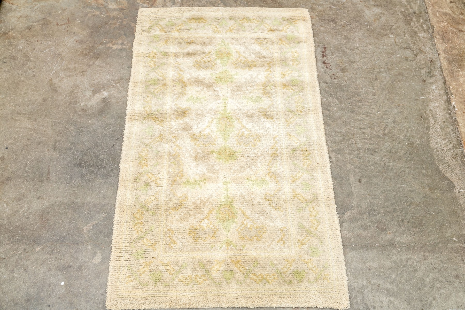 Muted colors, greens and an overall beige toned pile.