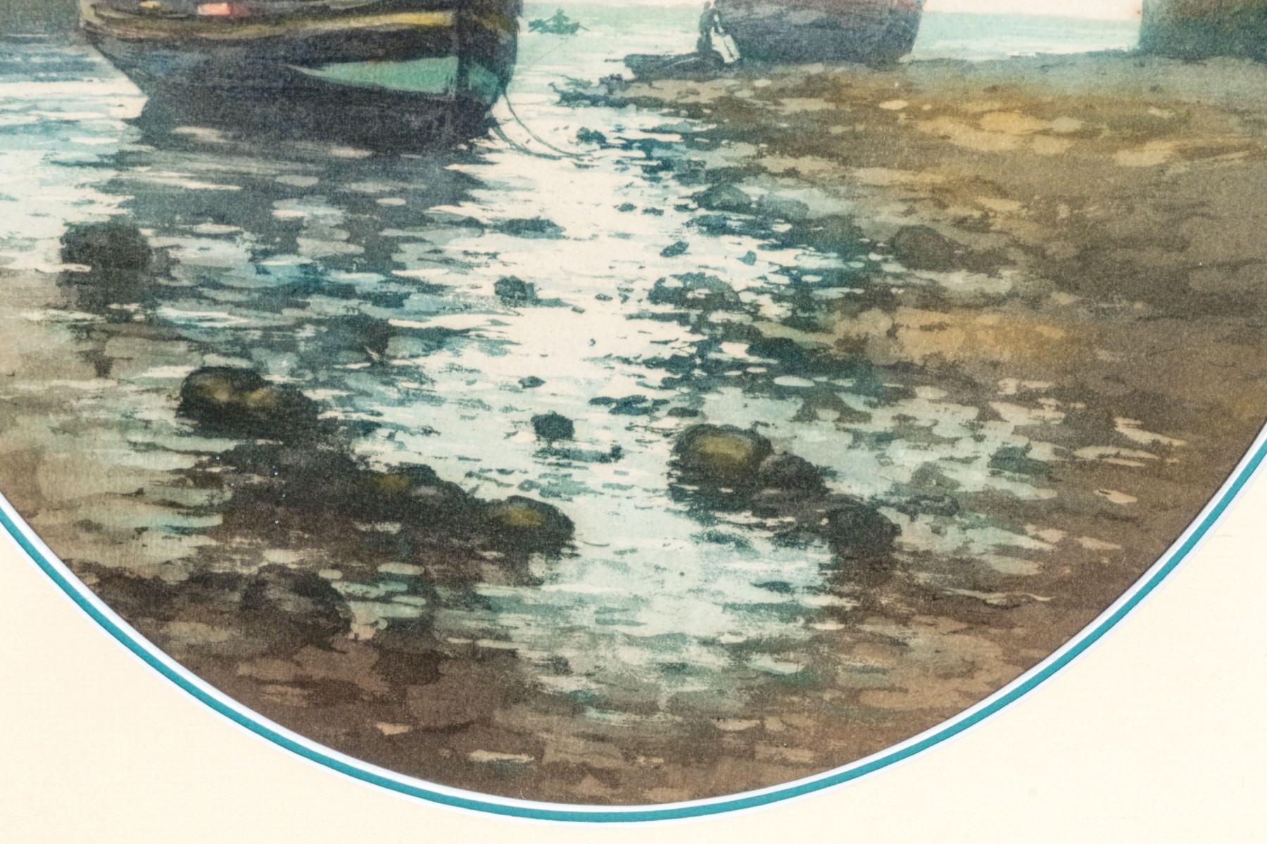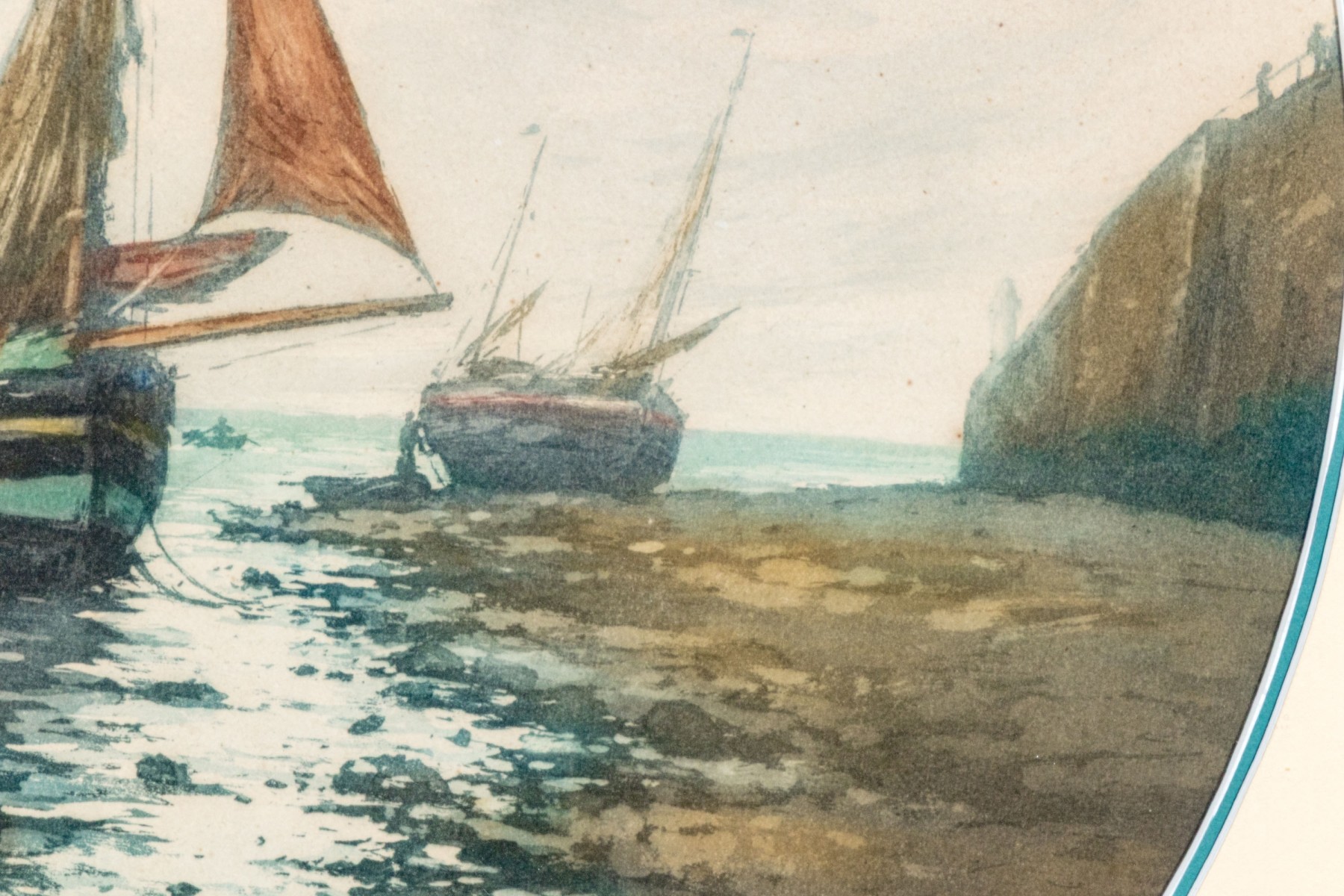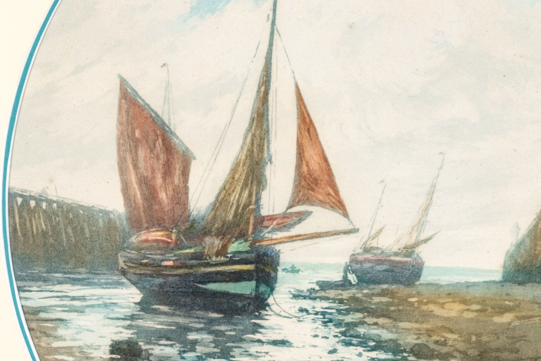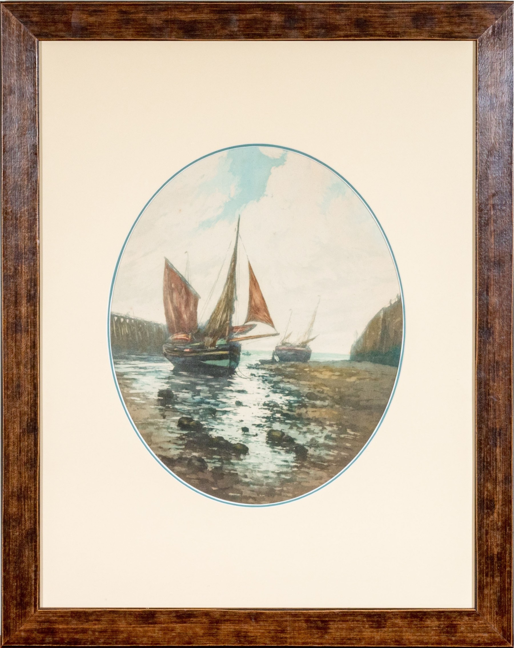 A wonderful work on paper depicting a coastal scene with sailboats at low tide beneath a clouded sky.
