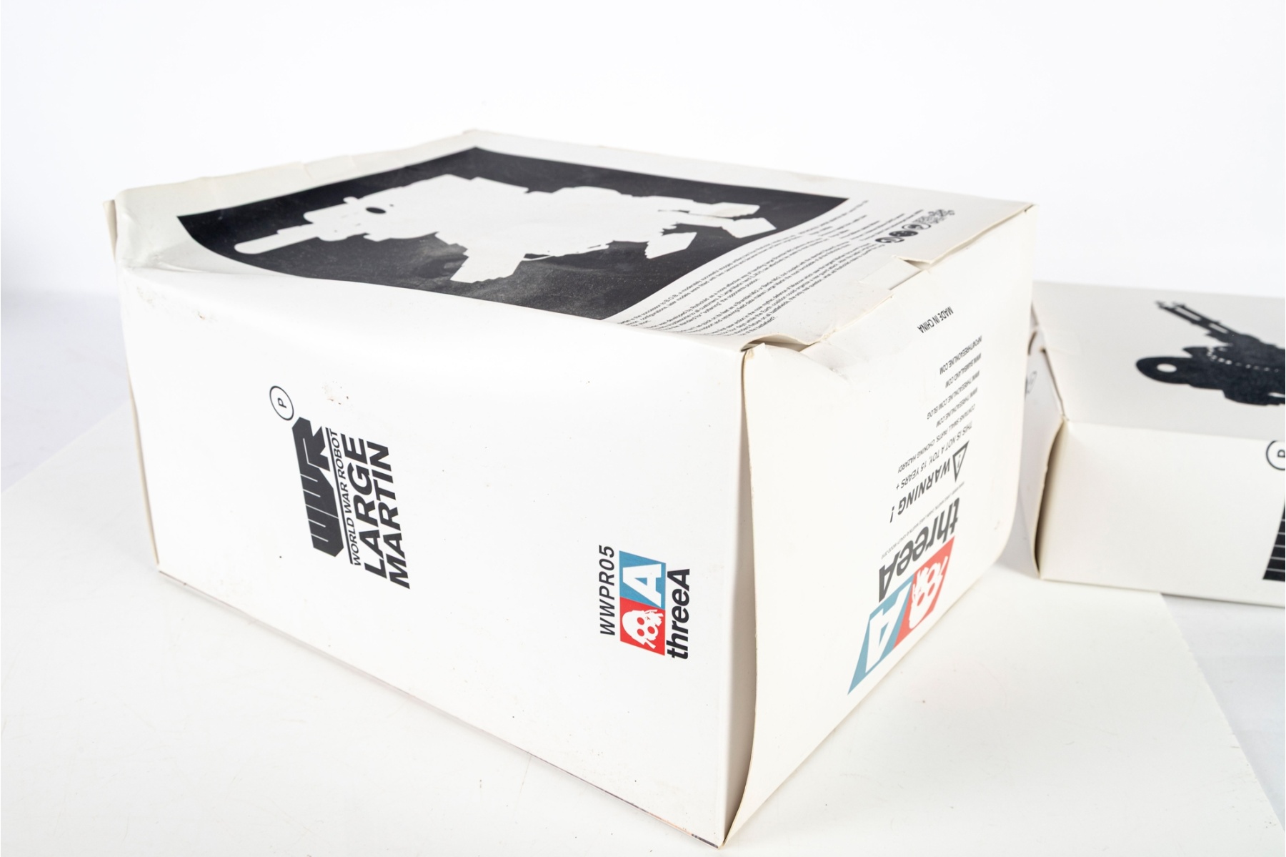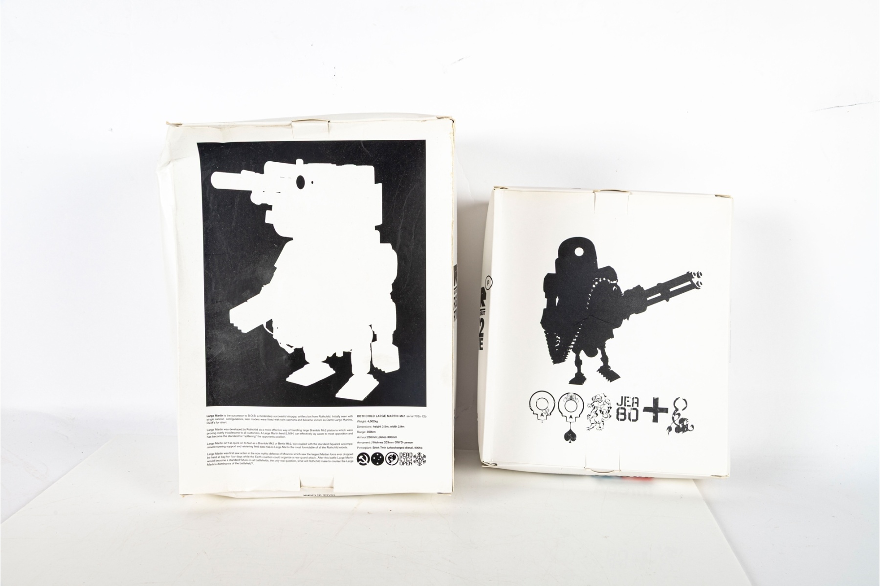 Pair of collectible robot figures from the acclaimed World War Robot series by artist Ashley Wood and manufacturer ThreeA (3A). These highly detailed figures feature the gritty, industrial aesthetic that defined Wood’s iconic sci-fi art world, blending realism with stylized weathering and articulation.