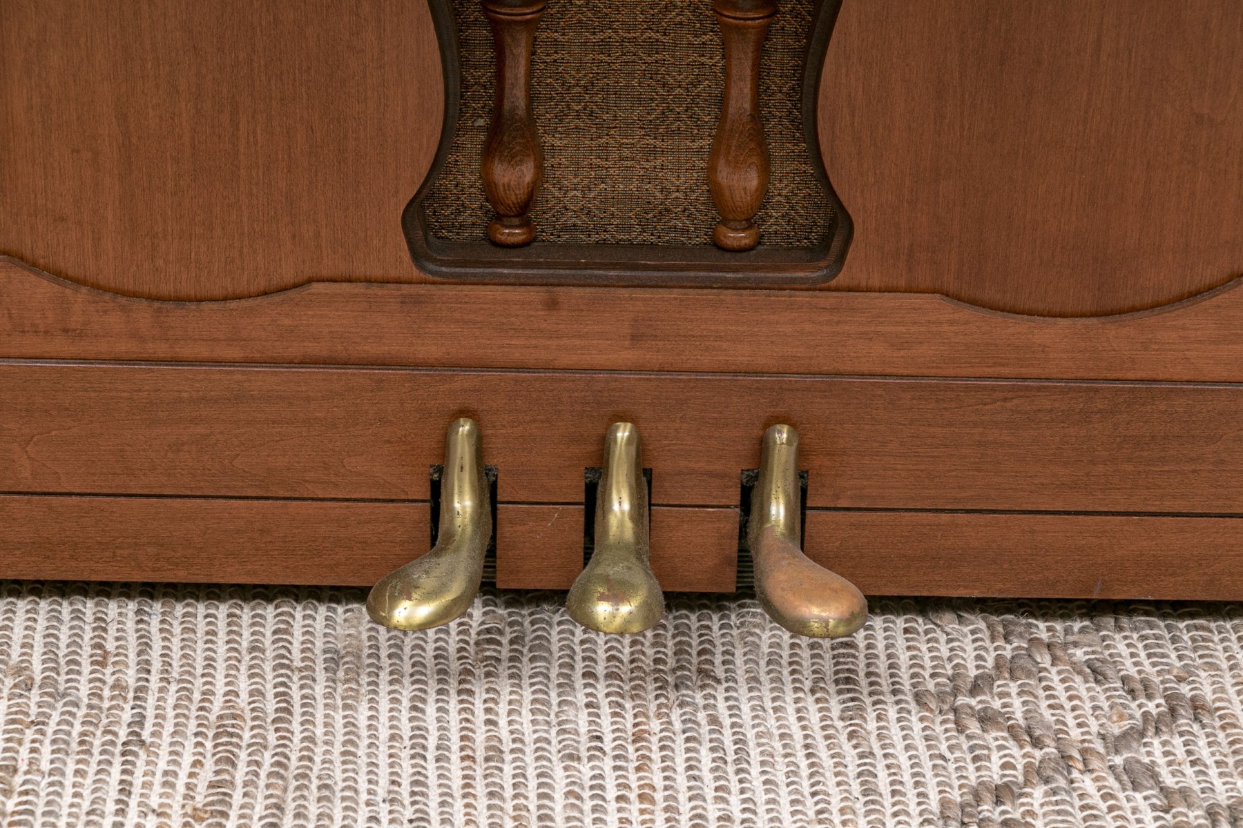 Along with a matching bench with hinged top and sheet music and music books inside.