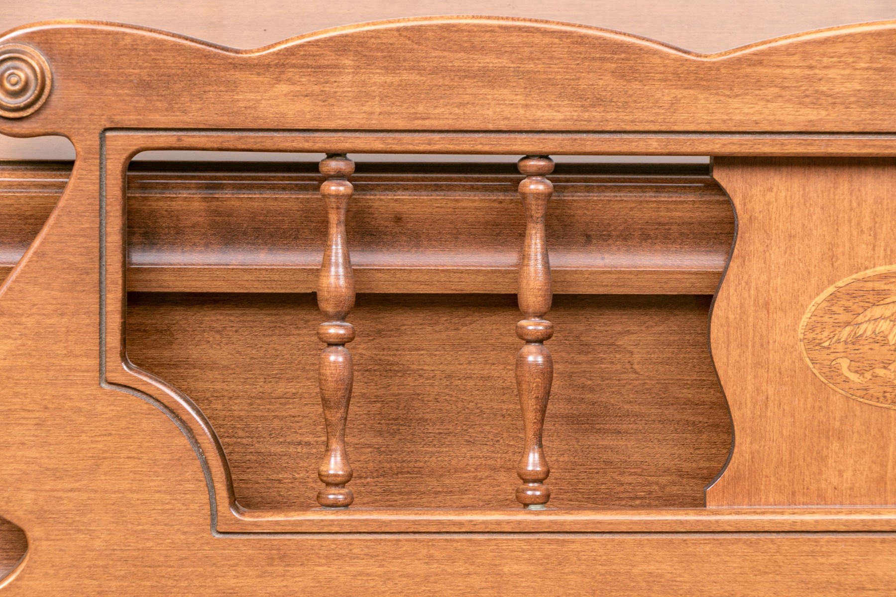In a honey tone finish with a hinged top with brass support. The music stand inlaid with an oval with an American eagle. Raised on fluted tapering legs on casters.
