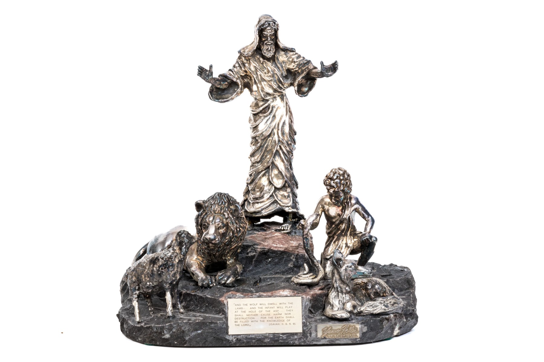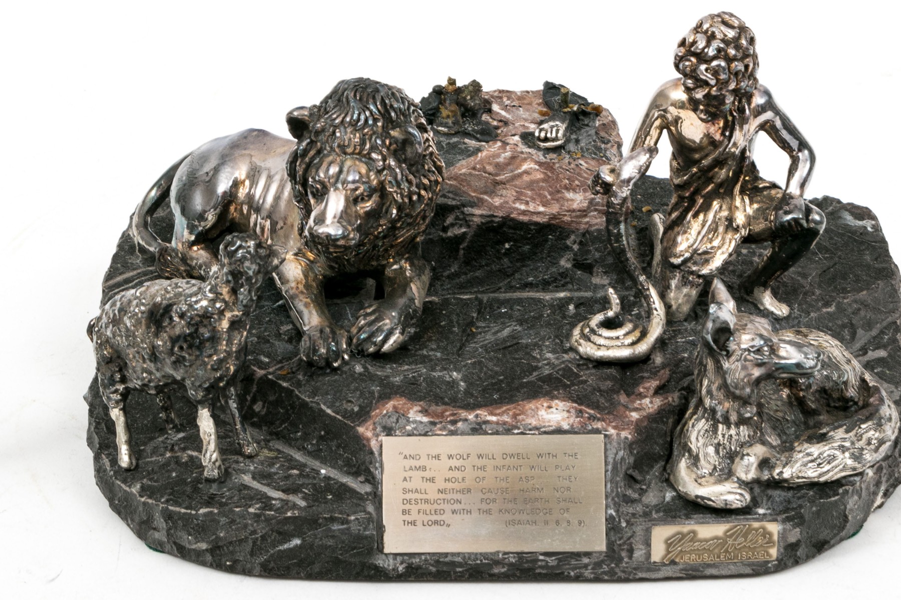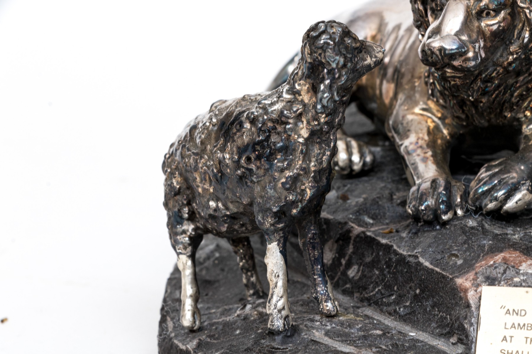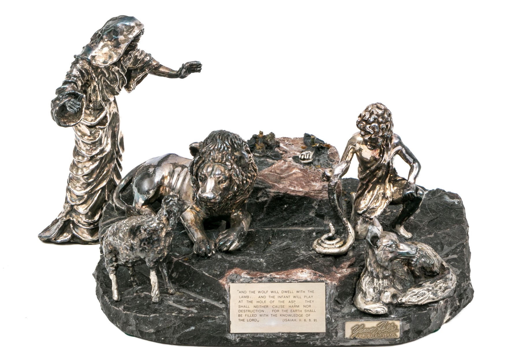 Yaacov Heller iconic Lion and the lamb Sterling Silver Clad Biblical Sculpture, set on a marble plinth.