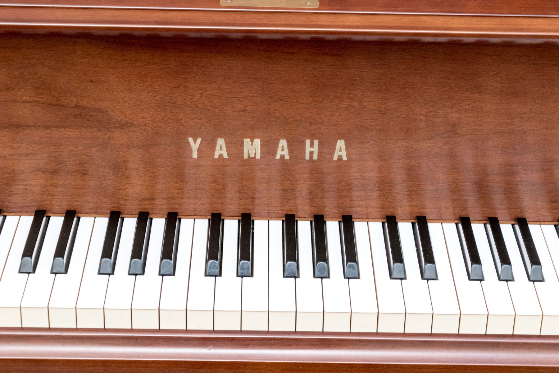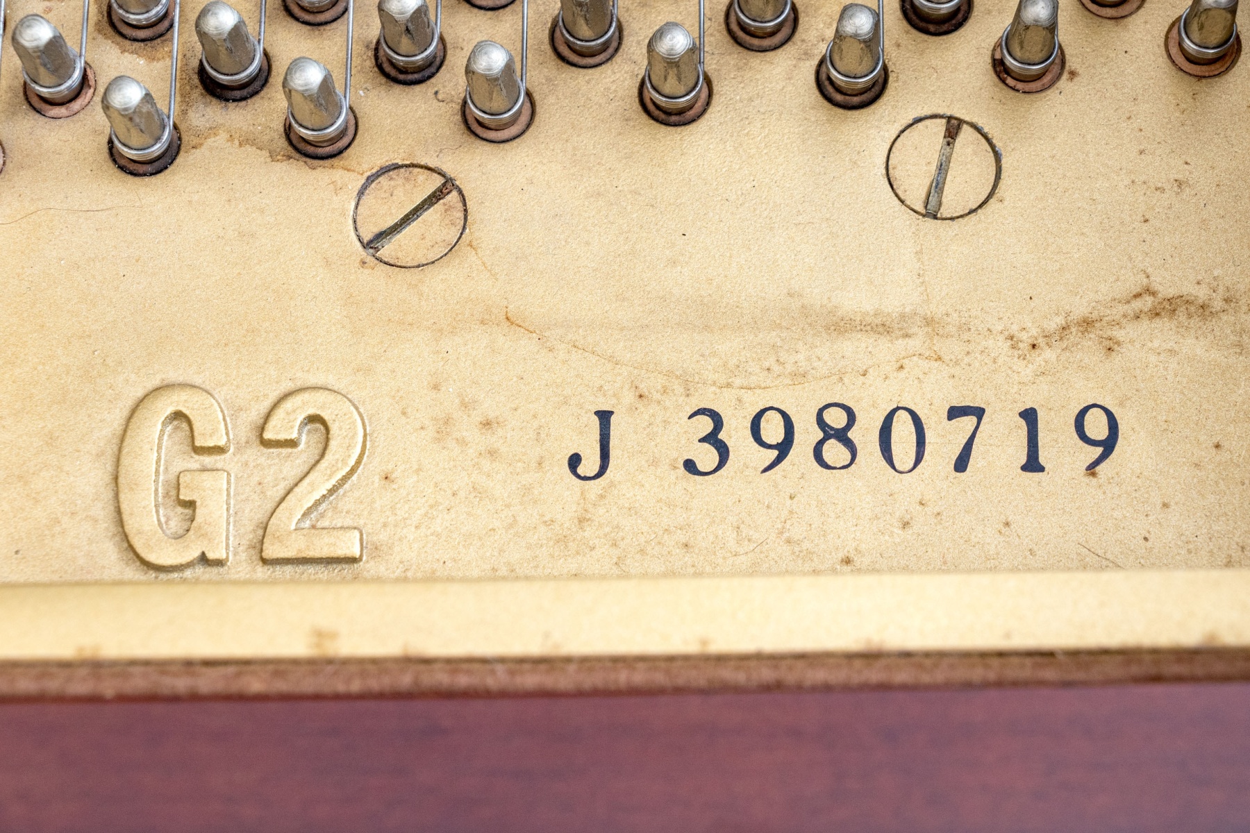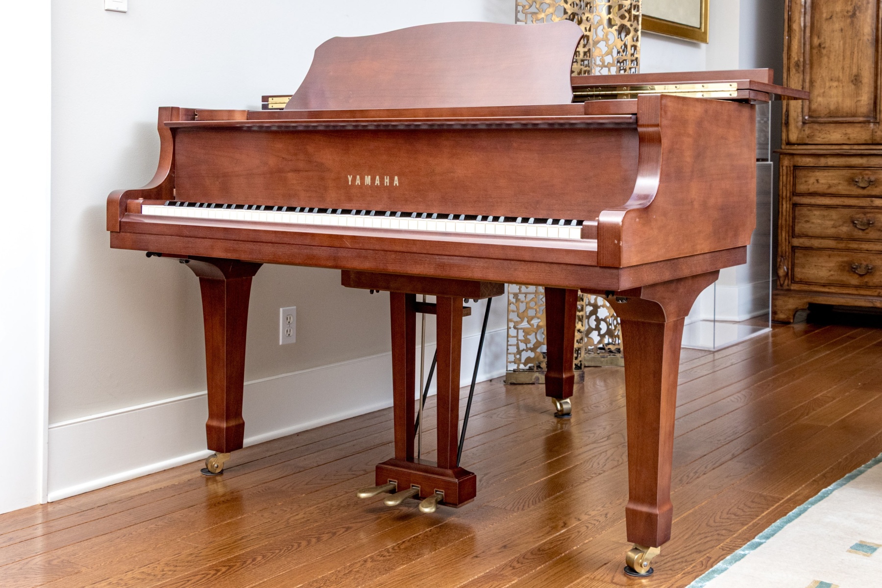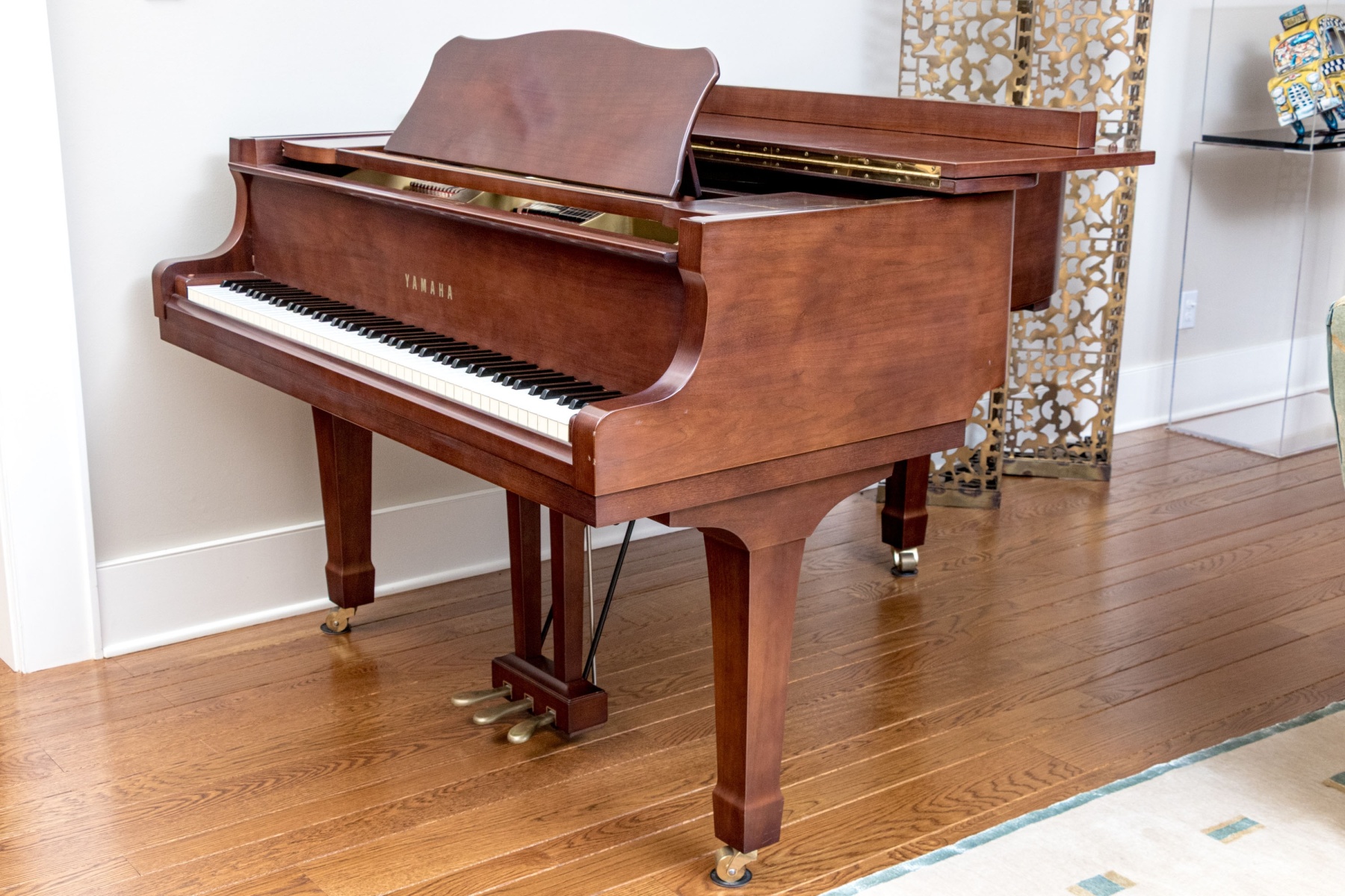 A gorgeous Yamaha G2 baby grand piano in warm-toned medium brown wood standing on three legs with brass casters. Features three brass pedals and a classic hinged top case. Serial #J3980719