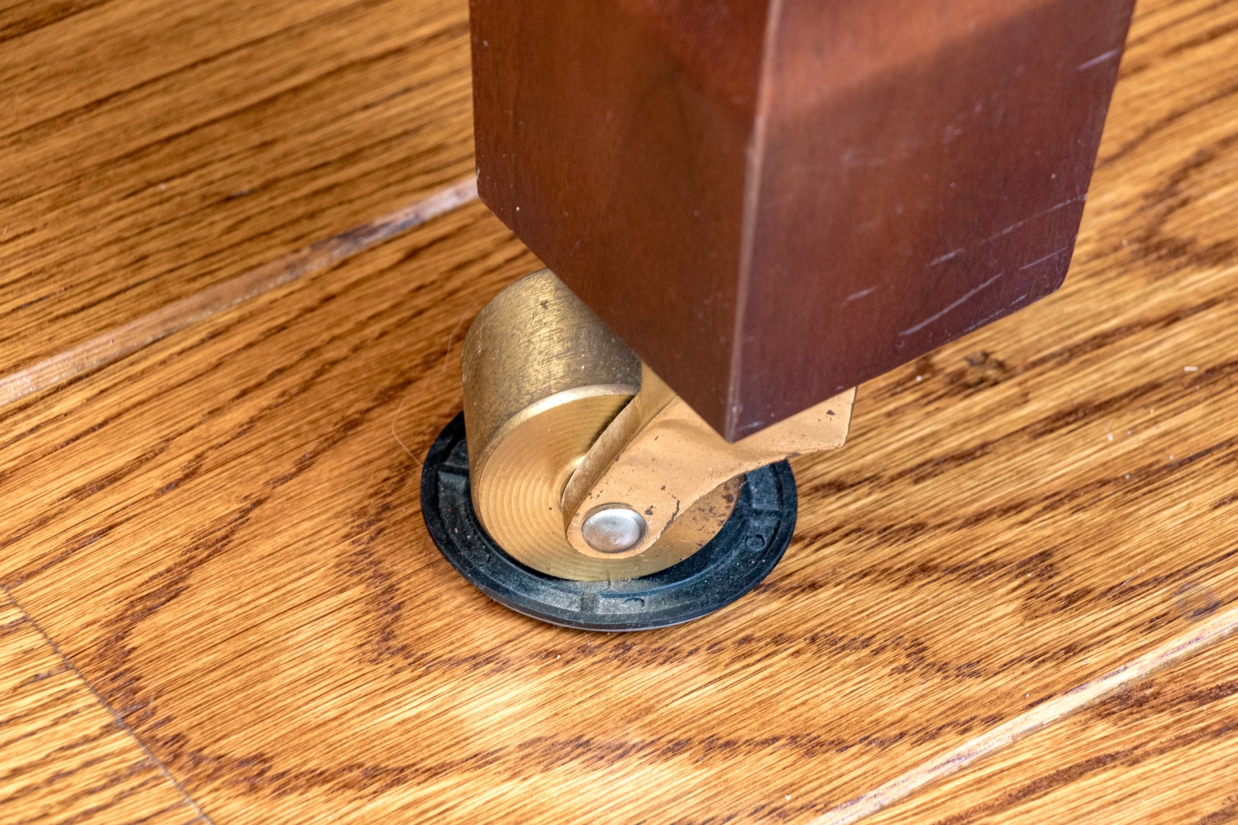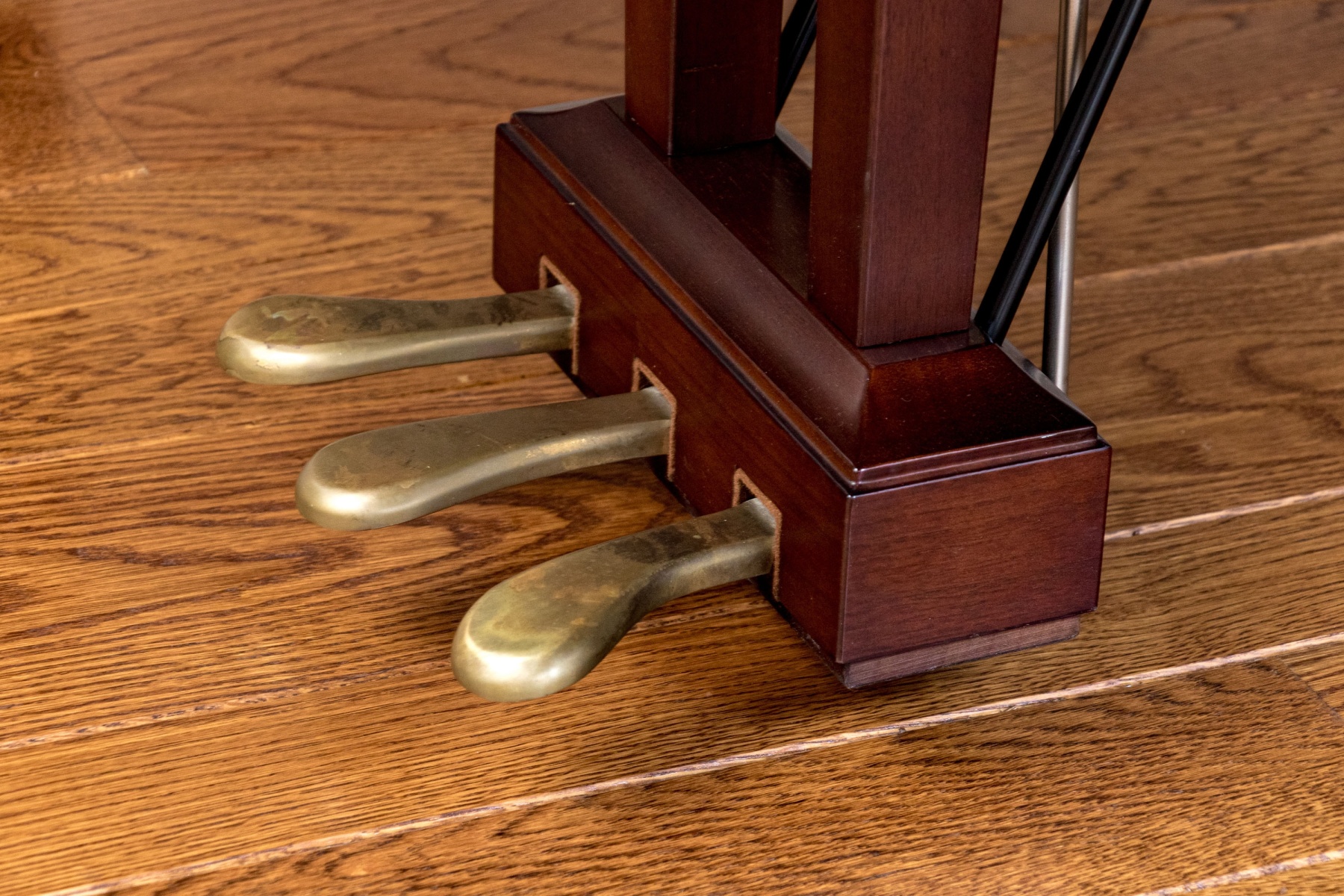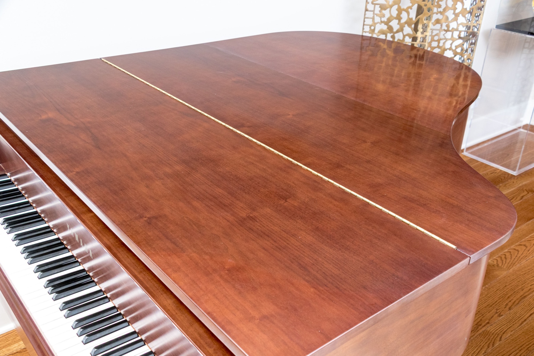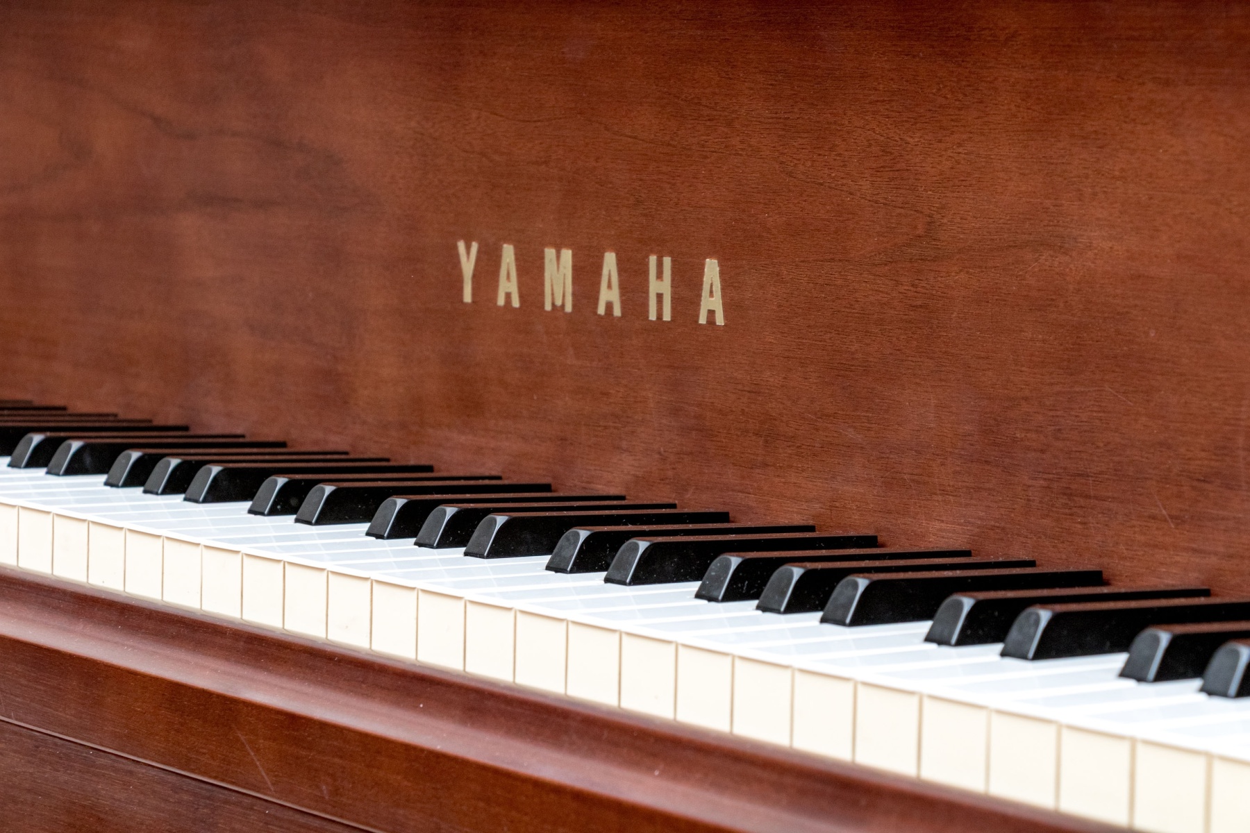 A gorgeous Yamaha G2 baby grand piano in warm-toned medium brown wood standing on three legs with brass casters. Features three brass pedals and a classic hinged top case. Serial #J3980719