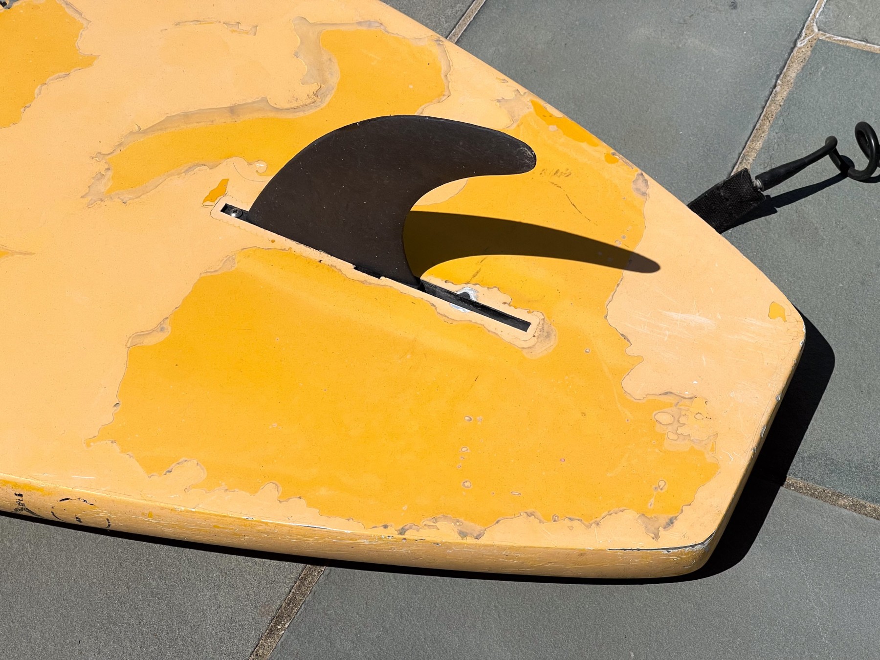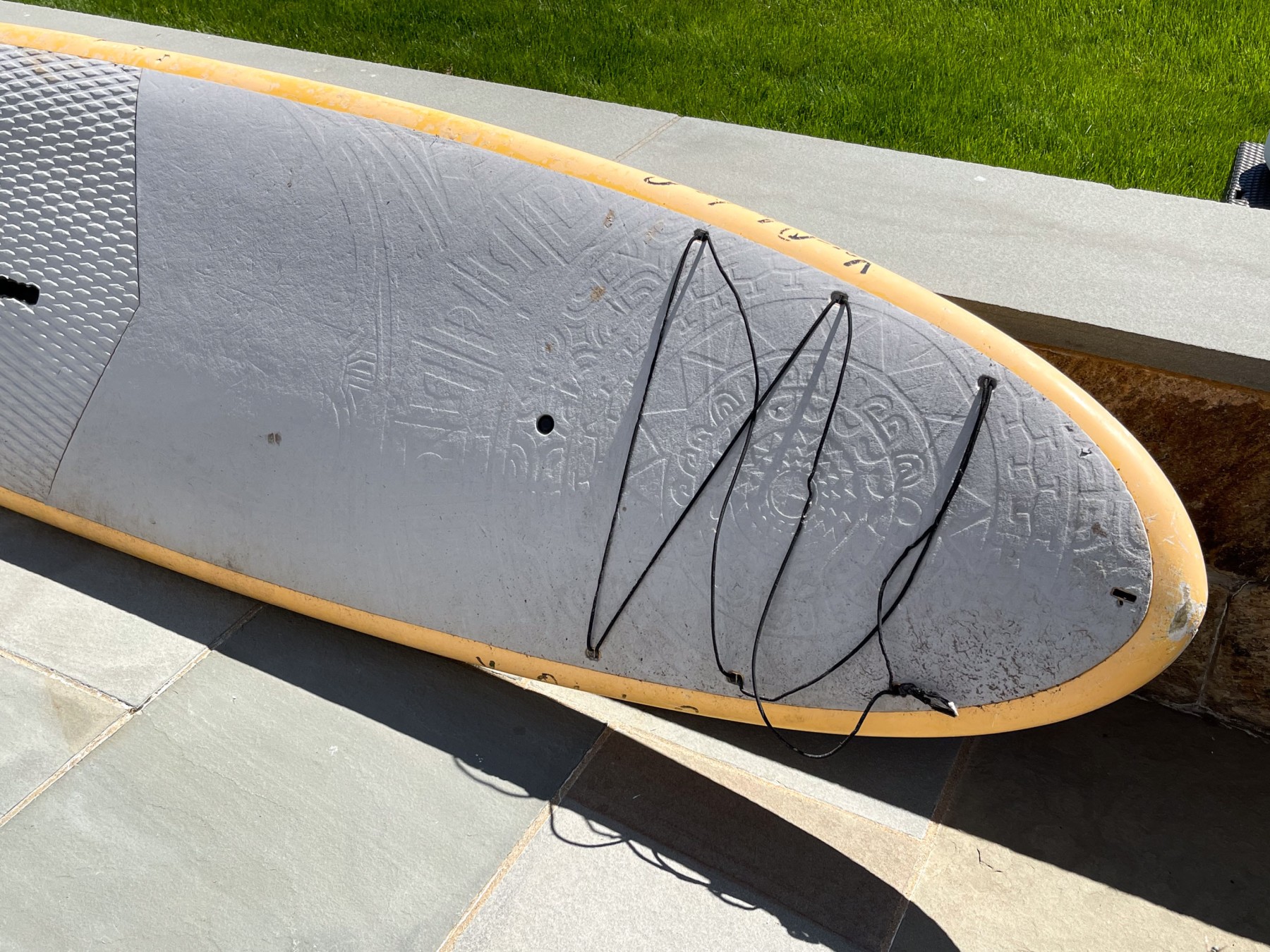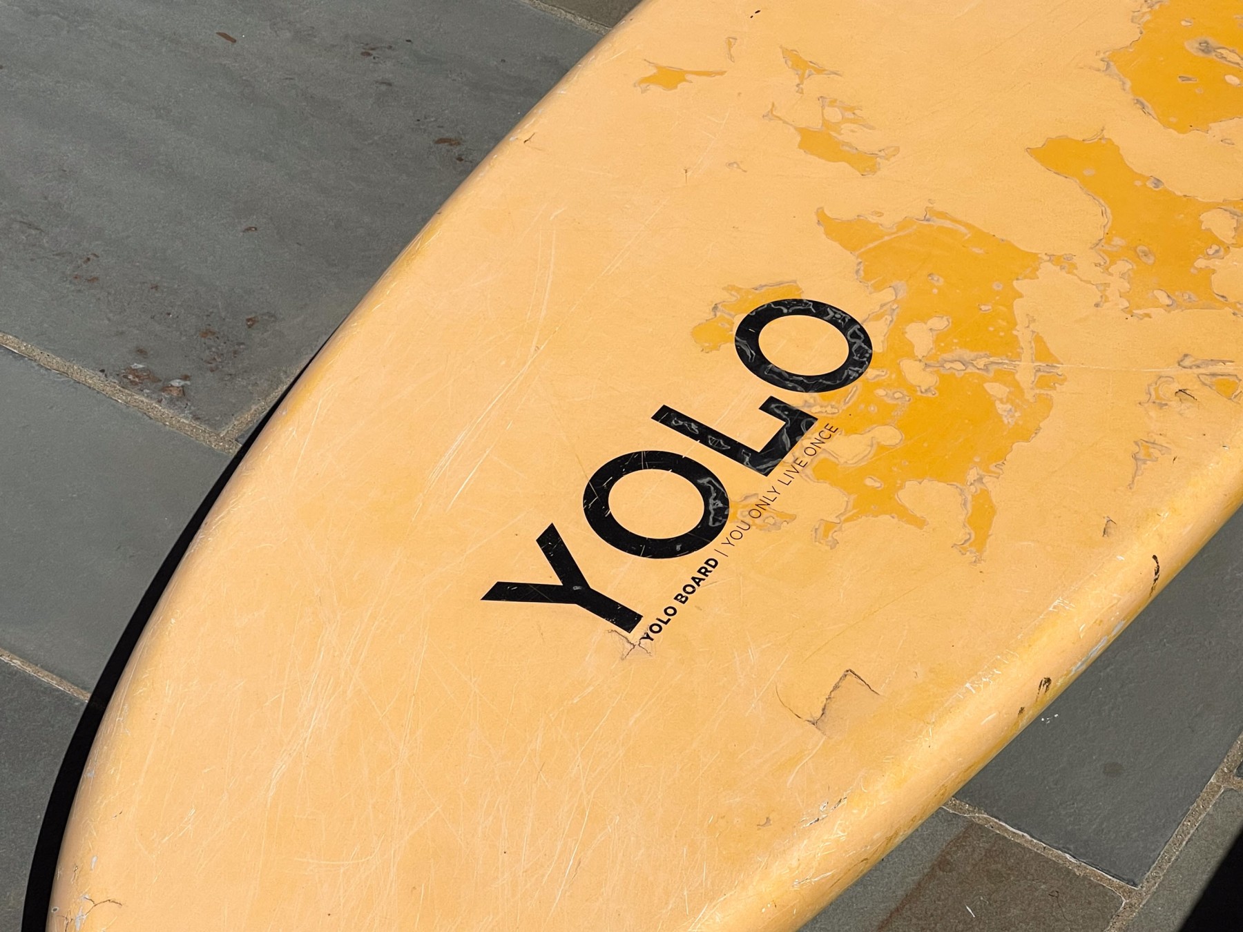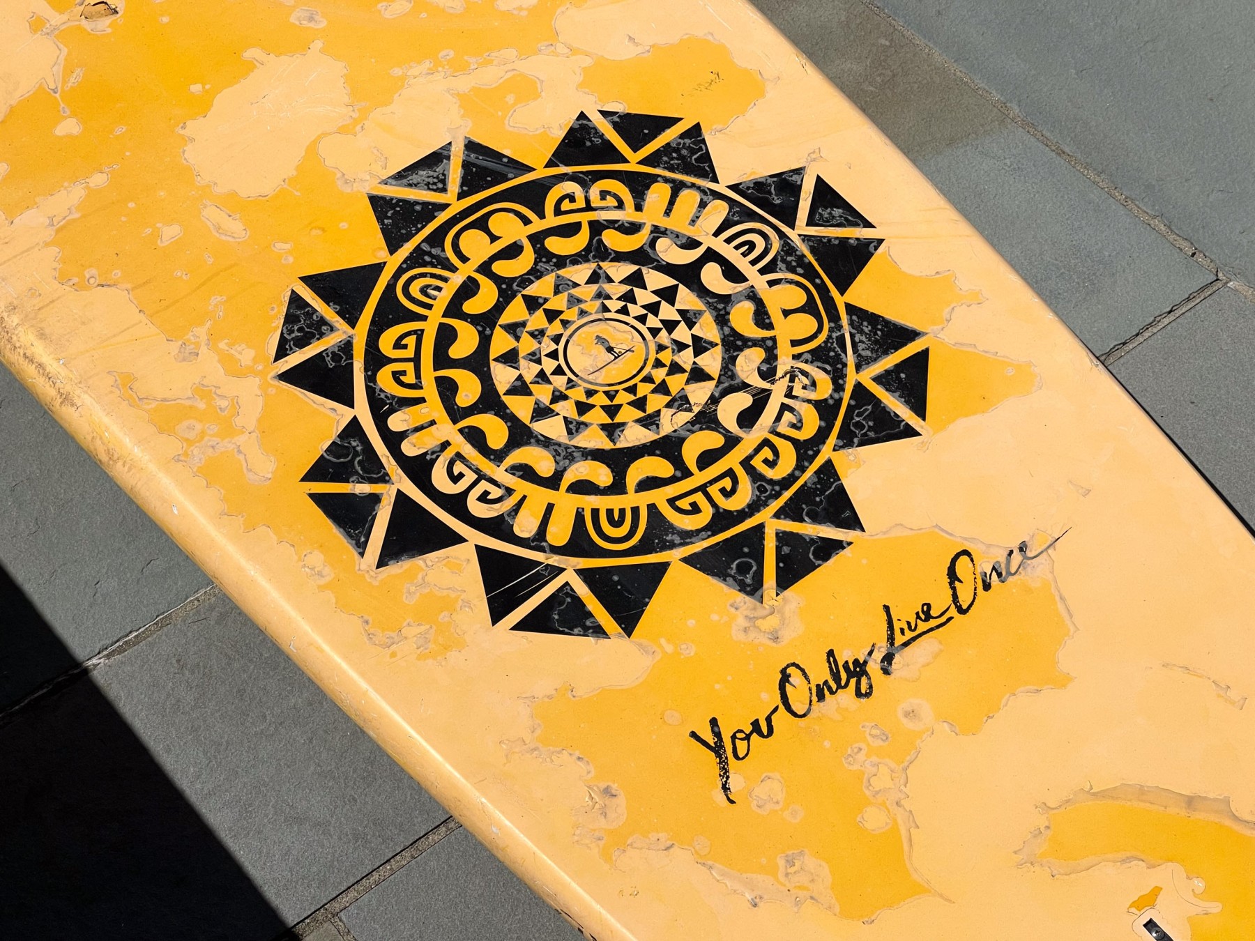 A large surfboard with one fin. Yellow ground with lettering YOLO to one end and a decorative medallion to the opposite end.