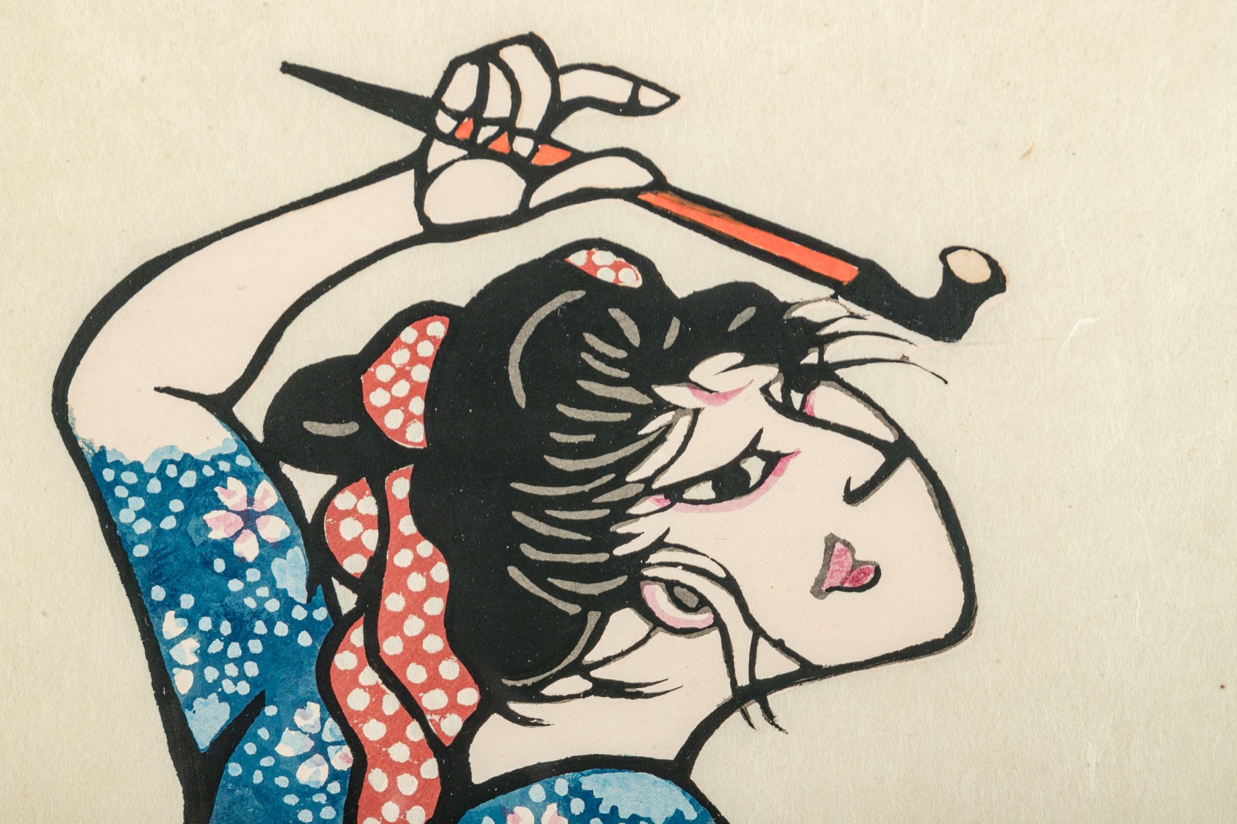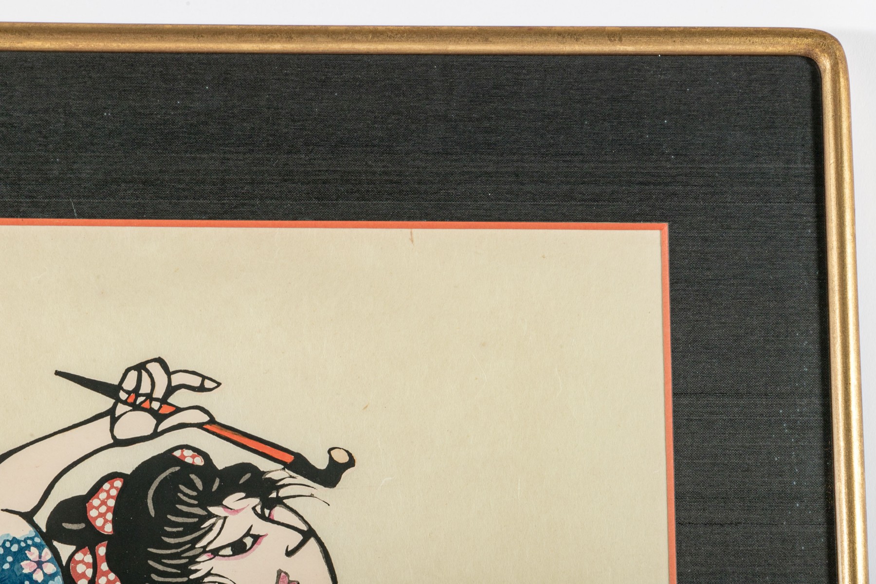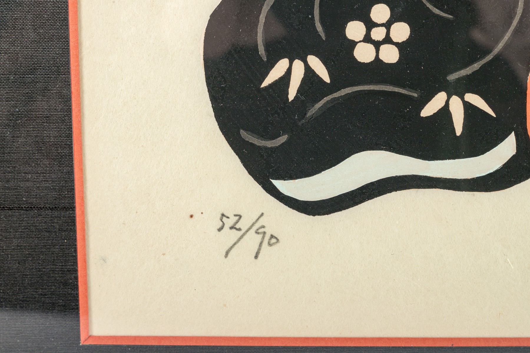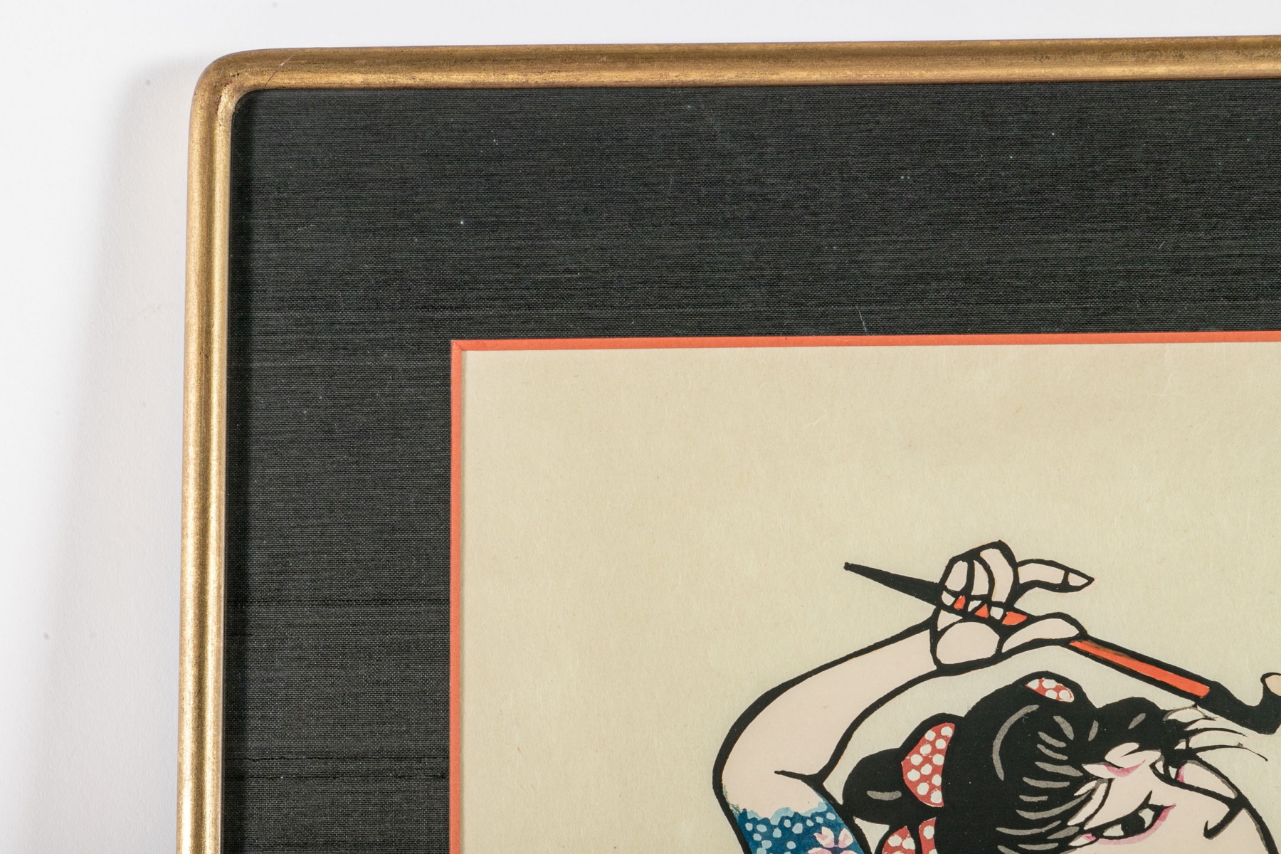 Yoshitoshi Mori (Japanese, 1898-1992) "Benten Kozo" ("Tattooed Lady with a Pipe") depicting the character Benten Kozo Kikunosuke from the play "Shiranami Go-nin Otoko." The figure displays blue floral tattoos across his back and thigh, draped in a black, orange, and red robe. Pencil signed and dated '84 lower right, numbered 52/90 lower left. Displayed behind glass wtih a black mat in a rounded rectangular gilt frame.