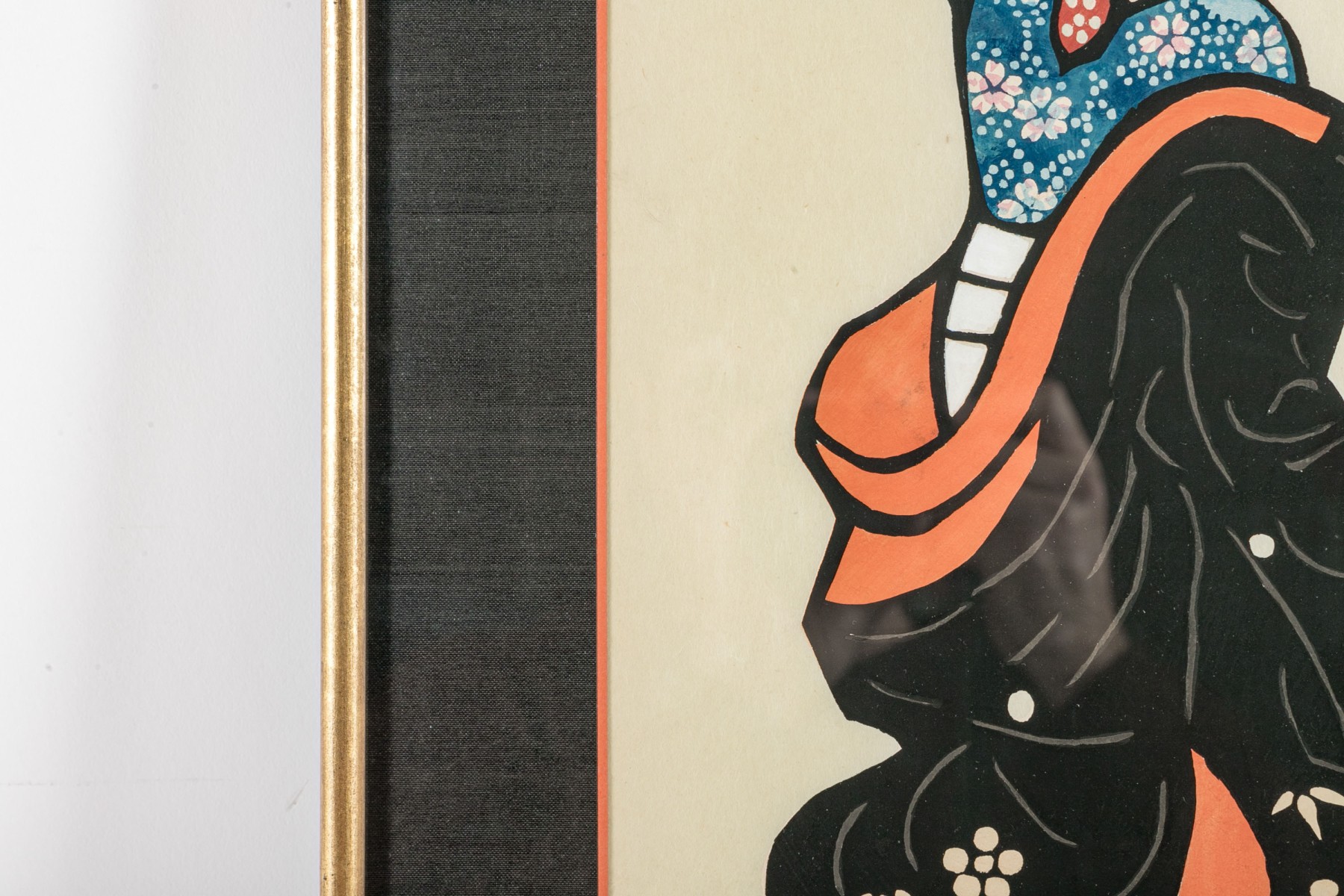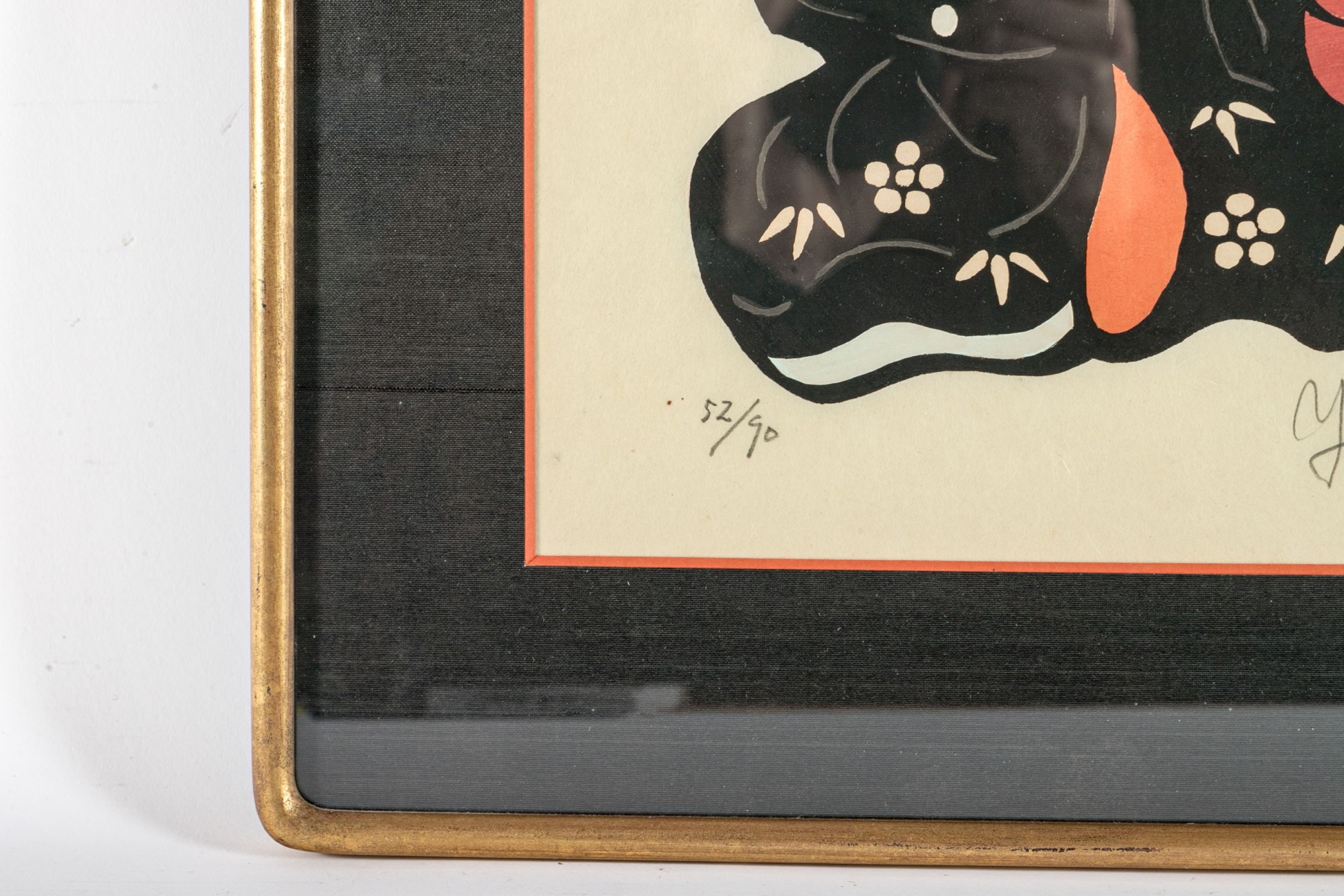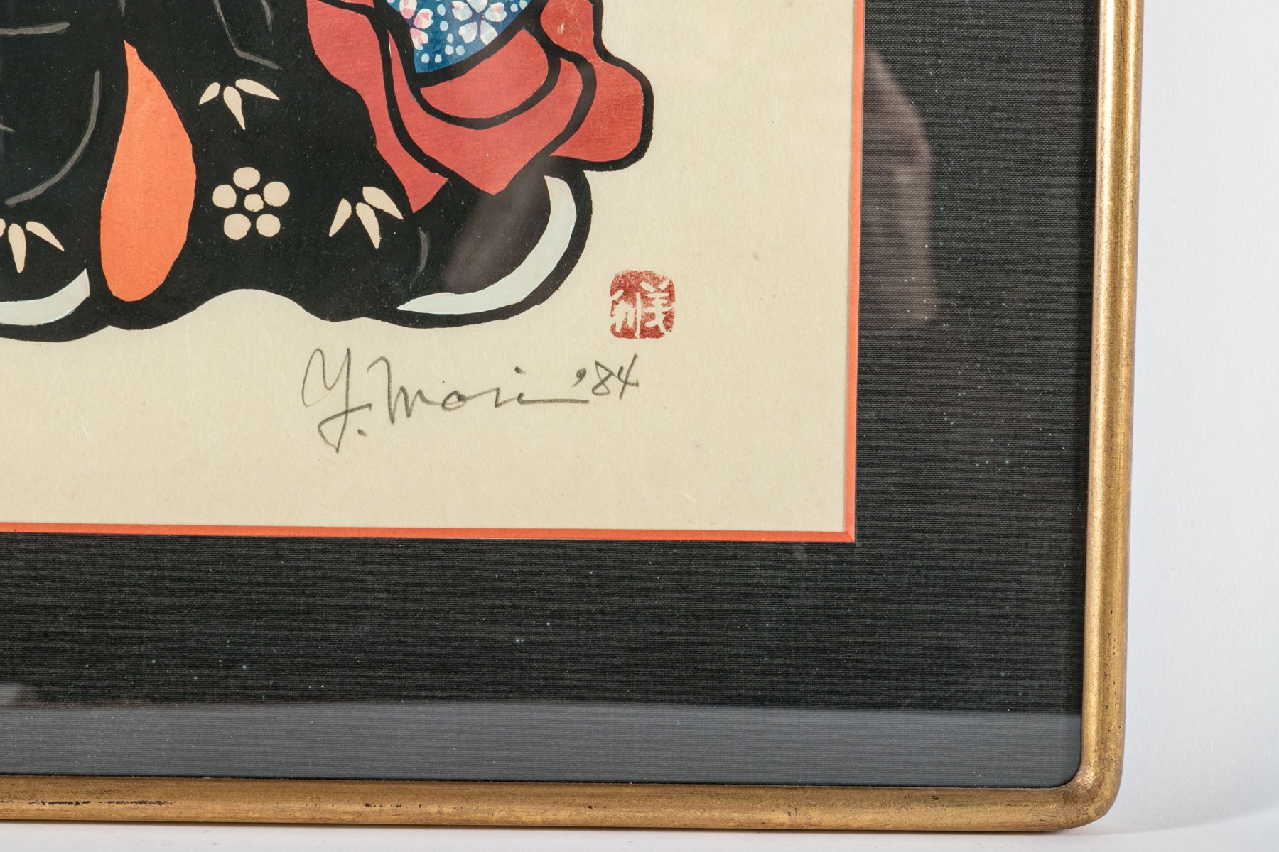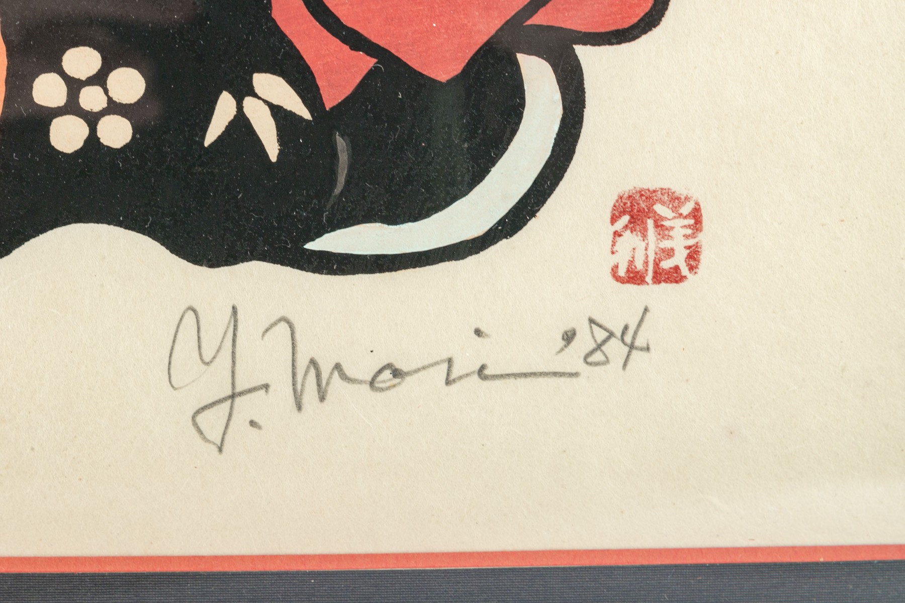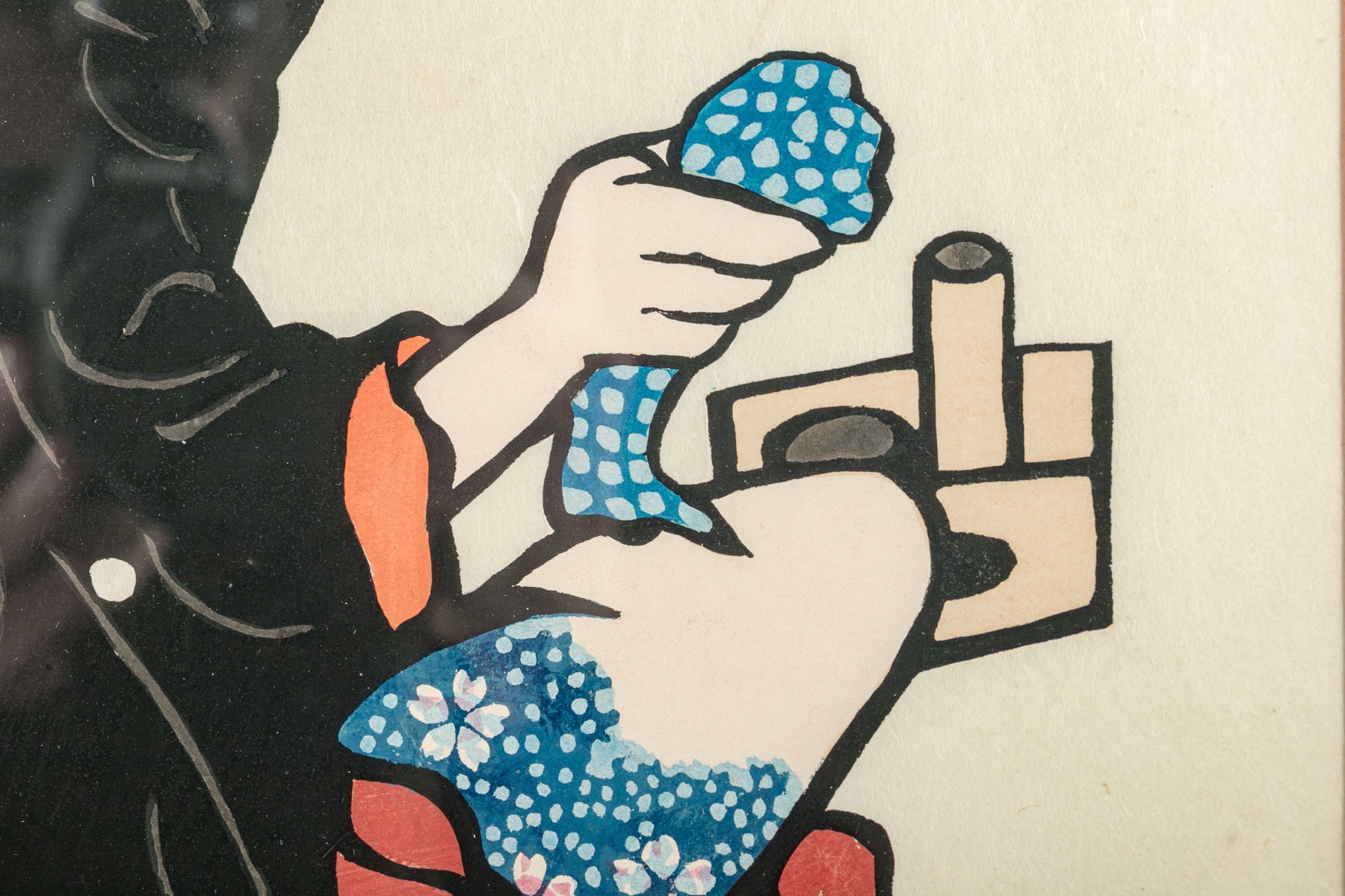 Yoshitoshi Mori (Japanese, 1898-1992) "Benten Kozo" ("Tattooed Lady with a Pipe") depicting the character Benten Kozo Kikunosuke from the play "Shiranami Go-nin Otoko." The figure displays blue floral tattoos across his back and thigh, draped in a black, orange, and red robe. Pencil signed and dated '84 lower right, numbered 52/90 lower left. Displayed behind glass wtih a black mat in a rounded rectangular gilt frame.