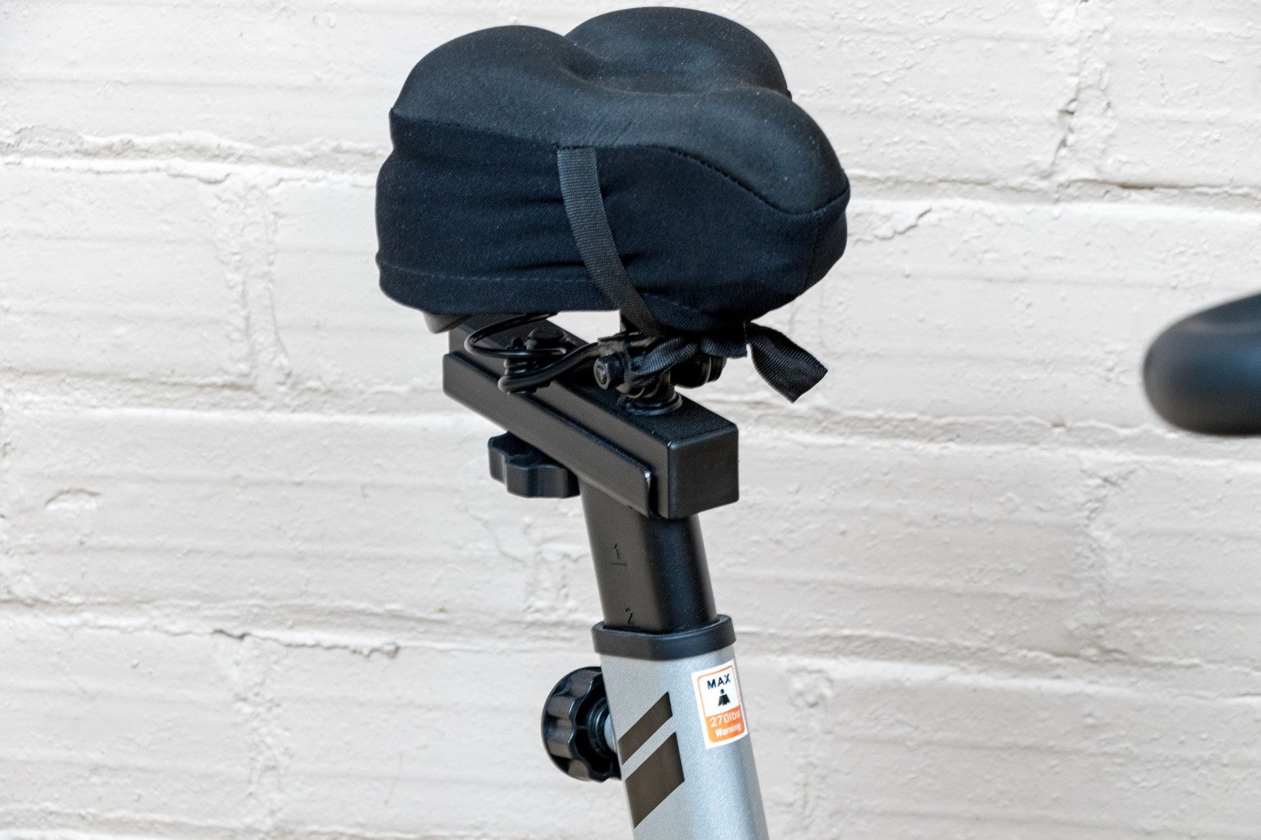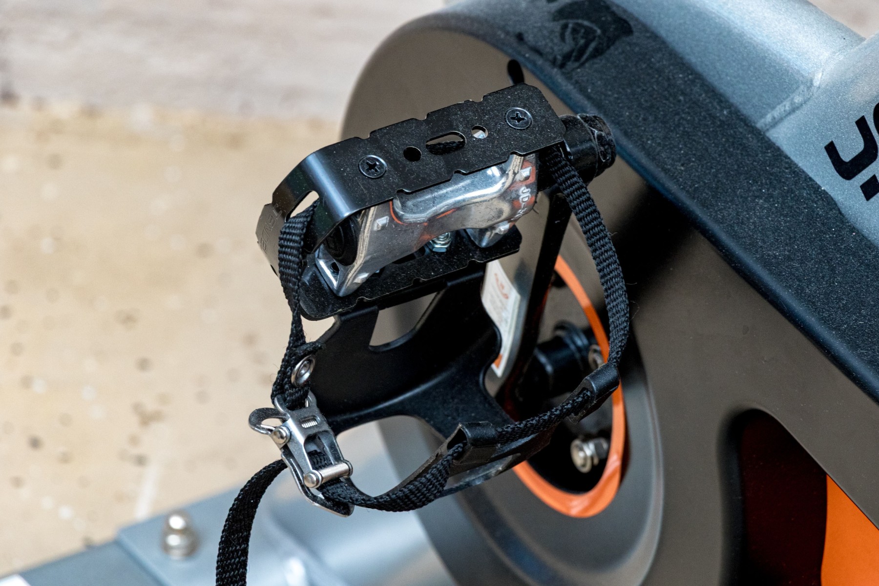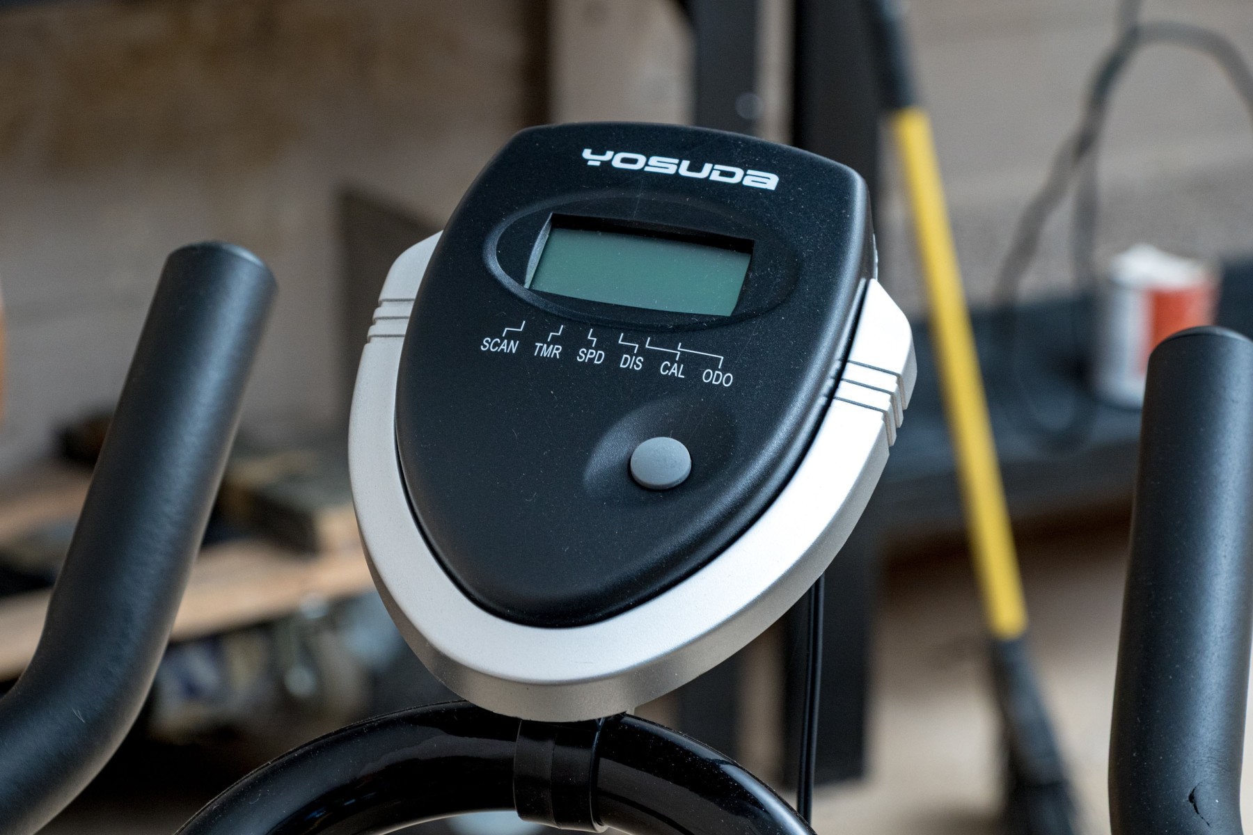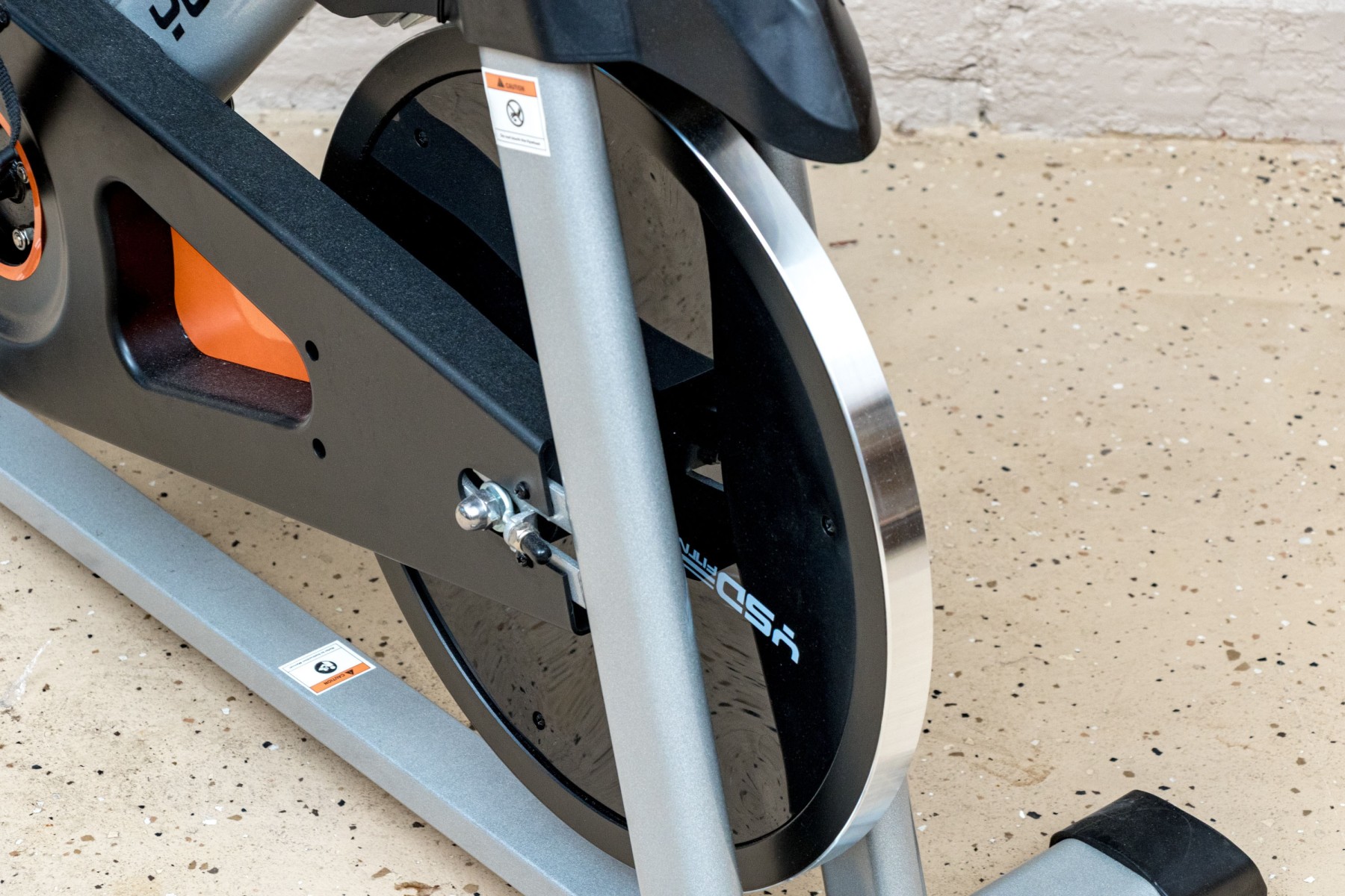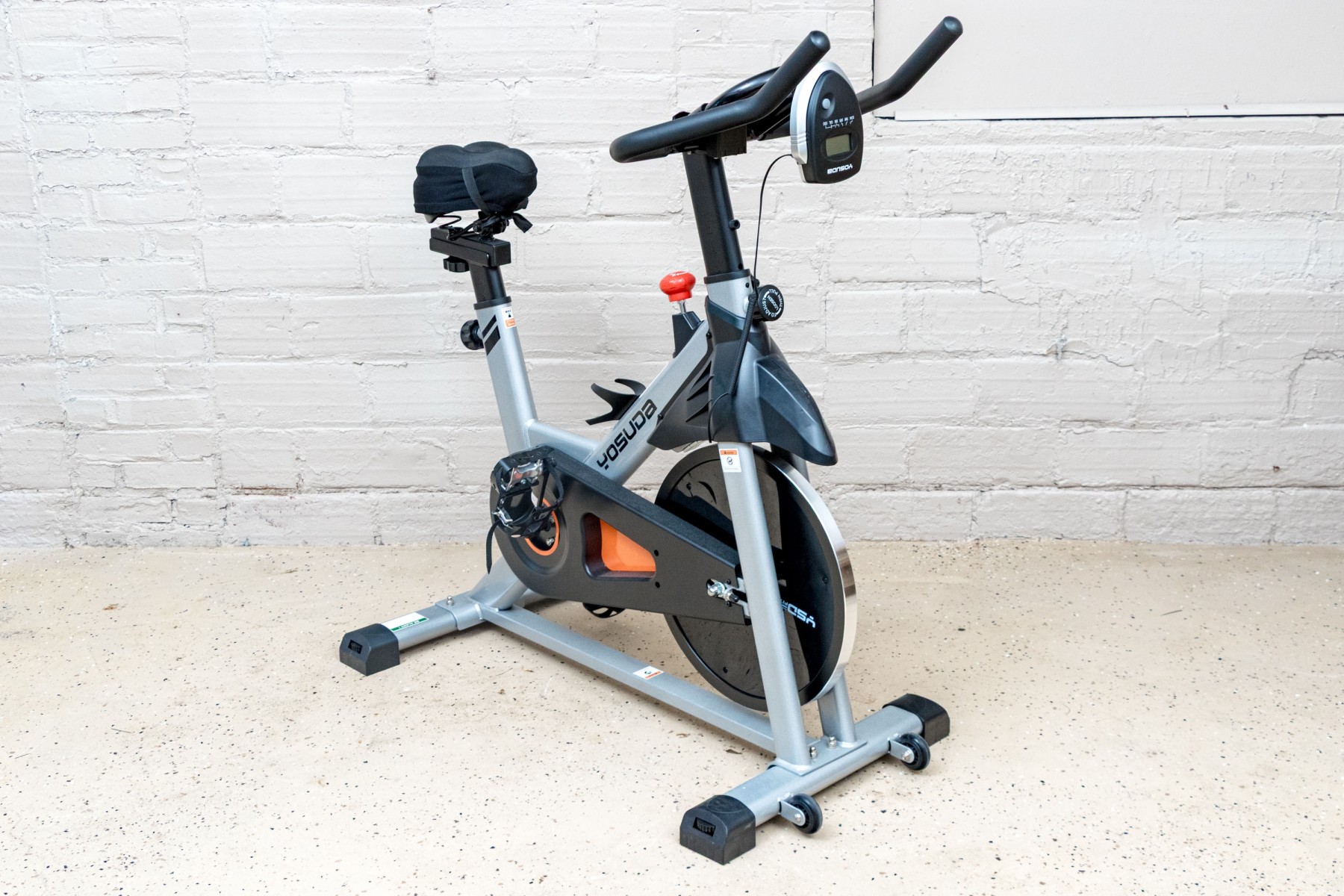 A wonderful Yosuda indoor stationary exercise bike in classic gray and black with a pop of orange at the center.