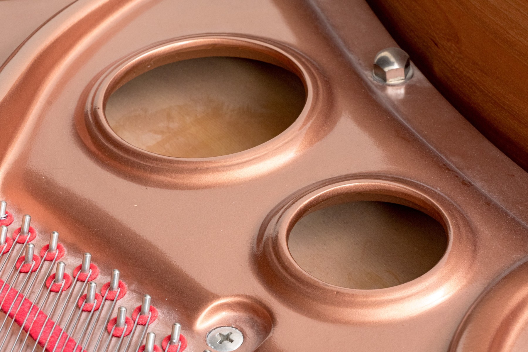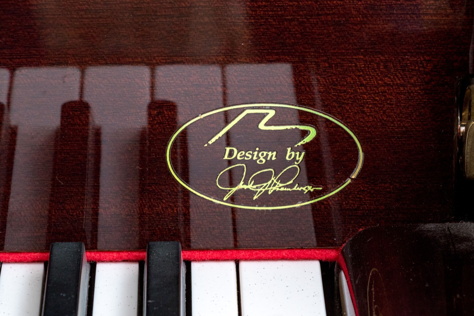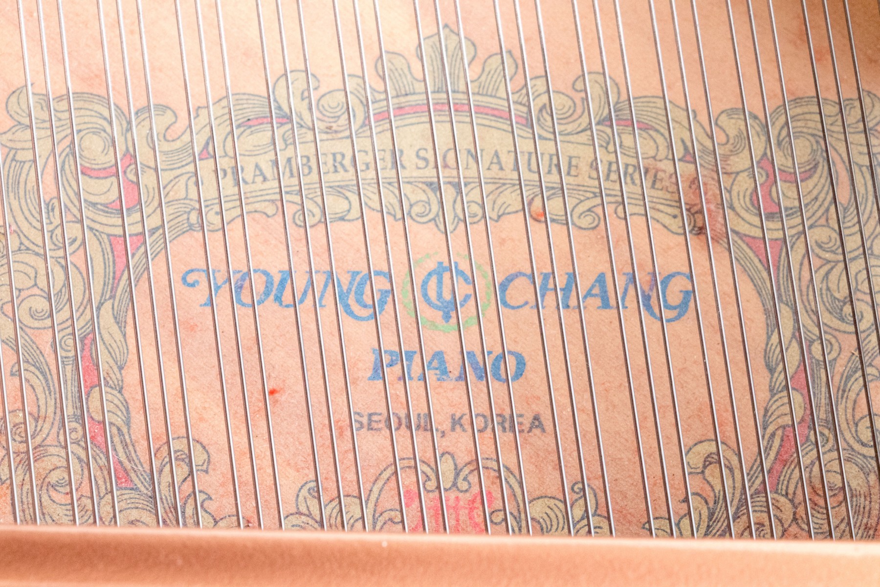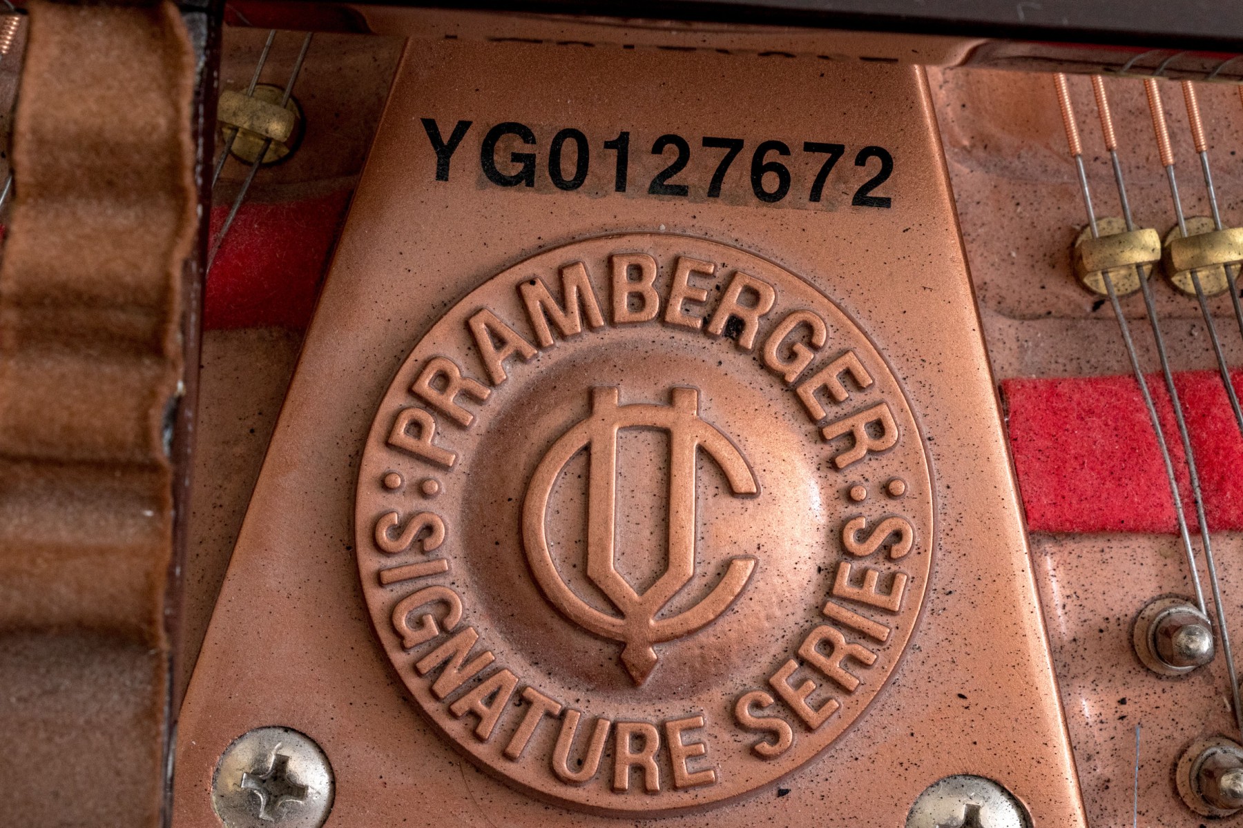 Young Chang YG0127672 Pramberger Signature Series baby grand piano in rich chocolate brown mahogany, accompanied by a piano bench.