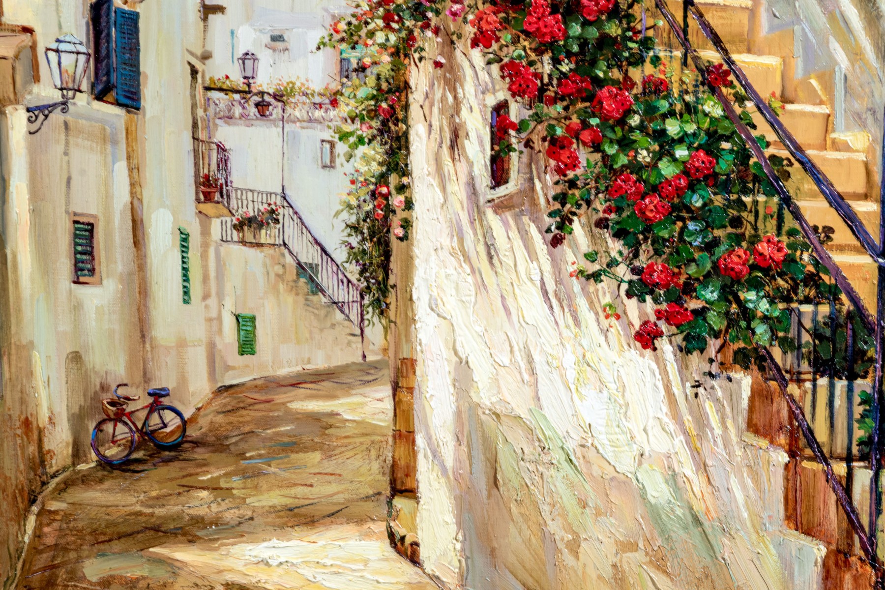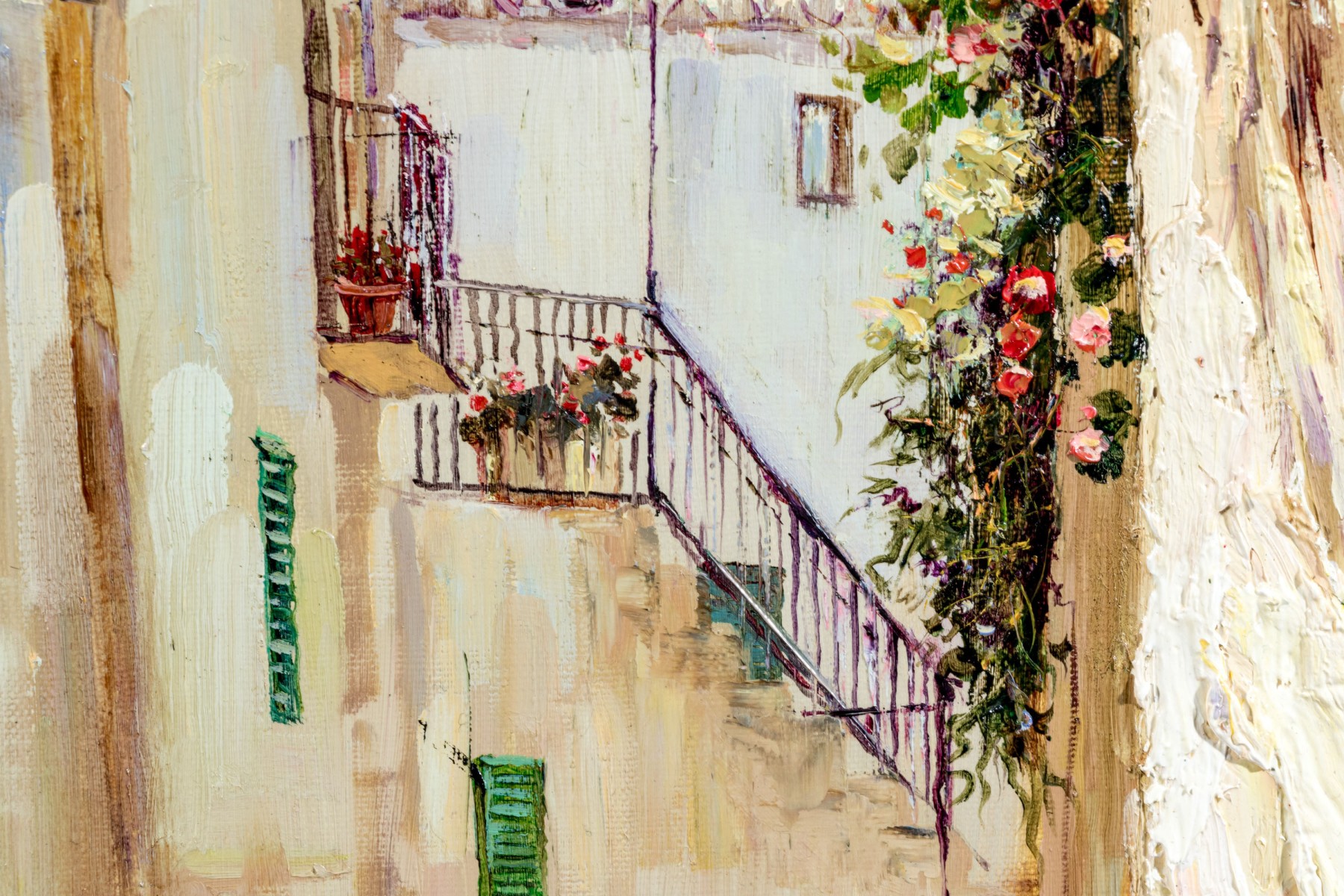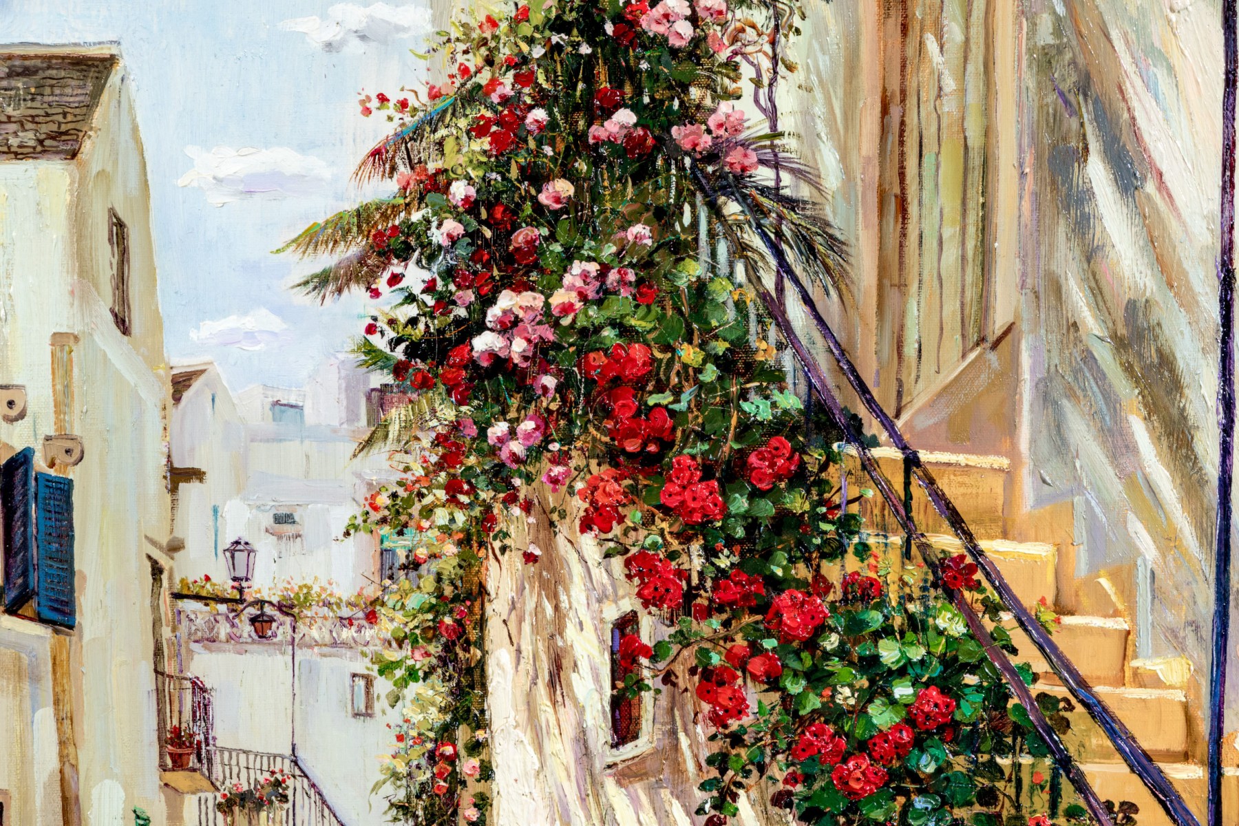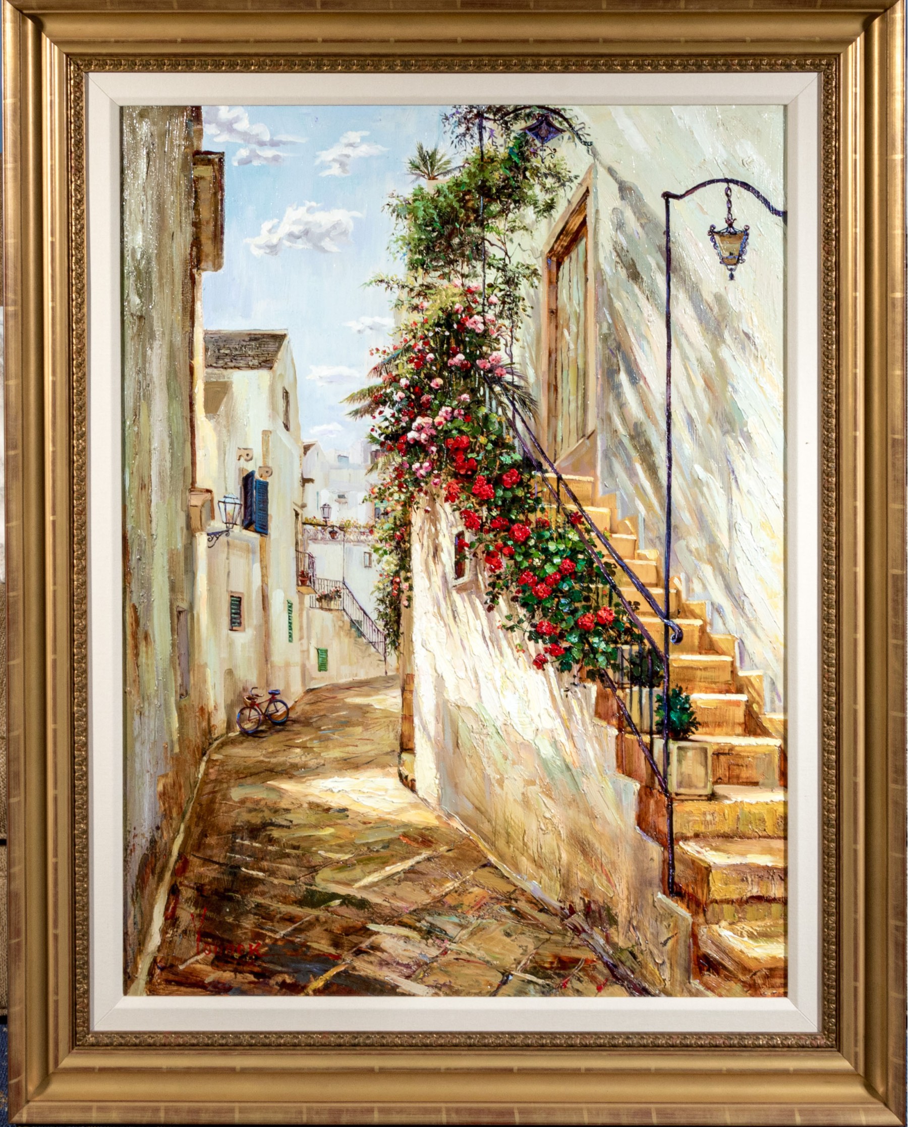 Younok Kim (South Korean, b. 1973) oil on canvas depicting a beautiful Italian alley flanked by smooth white buildings. Flowering foliage lines a stairway to the right. Signed lower left. Displayed in a gilt frame with a canvas liner.