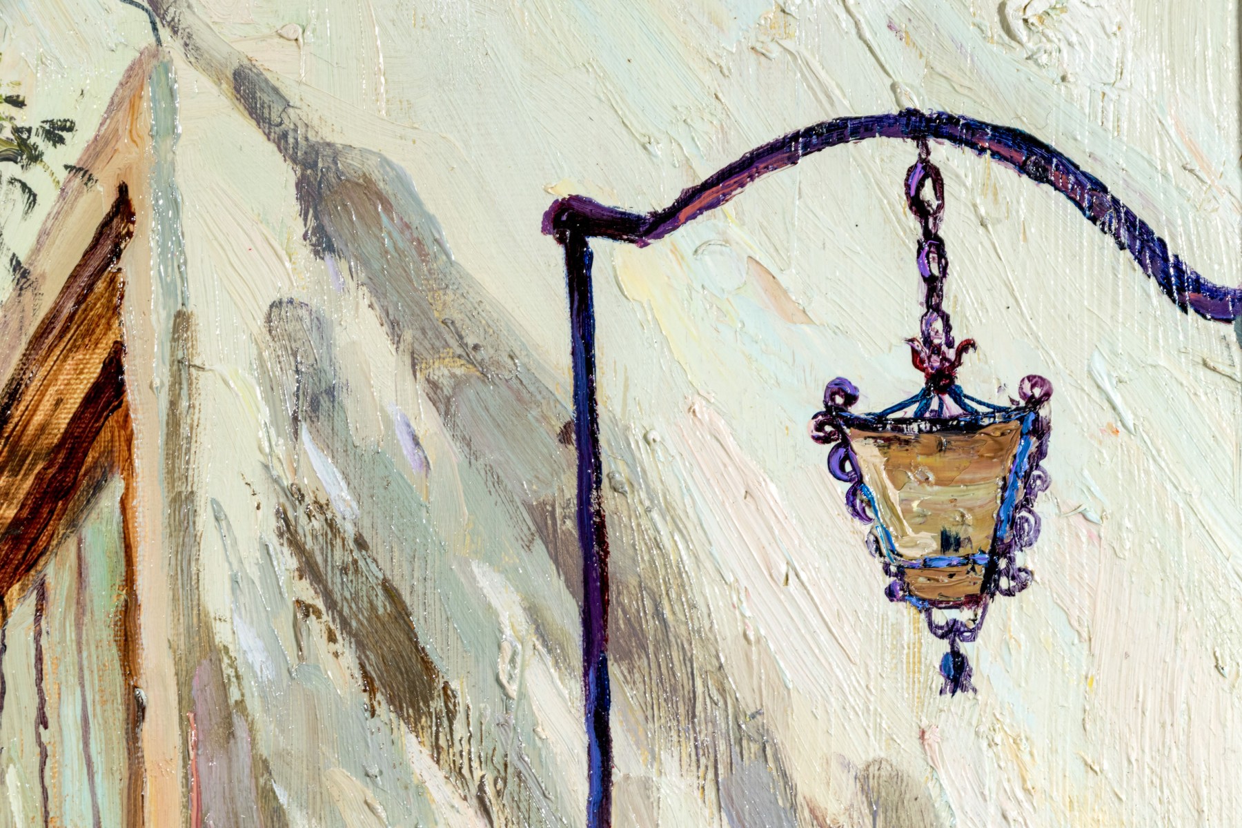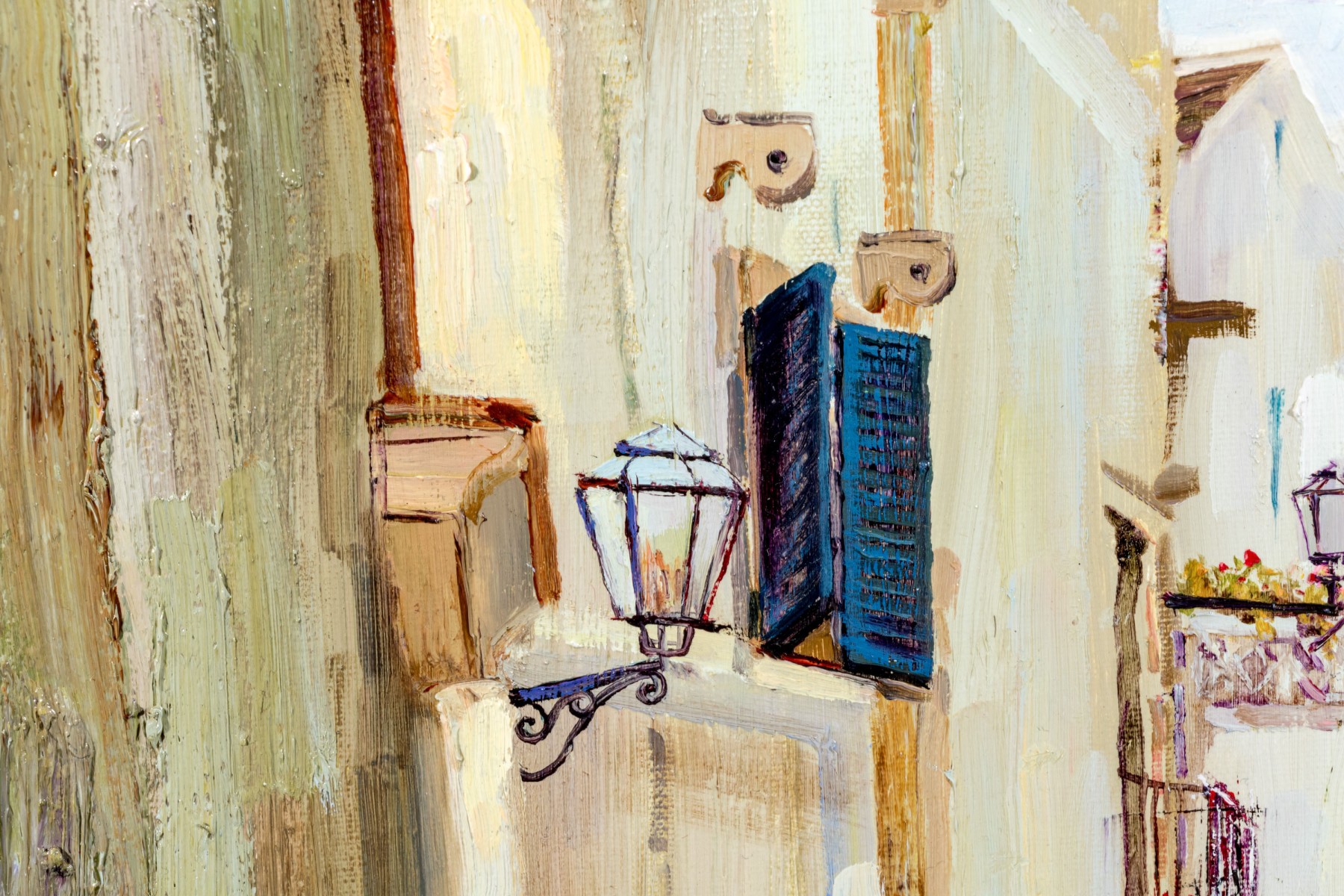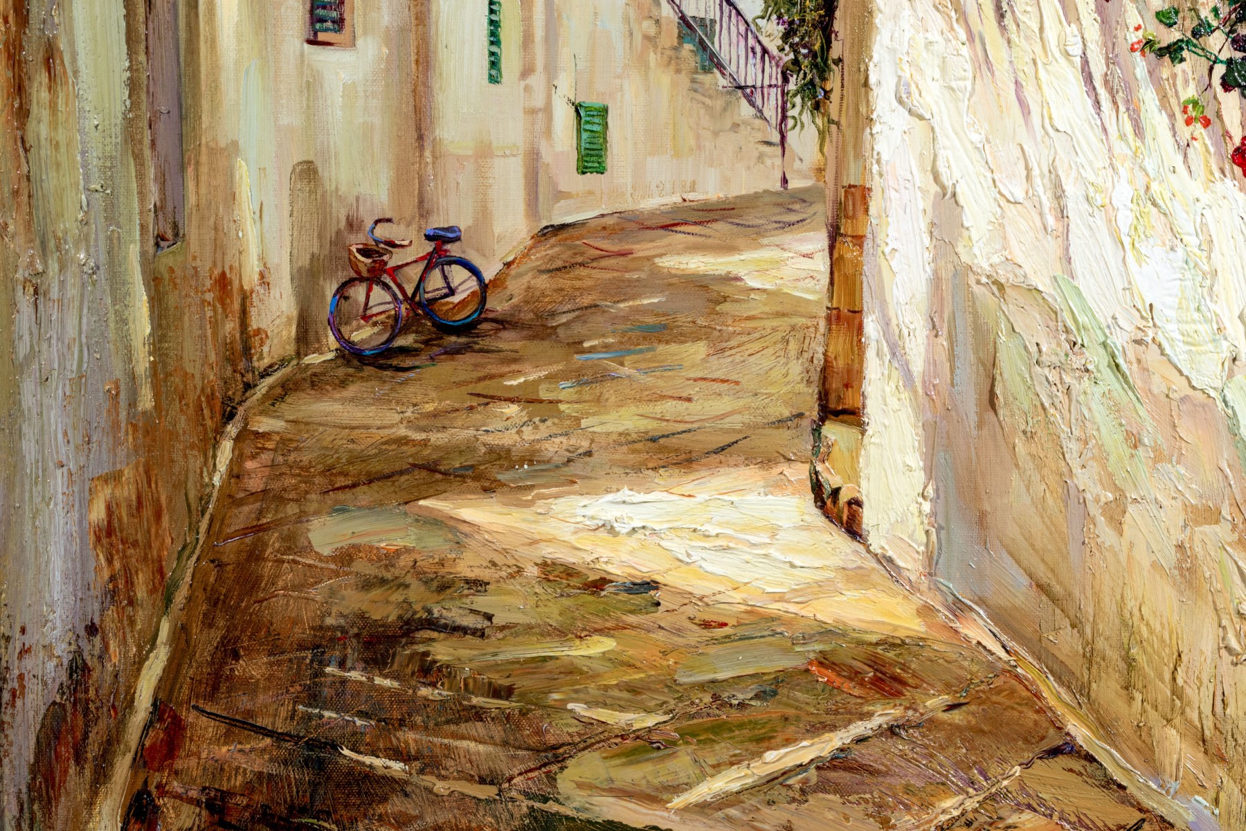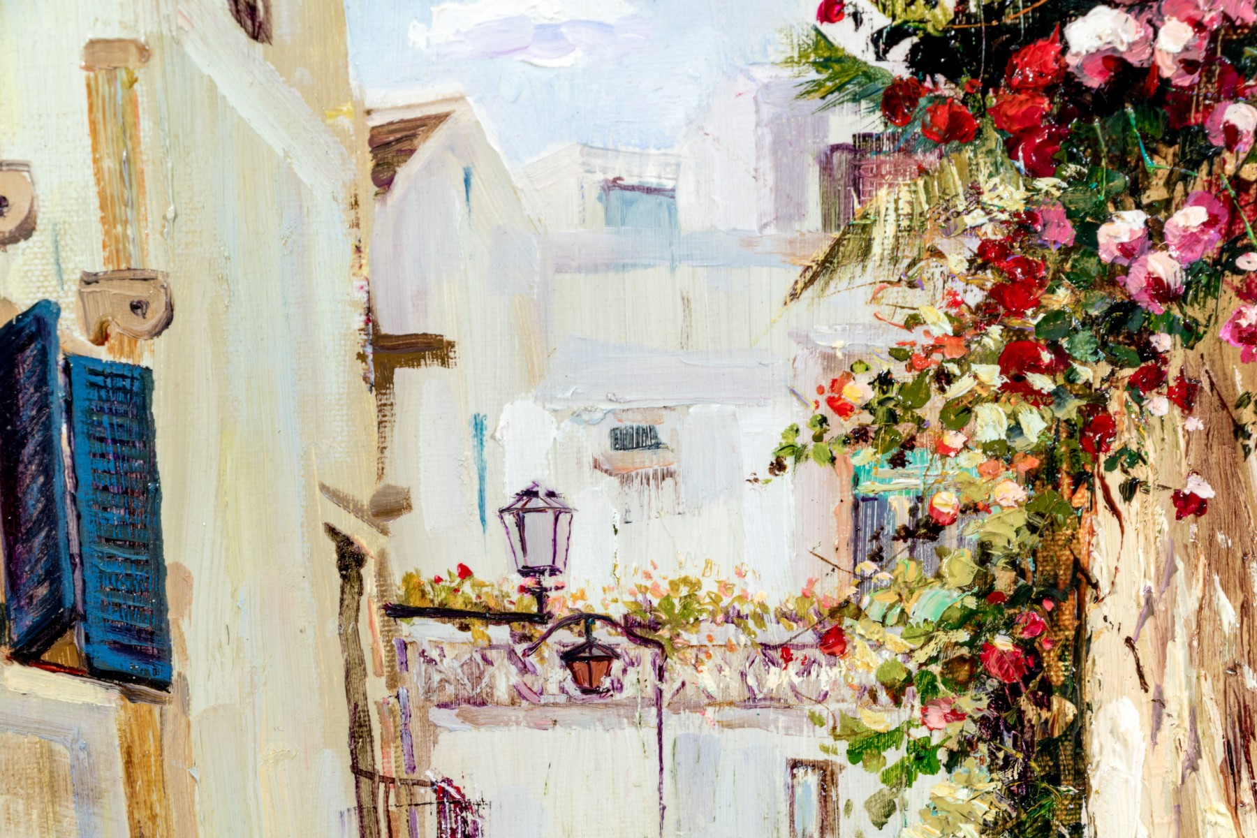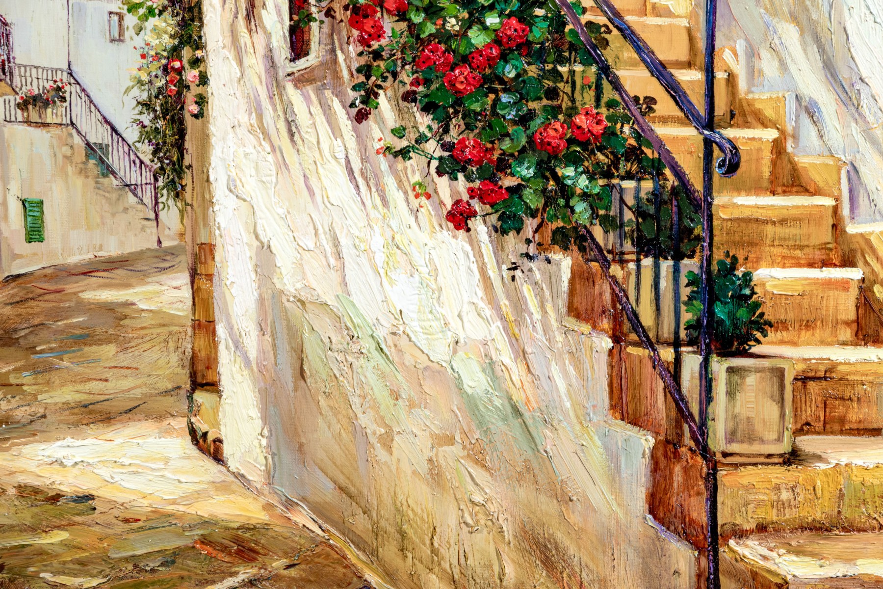 Younok Kim (South Korean, b. 1973) oil on canvas depicting a beautiful Italian alley flanked by smooth white buildings. Flowering foliage lines a stairway to the right. Signed lower left. Displayed in a gilt frame with a canvas liner.