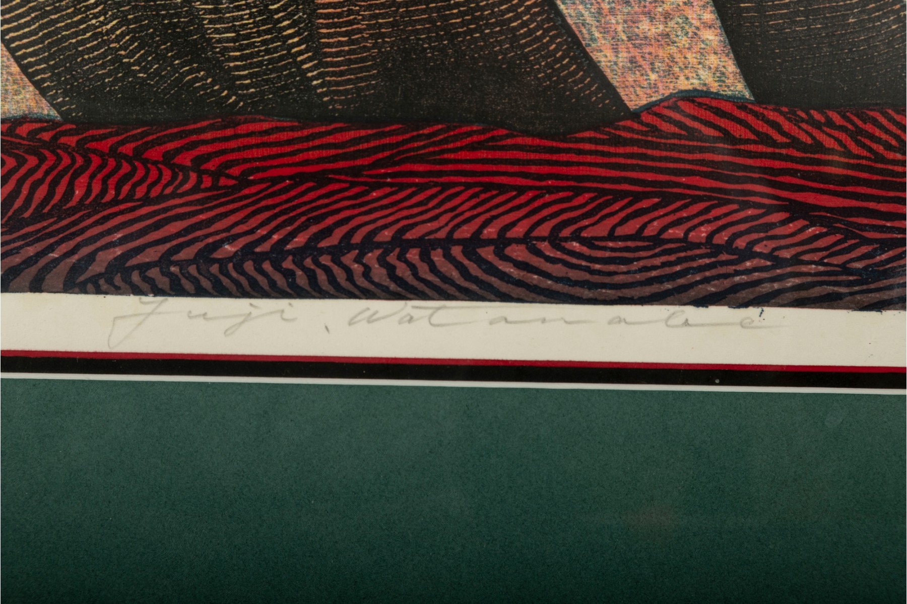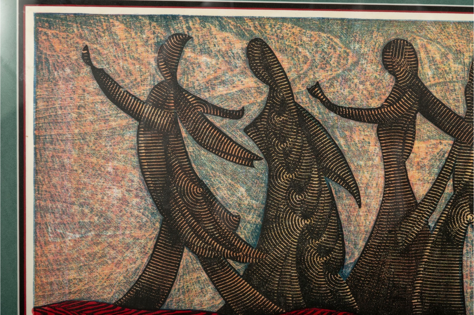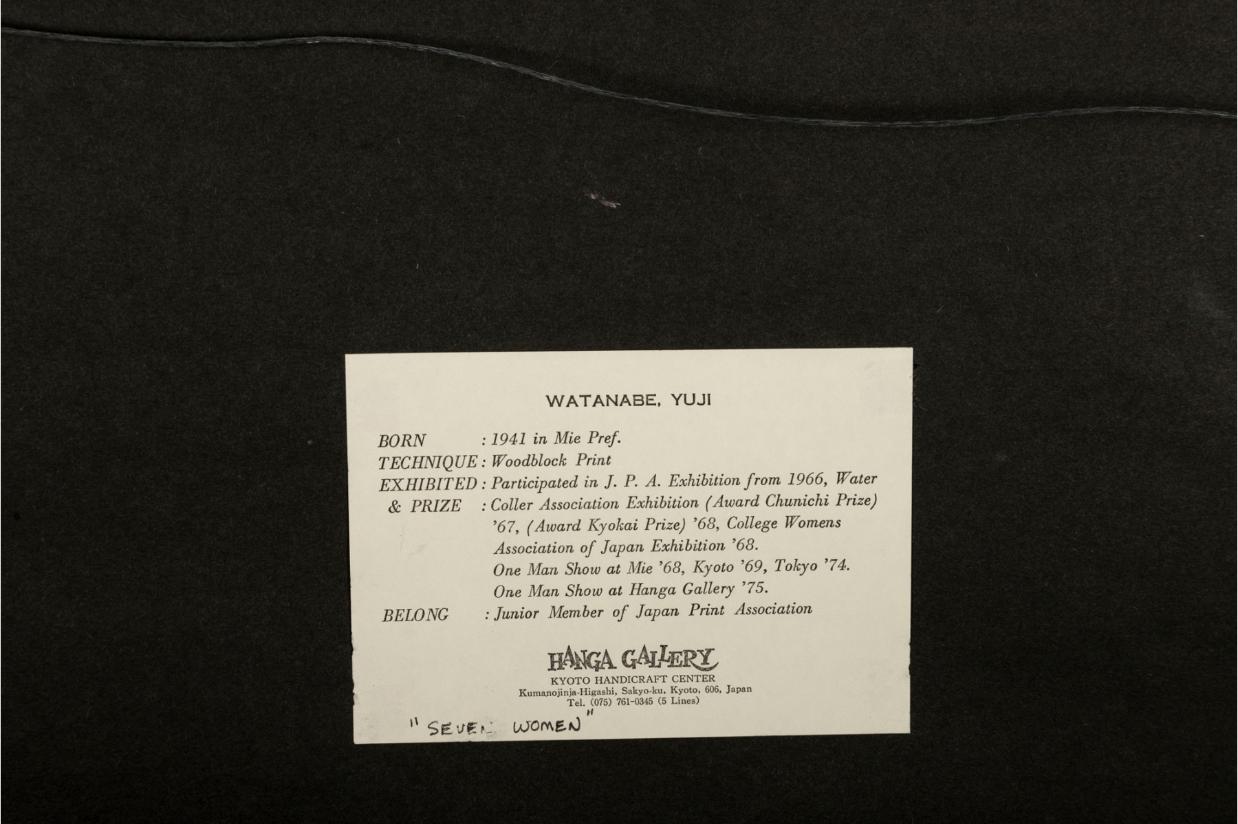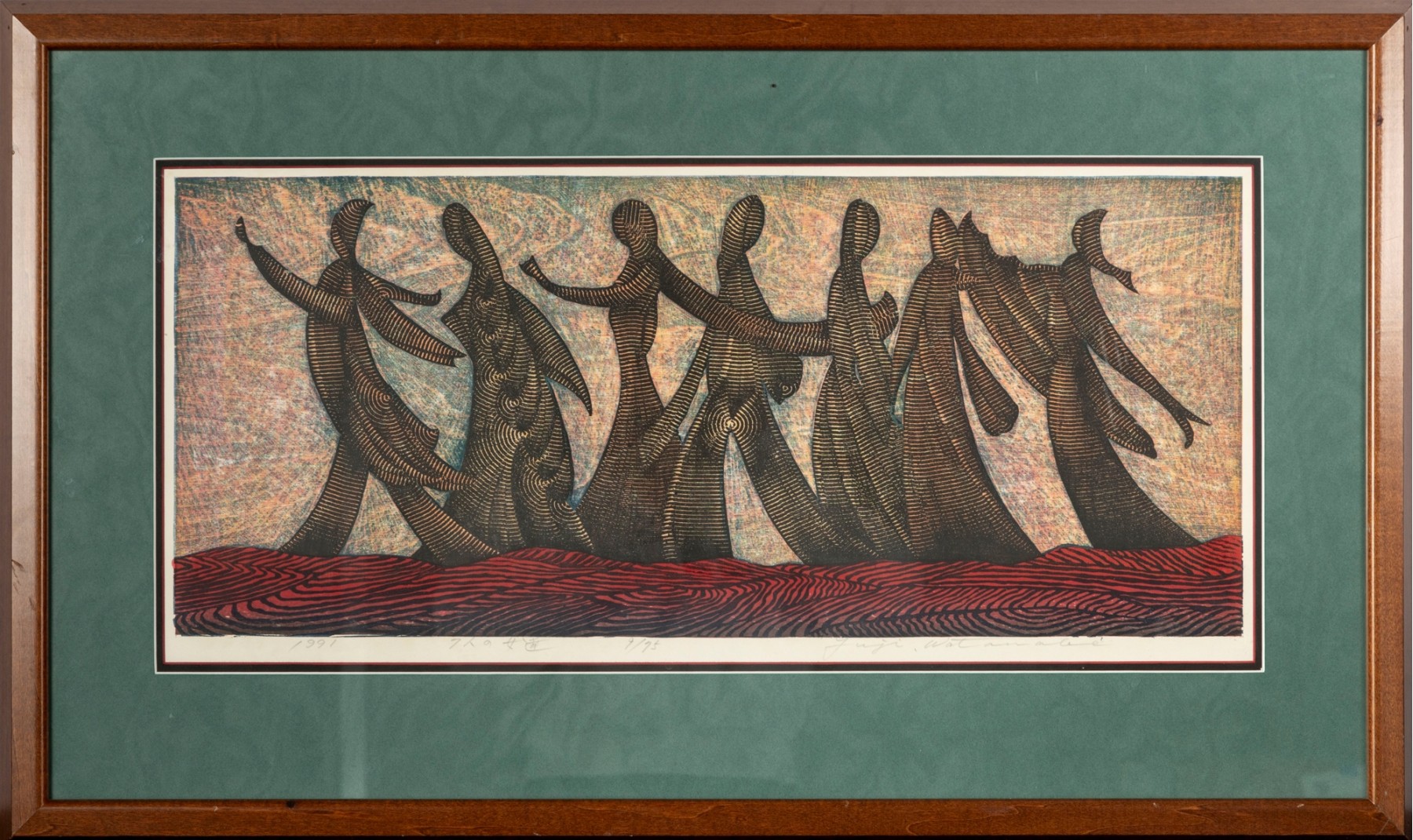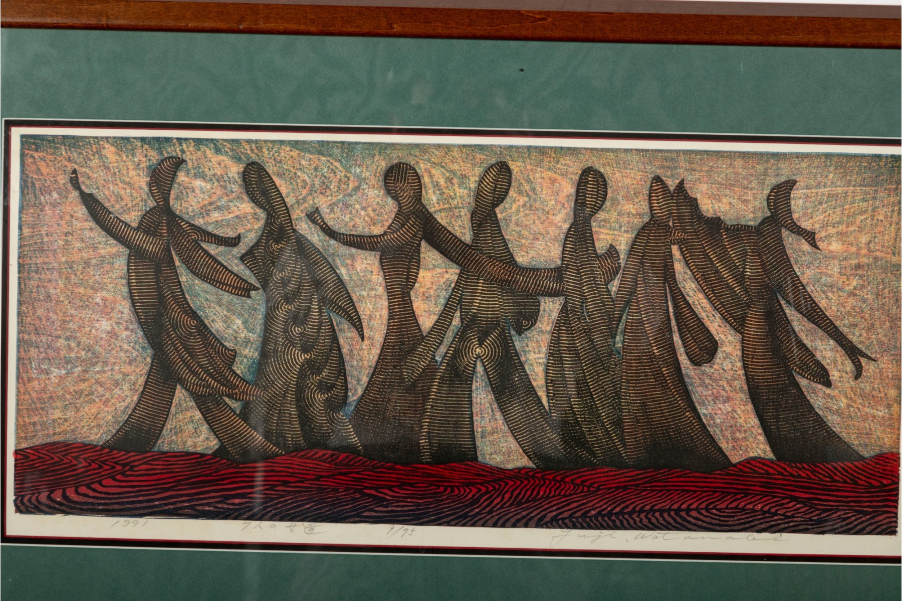 Yuji Watanabe (Japanese, b. 1941) "Seven Women" woodblock print depicting a procession of seven figures in profile rendered with striated linework adding excellent texture that compliments a swirling red ground and orange textured background. Pencil signed lower right, titled and numbered 9/75 lower center, and dated 1991 lower left. With a typed label affixed to the verso providing additional information. Displayed glazed and matted in a warm brown wood frame.
