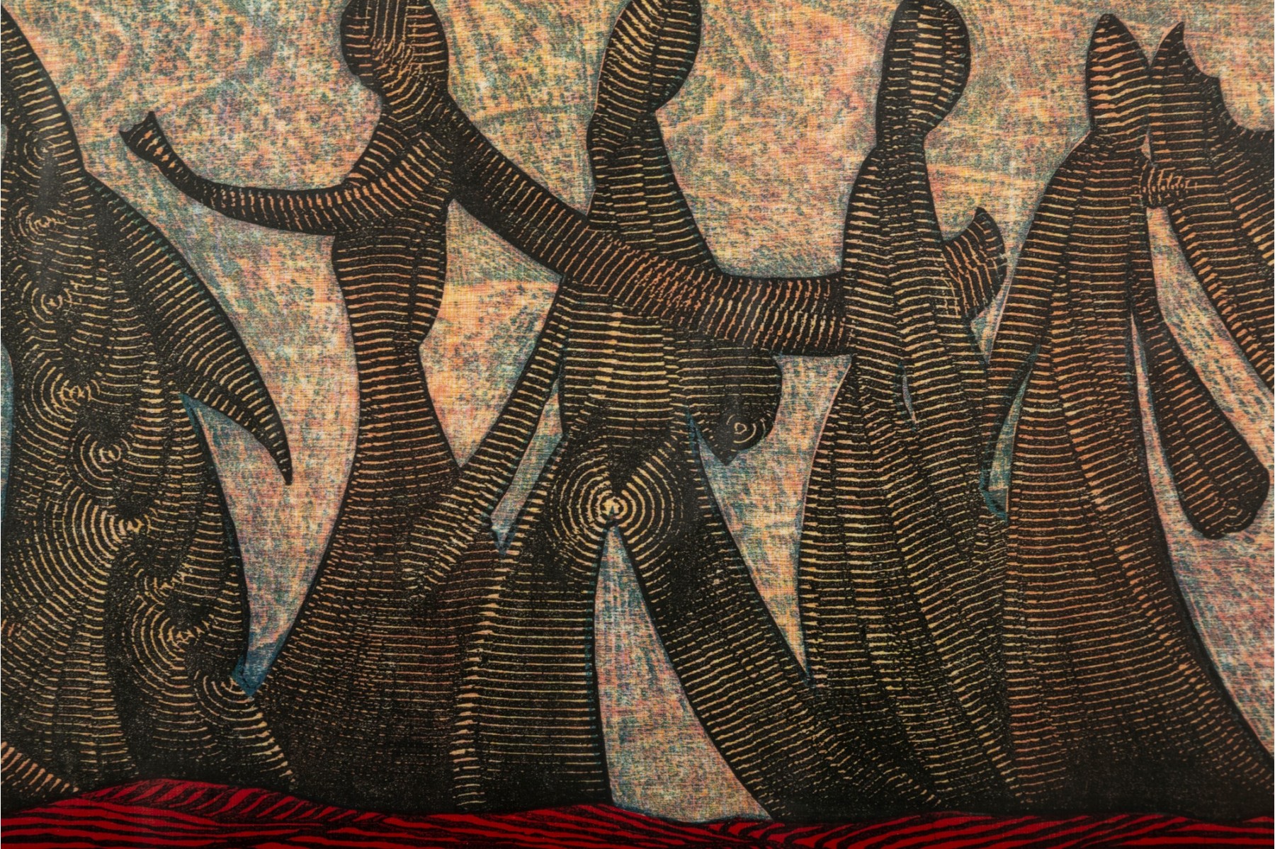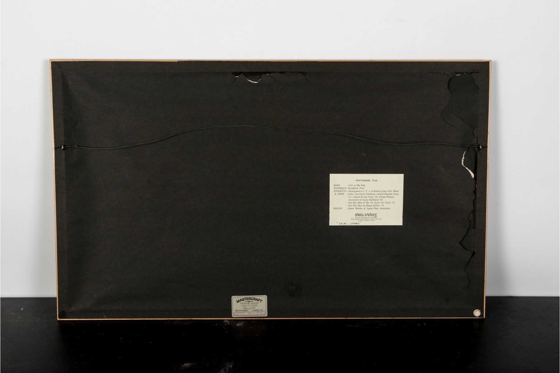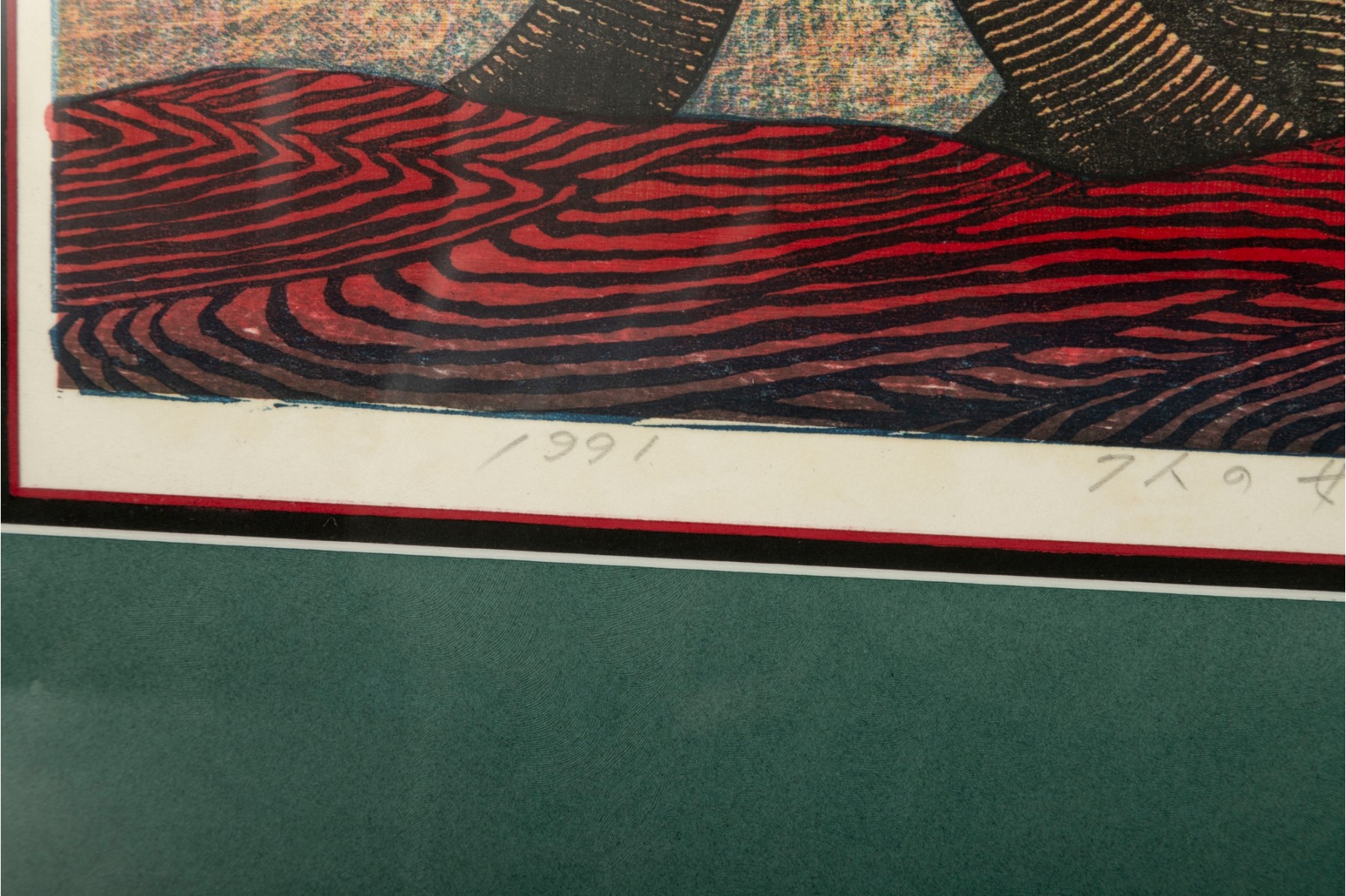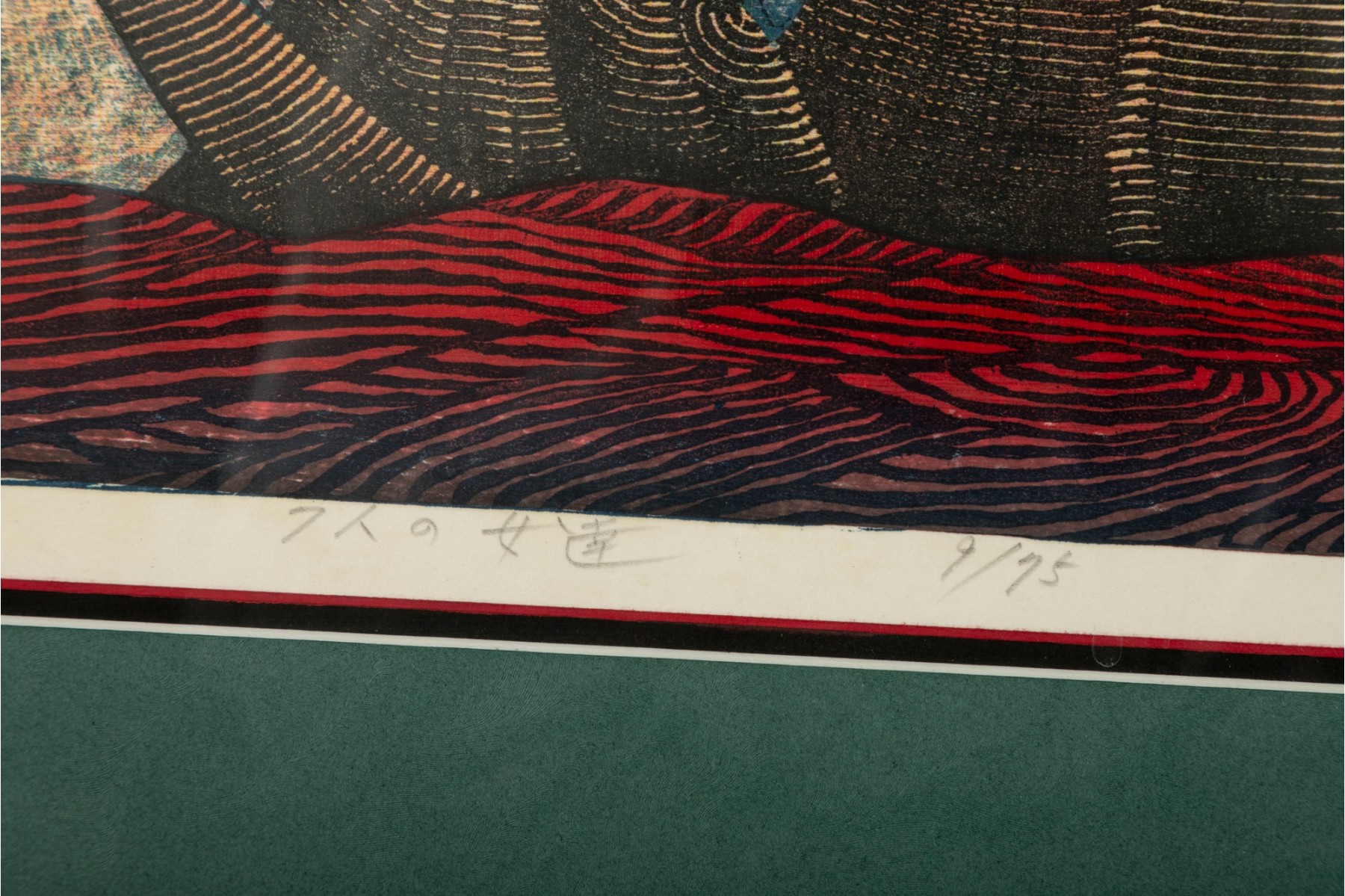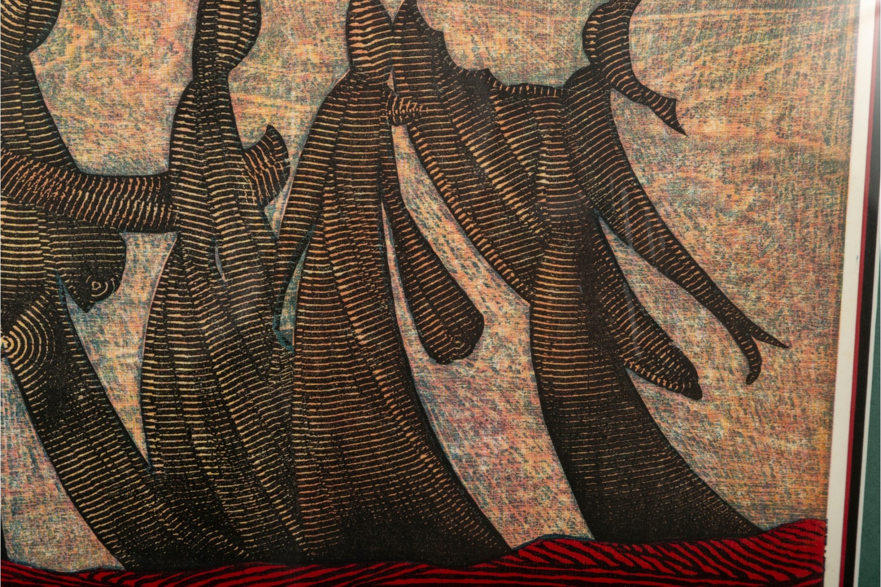 Yuji Watanabe (Japanese, b. 1941) "Seven Women" woodblock print depicting a procession of seven figures in profile rendered with striated linework adding excellent texture that compliments a swirling red ground and orange textured background. Pencil signed lower right, titled and numbered 9/75 lower center, and dated 1991 lower left. With a typed label affixed to the verso providing additional information. Displayed glazed and matted in a warm brown wood frame.