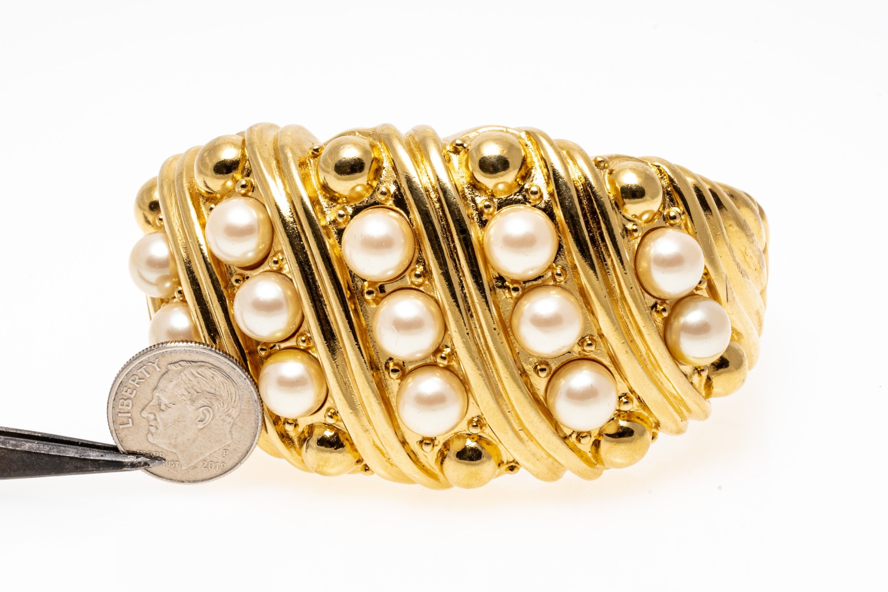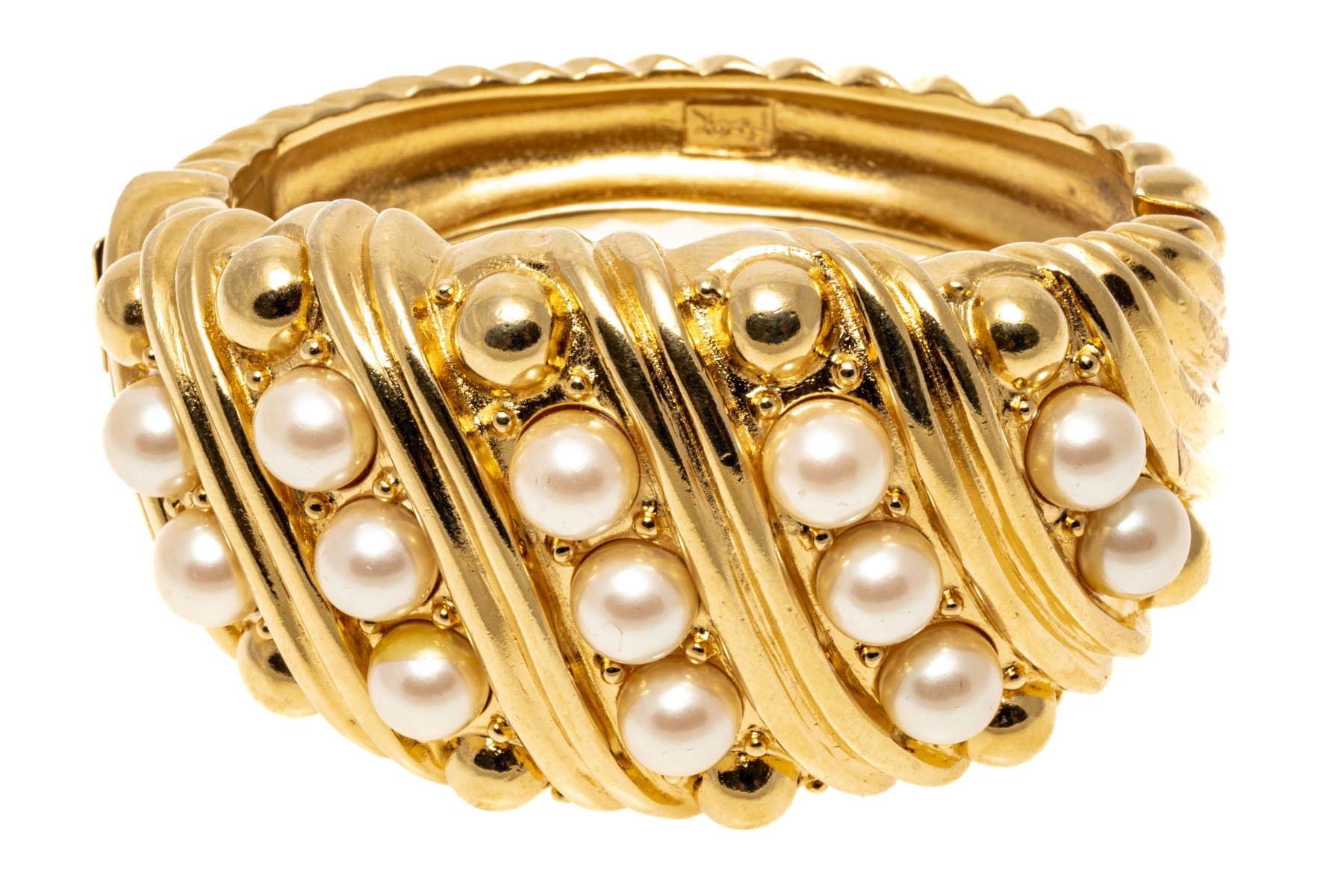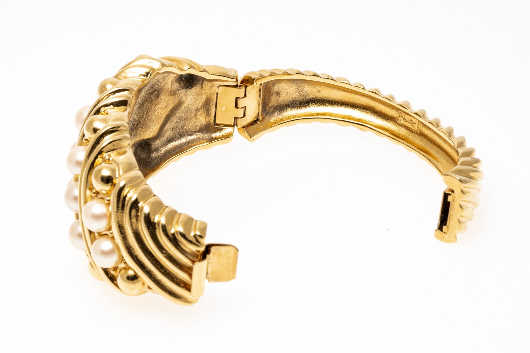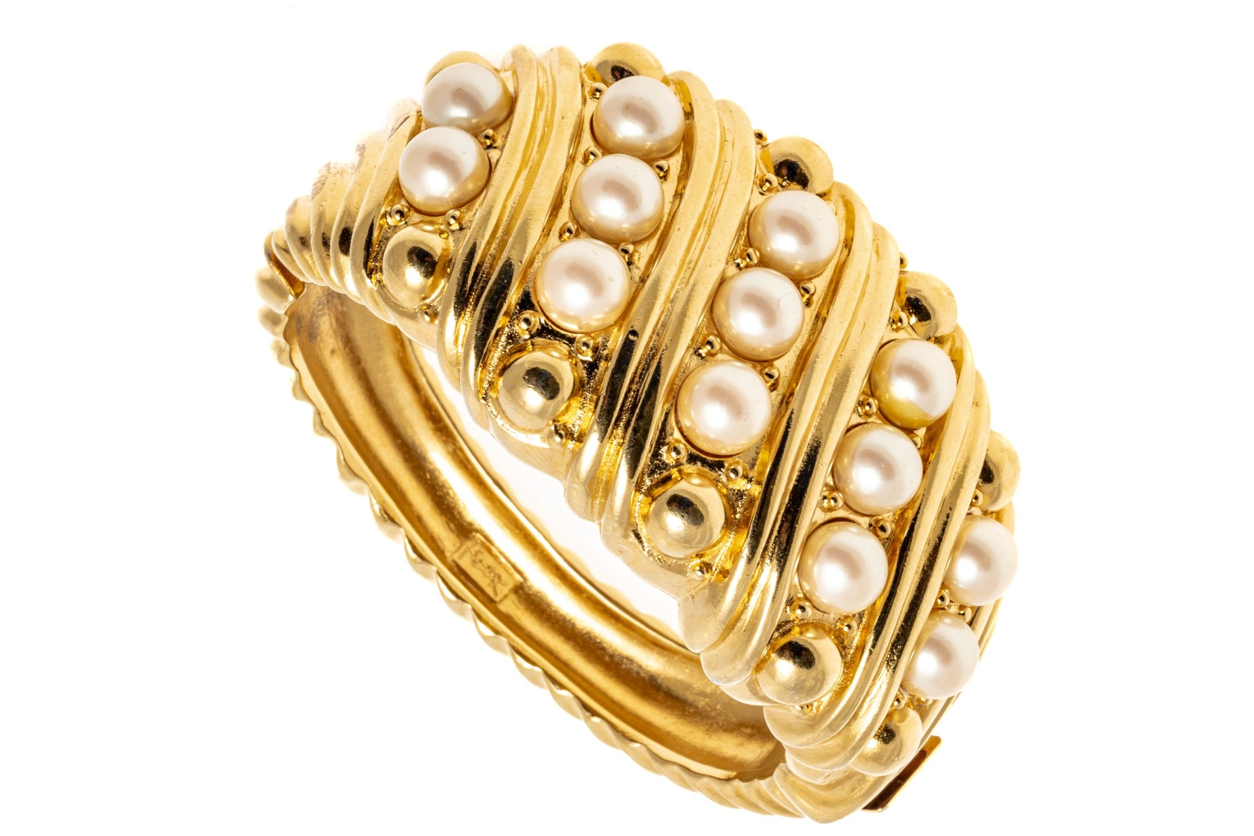 Yves Saint Laurent hinged bangle bracelet. The bracelet has a wide face set with faux white pearls and a beadwork design. Box clasp with safety latch.