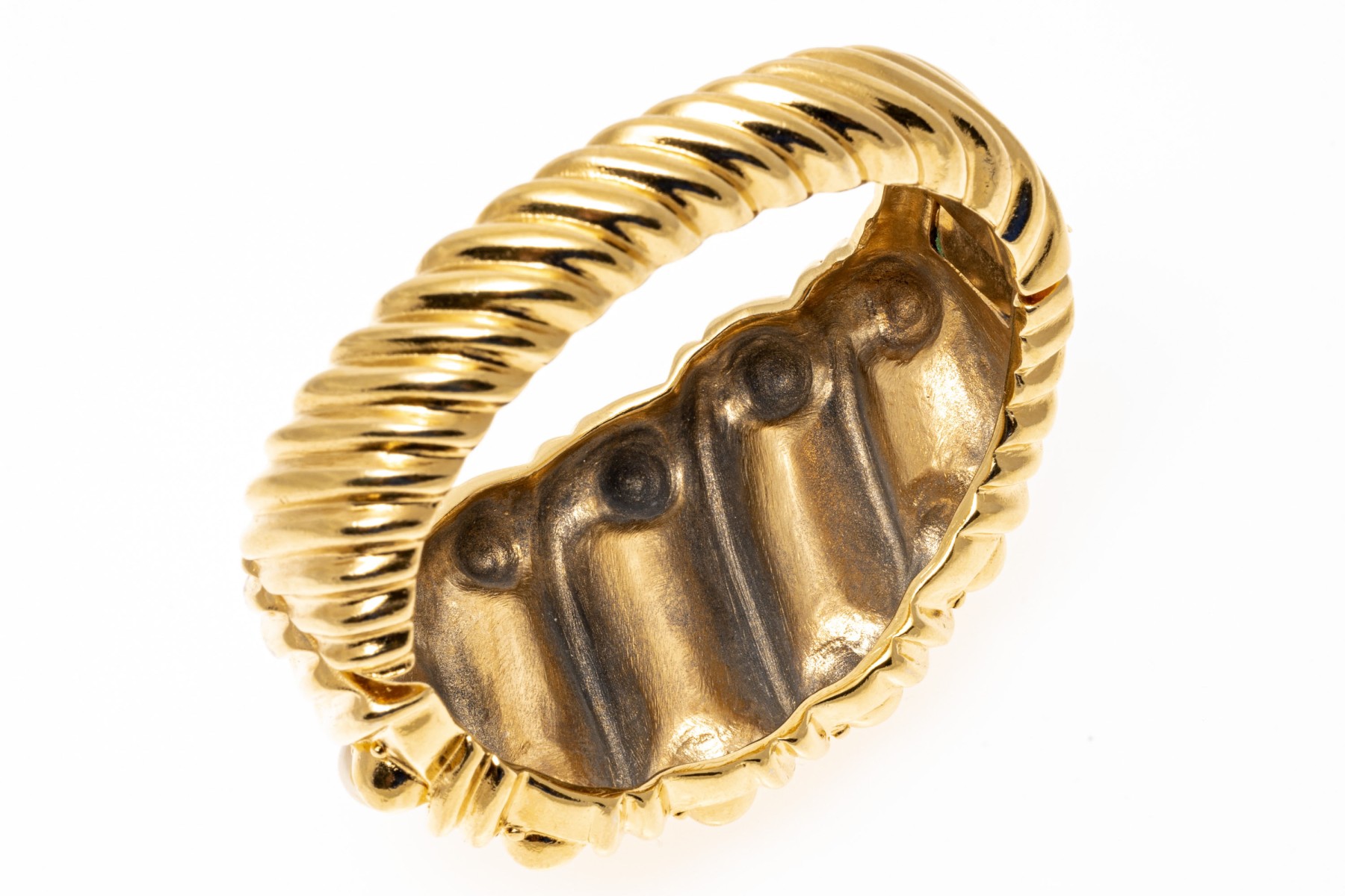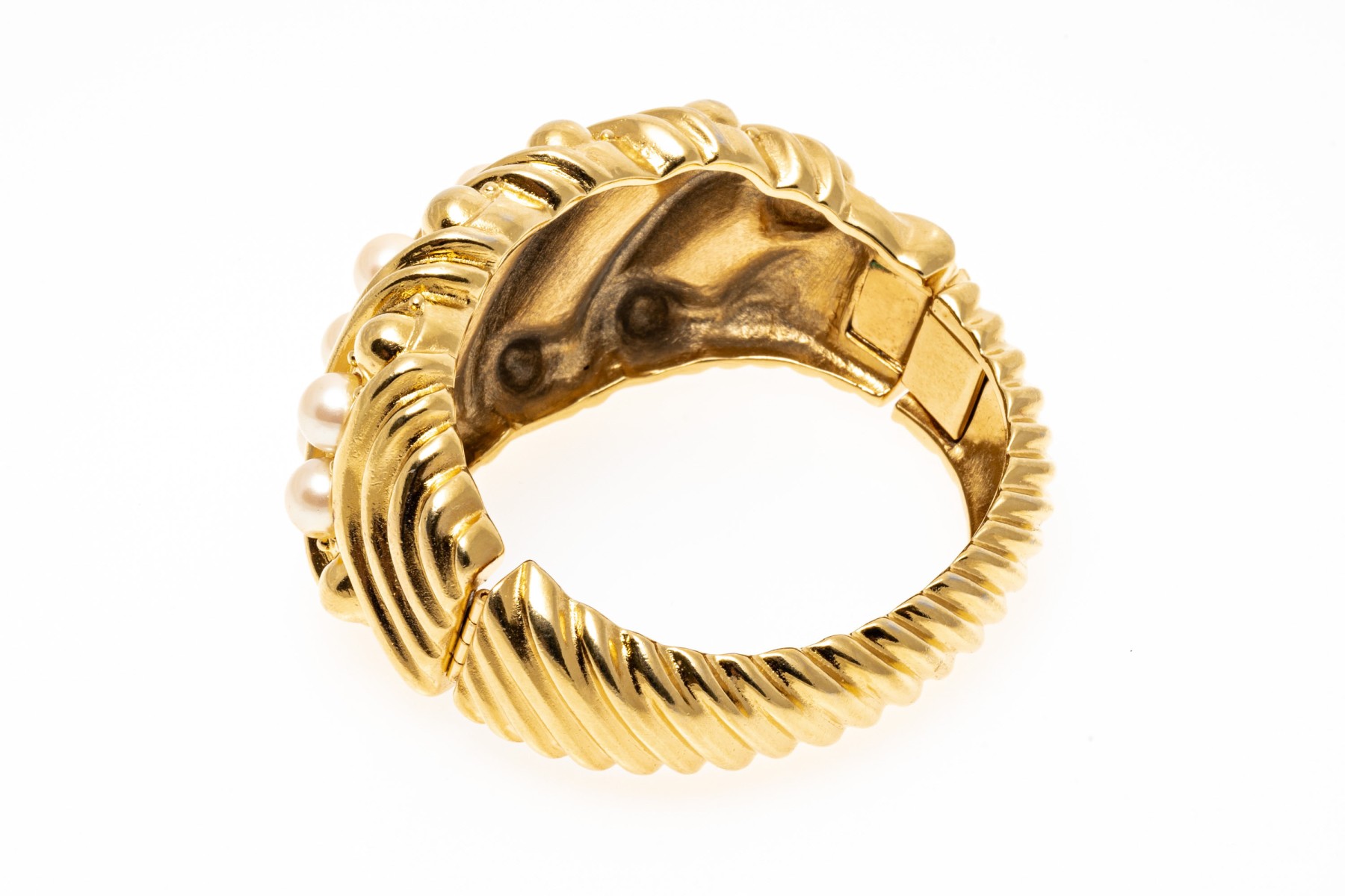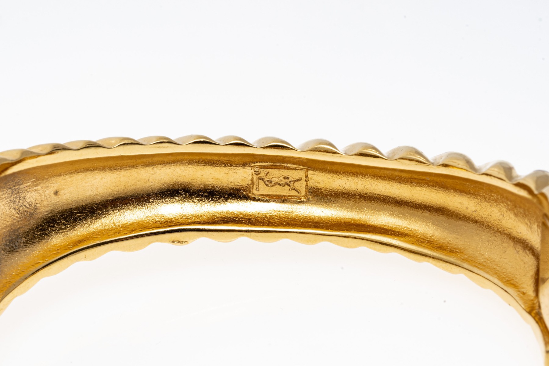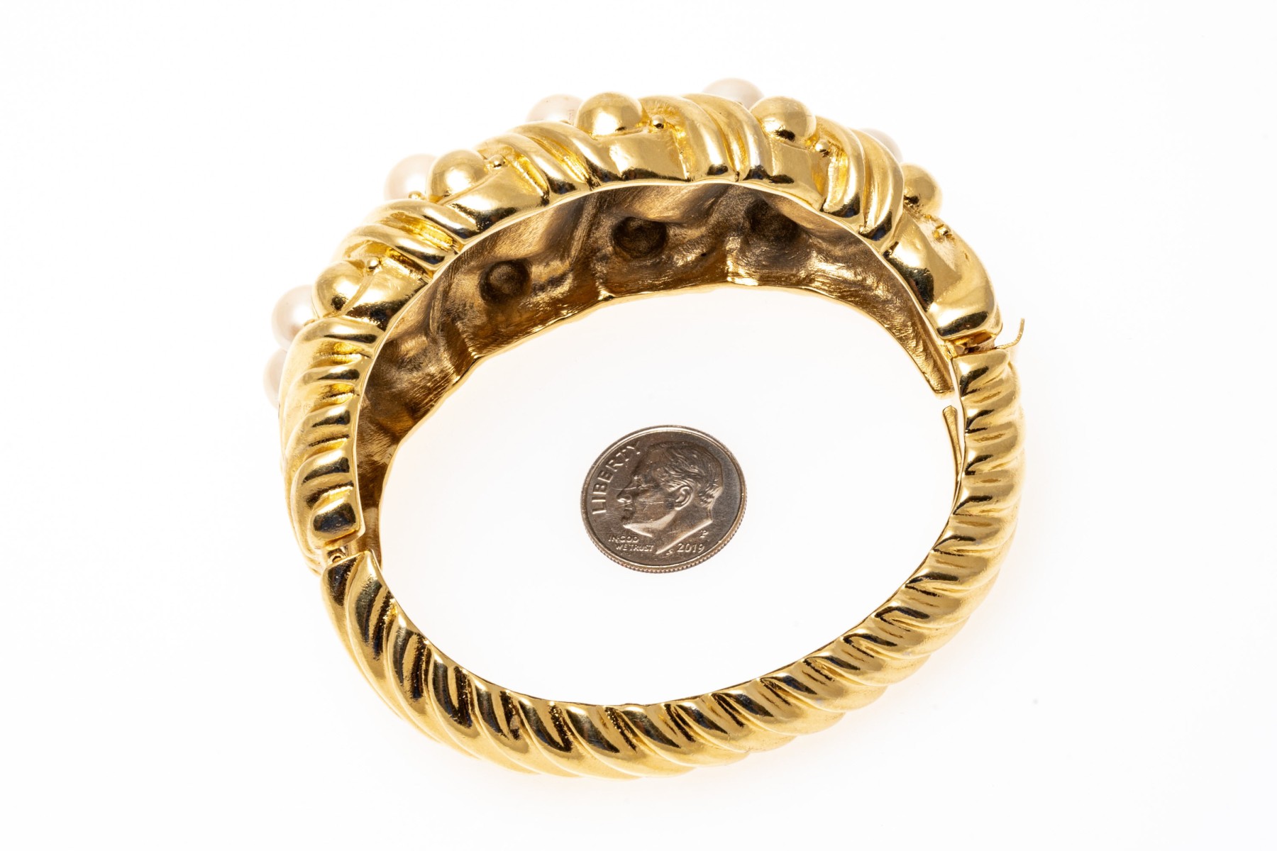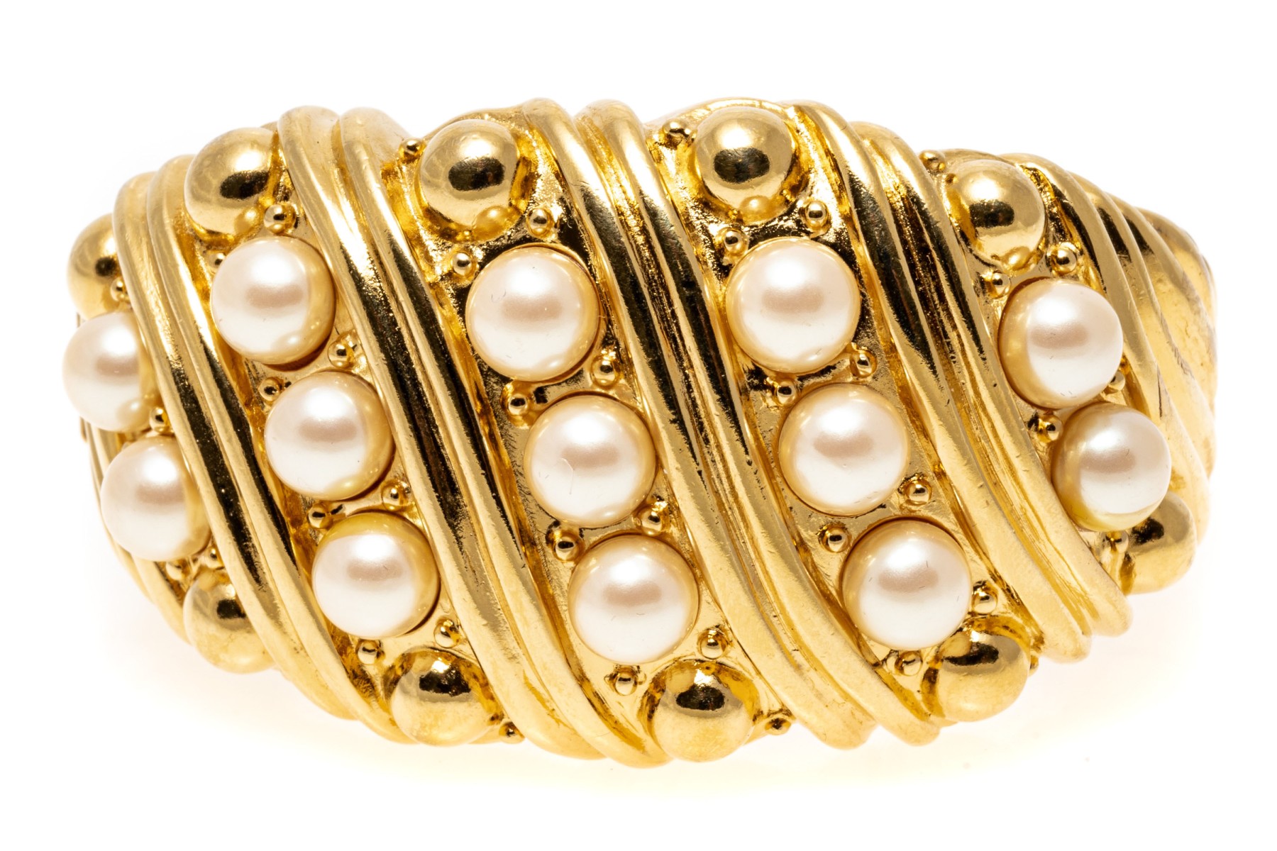 Yves Saint Laurent hinged bangle bracelet. The bracelet has a wide face set with faux white pearls and a beadwork design. Box clasp with safety latch.