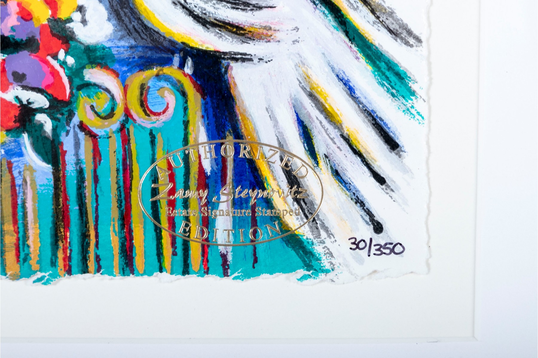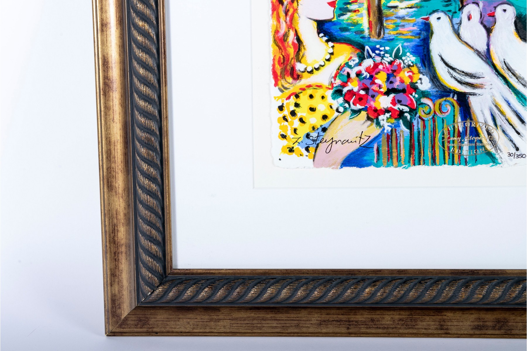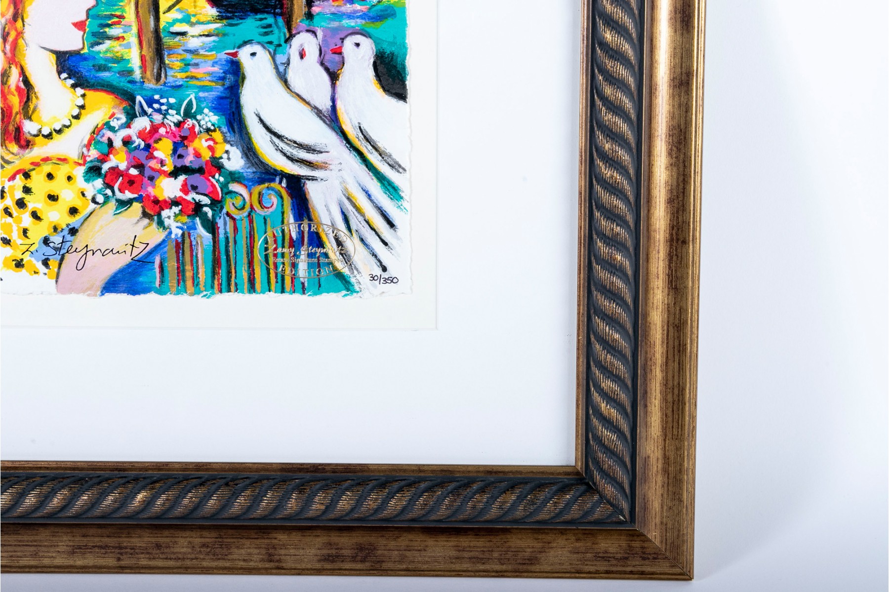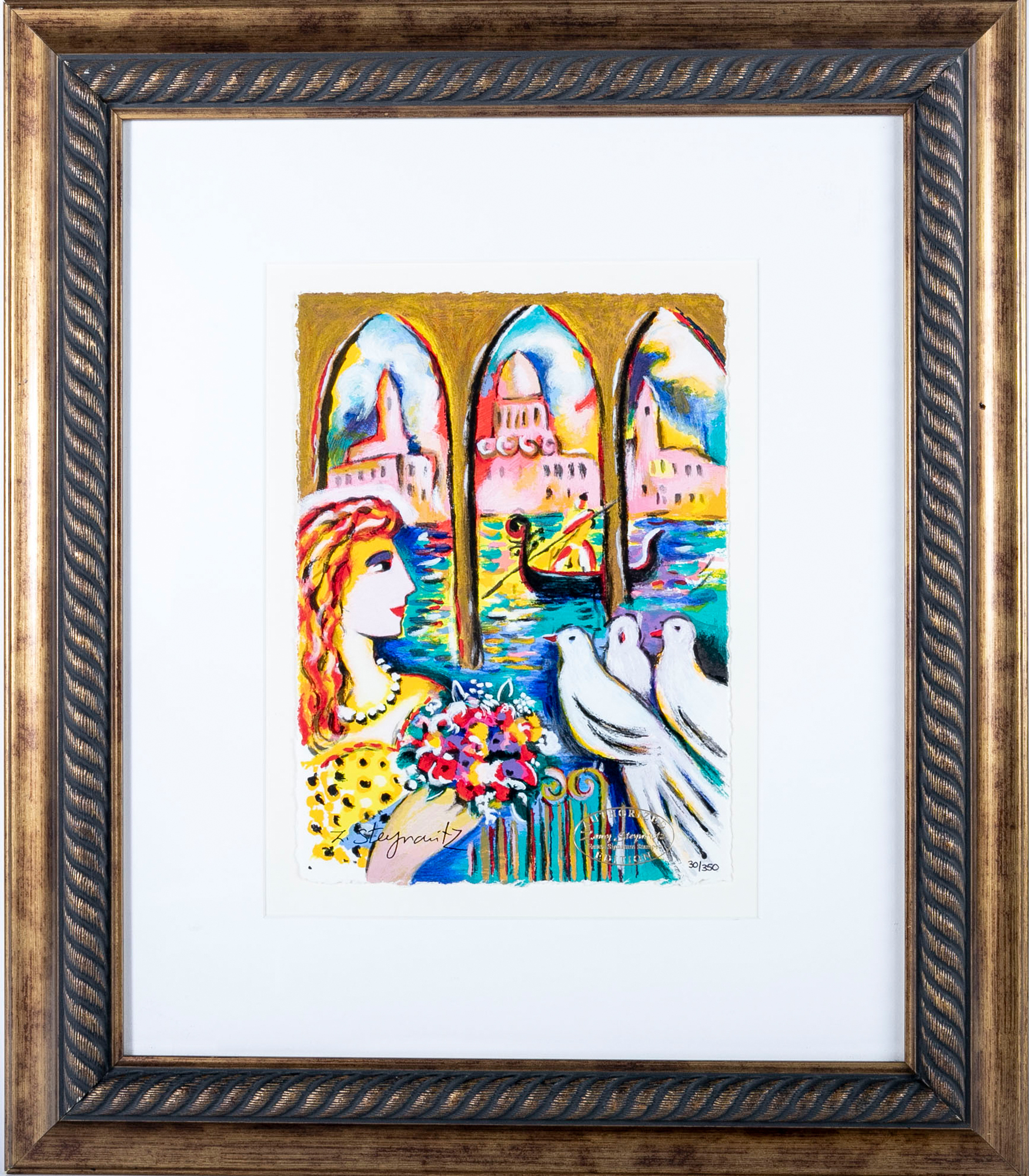 Zamy Steynovitz (Polish, 1951-2000) "Dove's Beauty" serigraph depicting a woman with shoulder-length, wavy red hair, wearing a pearl necklace and a yellow dress while holding a bouquet of flowers next to a trio of doves. She stands in profile against a vibrant, dappled background with a figure riding a boat on teal, blue, and yellow water. A large pink building lines the horizon, seen through tall, gilt arches. Ink signed lower left, numbered 30/350 lower right, with an embossed stamp lower right. The piece is mounted against a cream background, displayed behind plexiglass with a white mat in a gilt frame with a domed border of gadrooned relief.