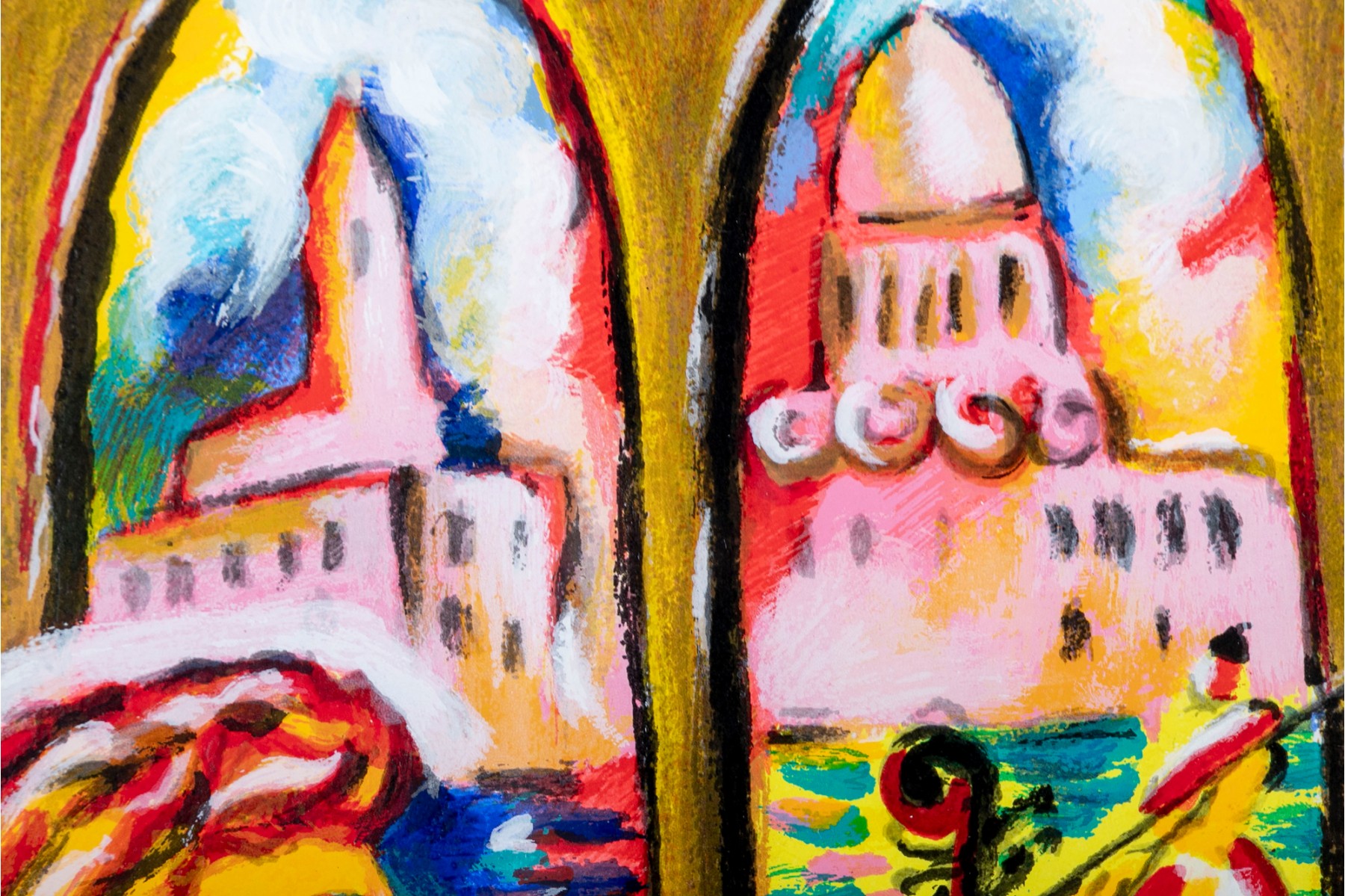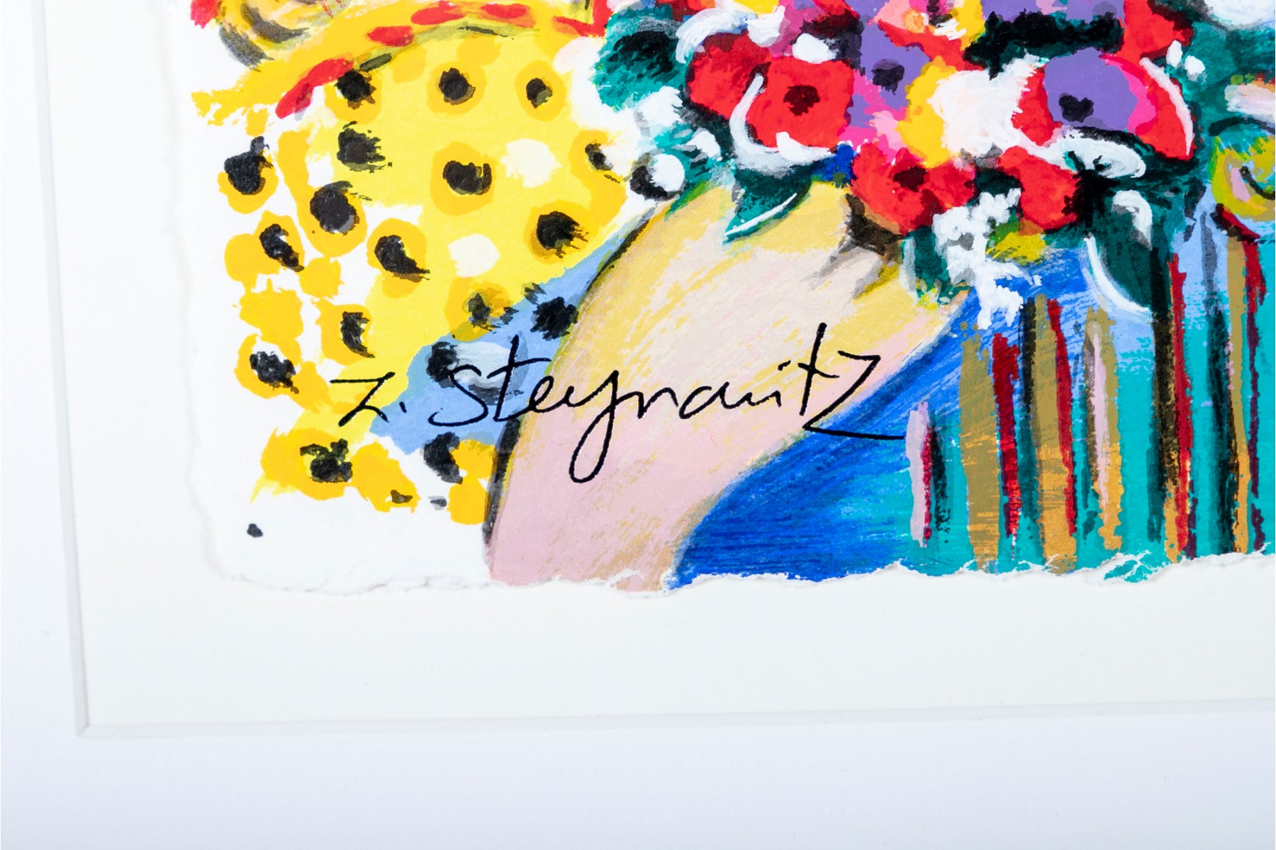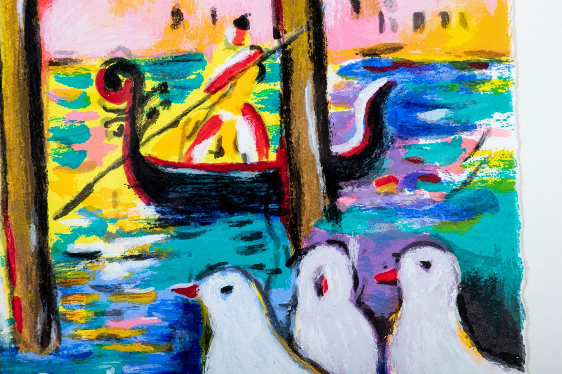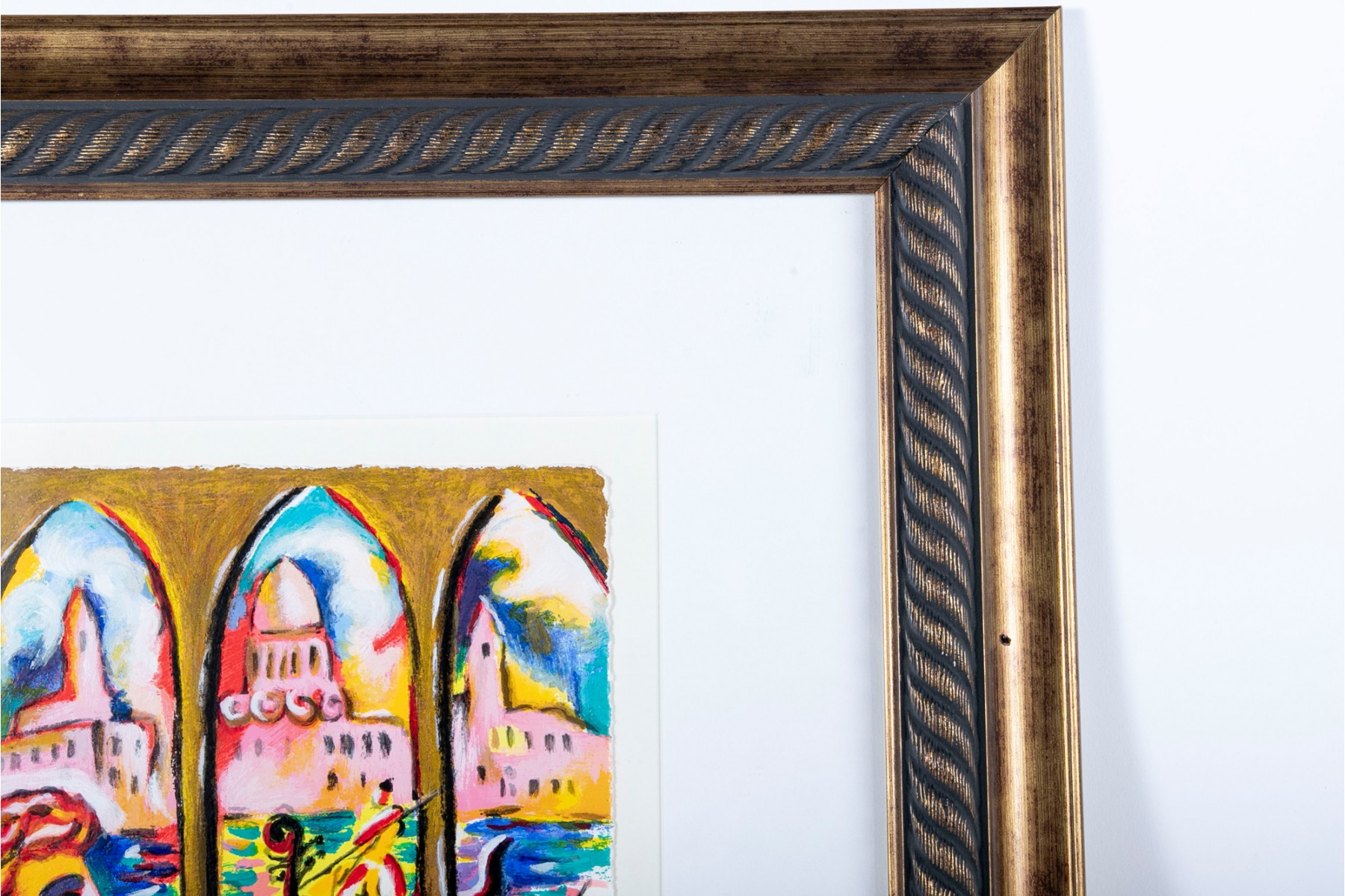Zamy Steynovitz (Polish, 1951-2000) "Dove's Beauty" serigraph depicting a woman with shoulder-length, wavy red hair, wearing a pearl necklace and a yellow dress while holding a bouquet of flowers next to a trio of doves. She stands in profile against a vibrant, dappled background with a figure riding a boat on teal, blue, and yellow water. A large pink building lines the horizon, seen through tall, gilt arches. Ink signed lower left, numbered 30/350 lower right, with an embossed stamp lower right. The piece is mounted against a cream background, displayed behind plexiglass with a white mat in a gilt frame with a domed border of gadrooned relief.