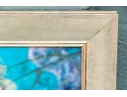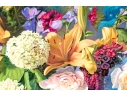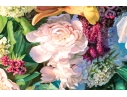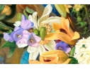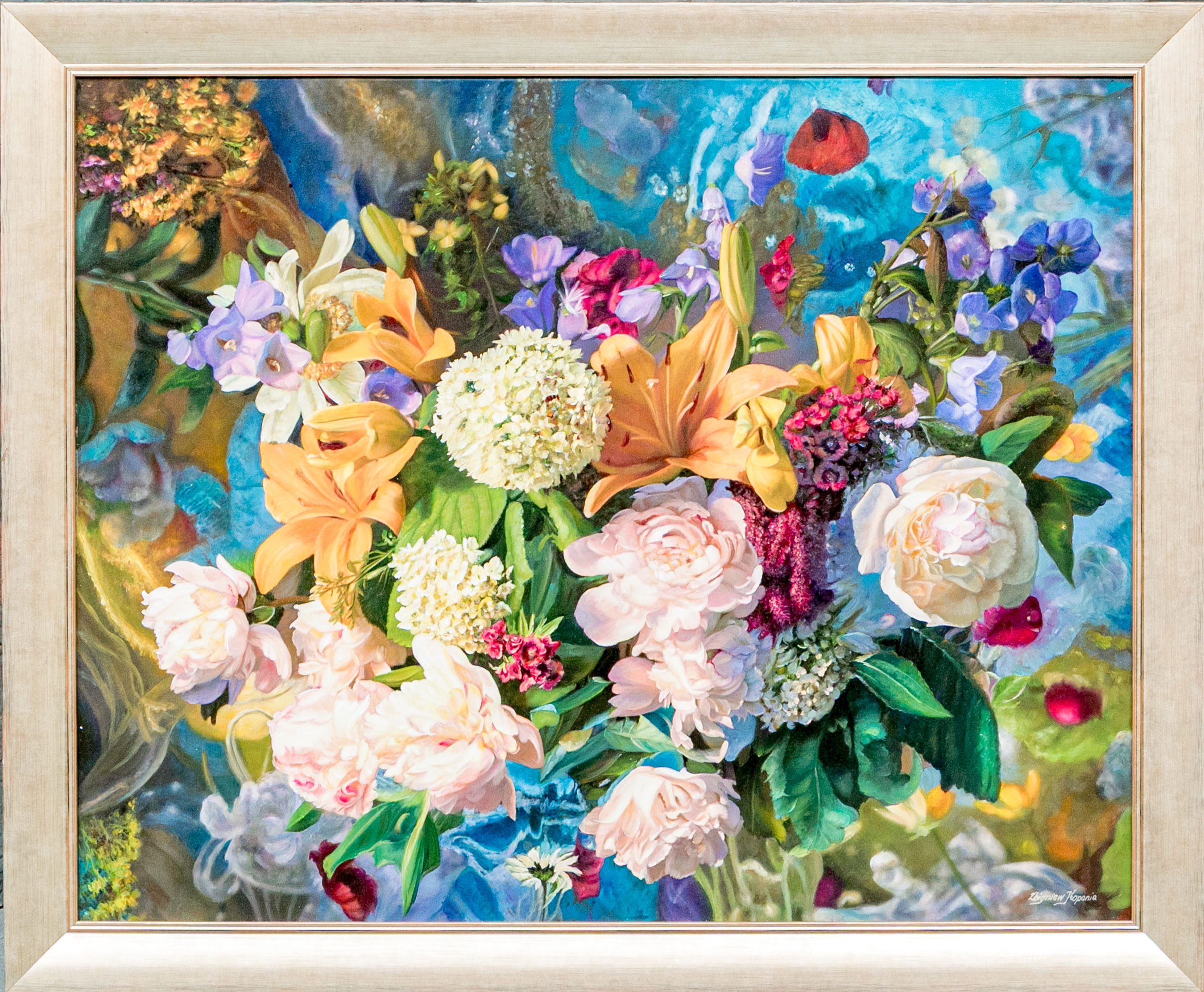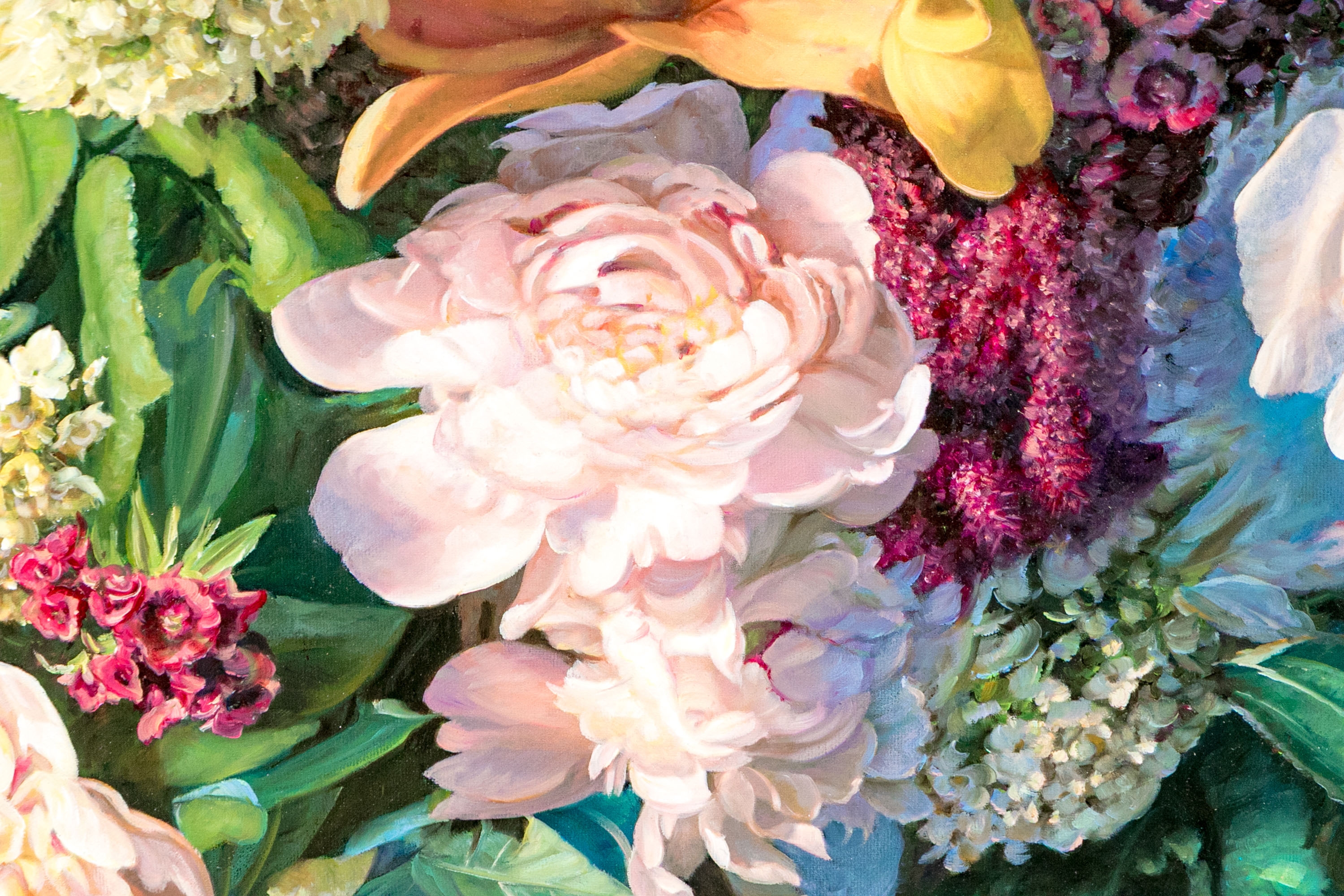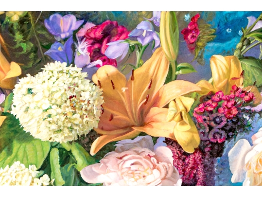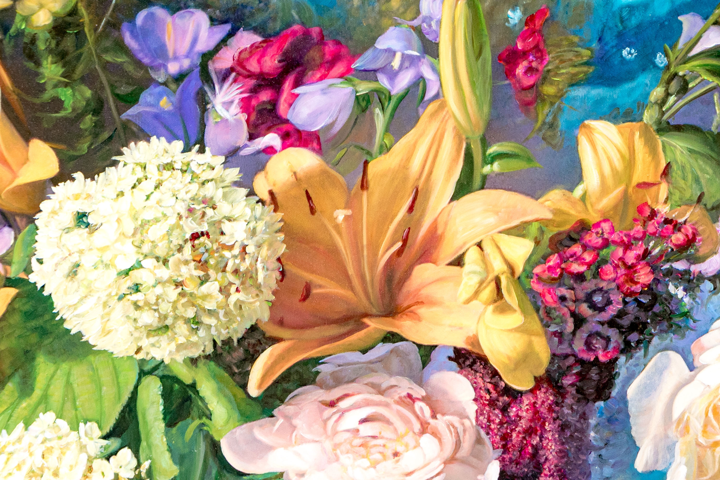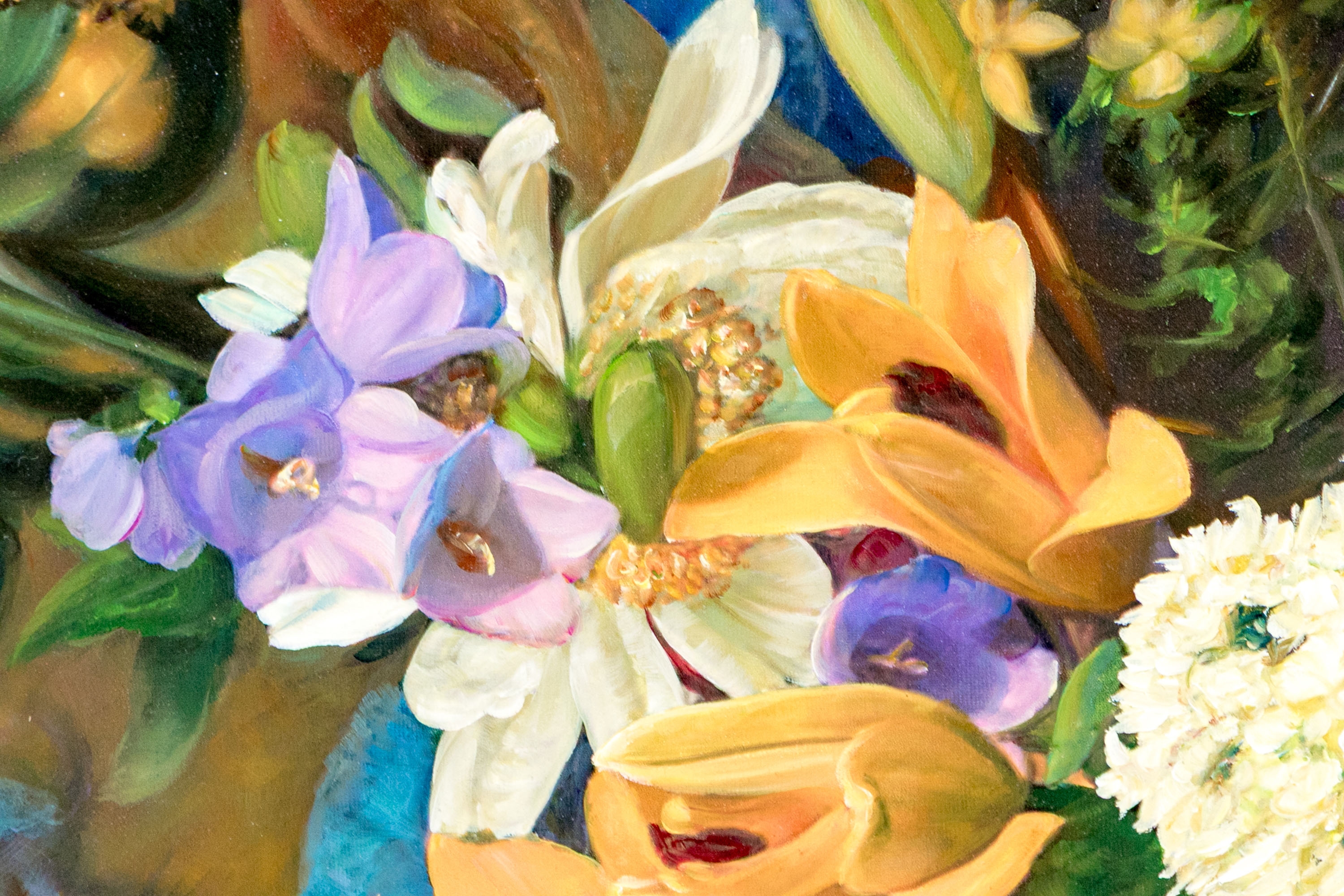 Oil on canvas presenting with a vibrant bouquet of flowers set against a blue background.