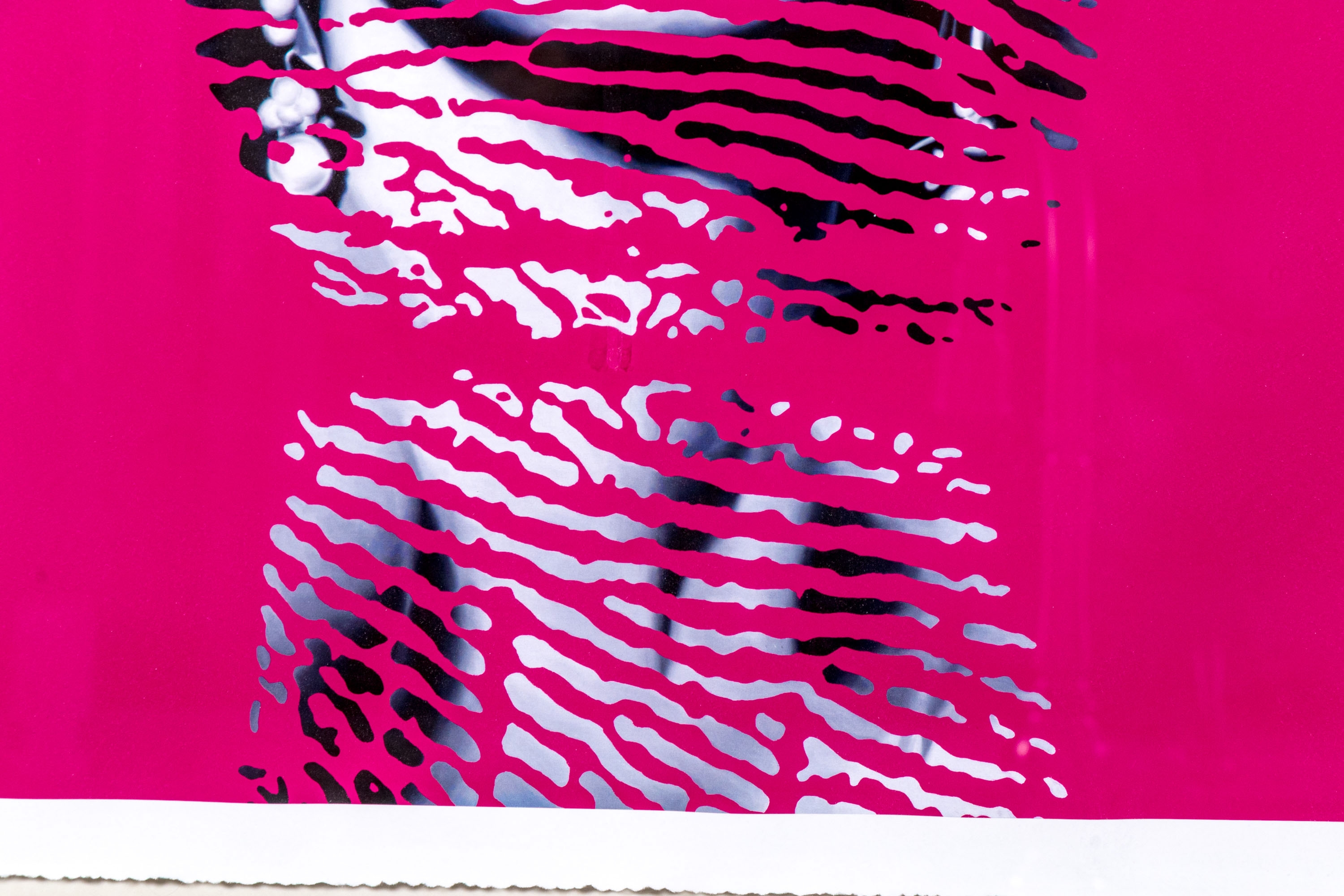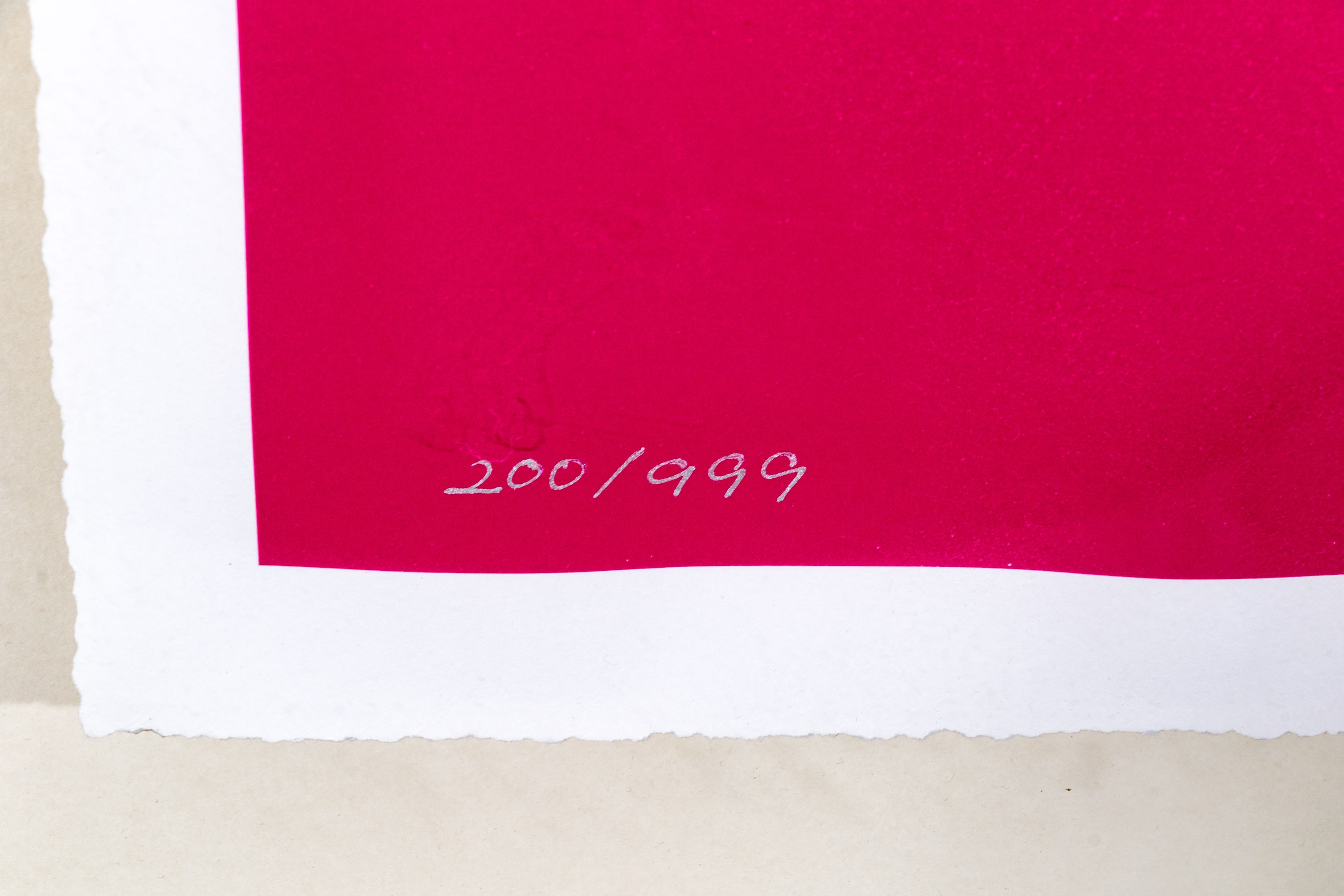 Depicting the iconic Marilyn Monroe, presented against pink background. Signed lower right in ink and numbered 200/999 lower left in ink. Presented floating with chrome finished frame and glazed. Dimensions: 23 1/2 x 23 1/2" W, paper size // 27 3/4 x 27 3/4" W, frame