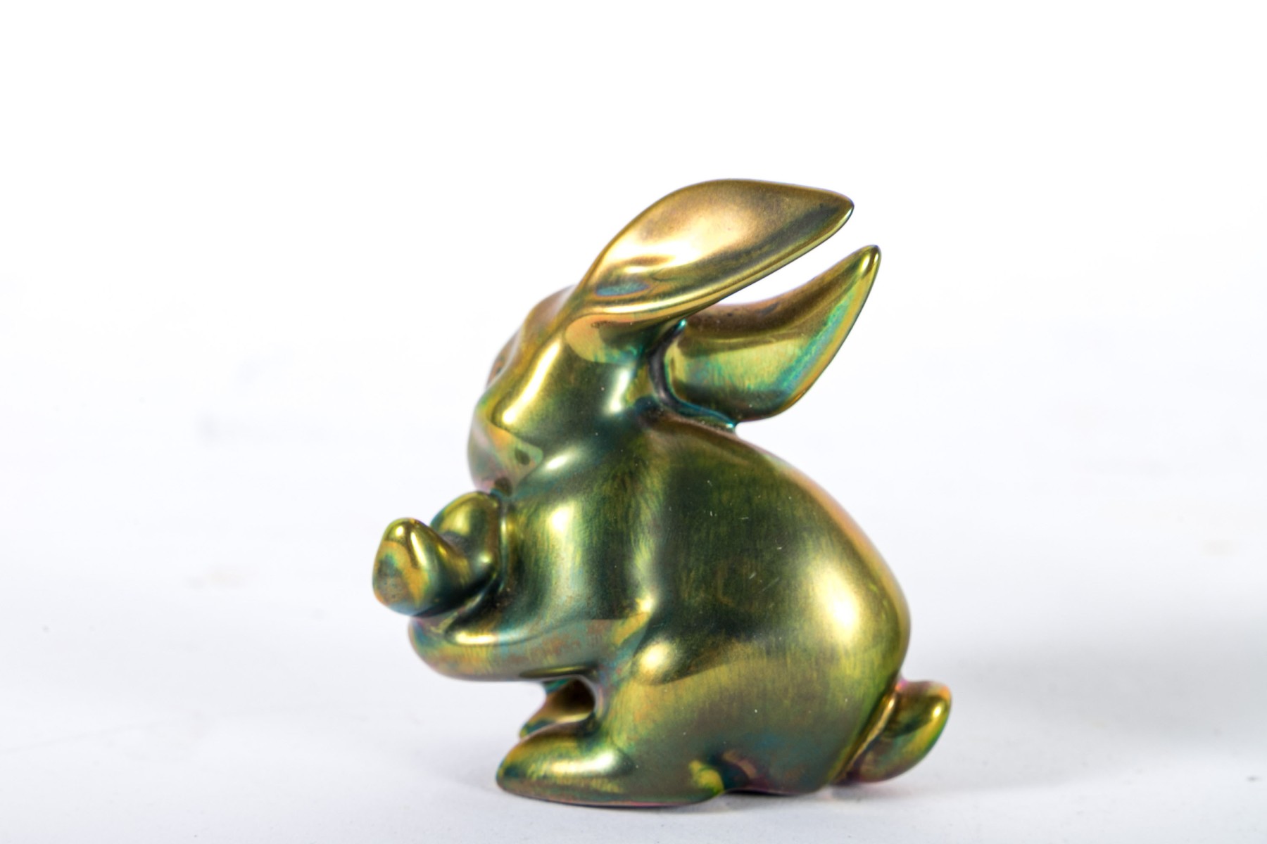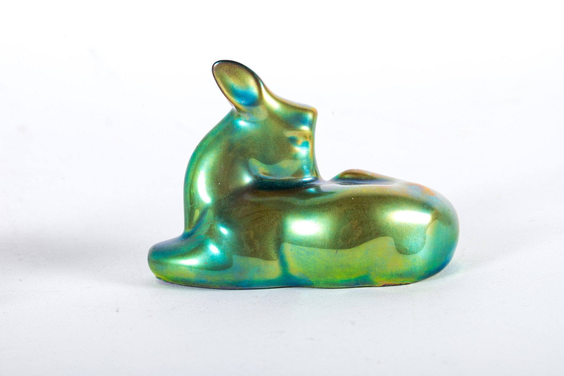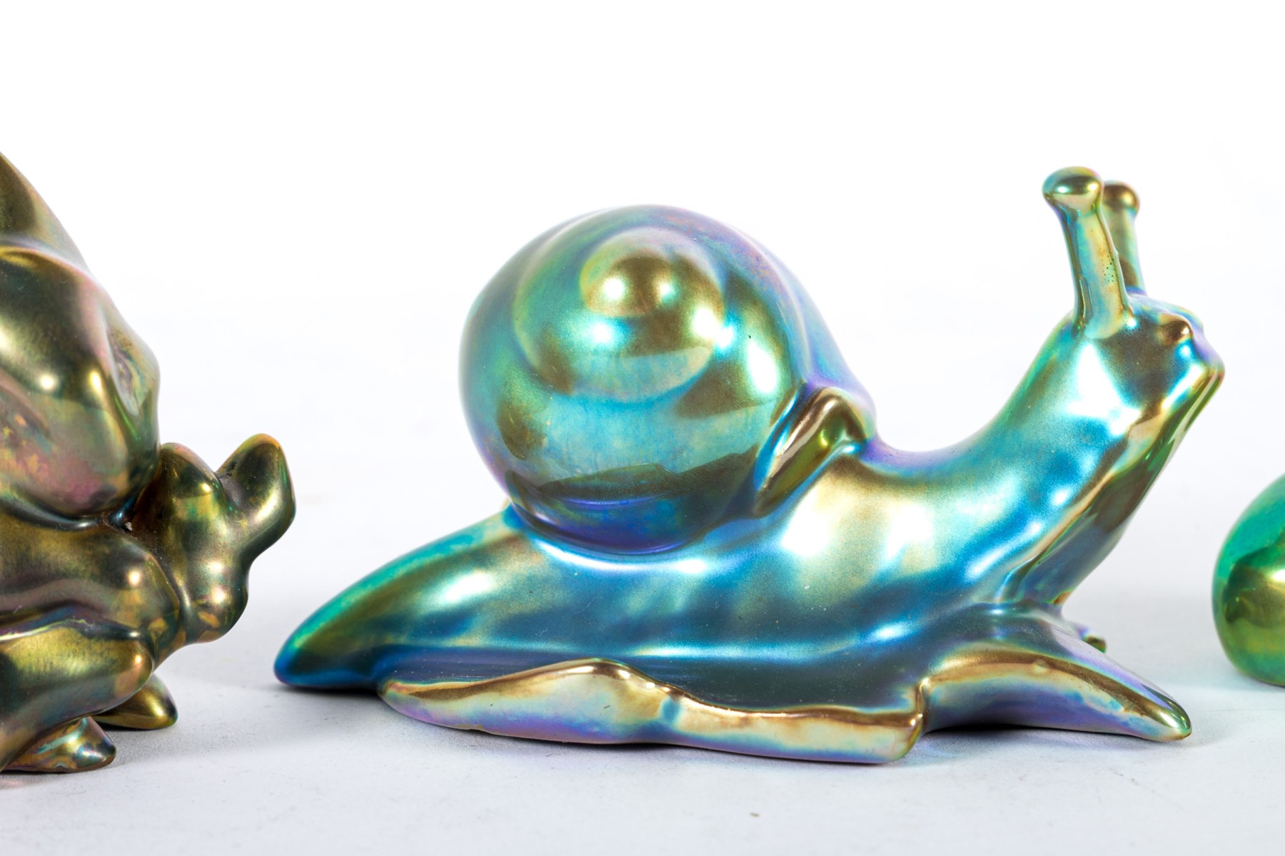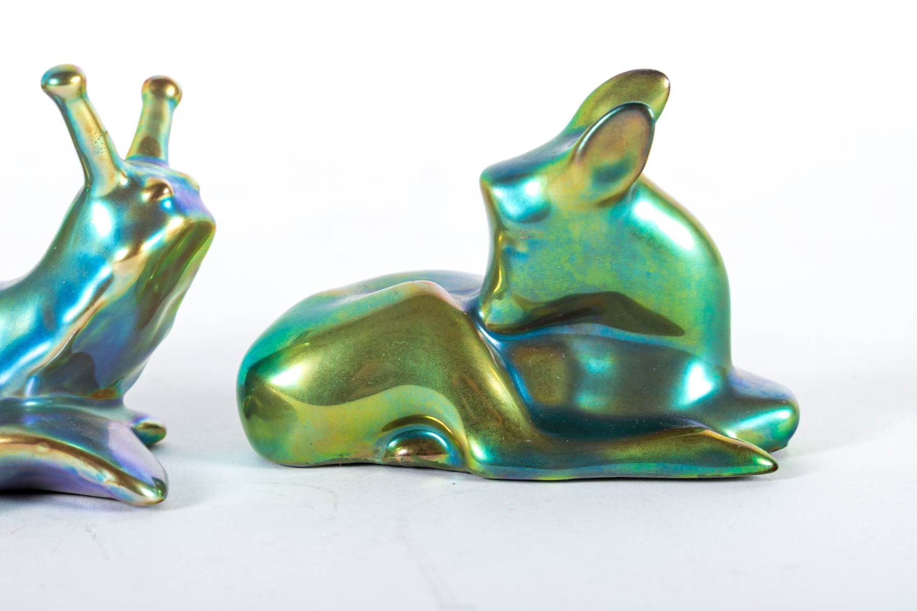 A trio of Zsolnay Hungary eosin ceramic animal figurines with gorgeous iridescent hues of green, yellow, and blue. Includes a snail, a fawn, and a rabbit. Marked on the underside.
