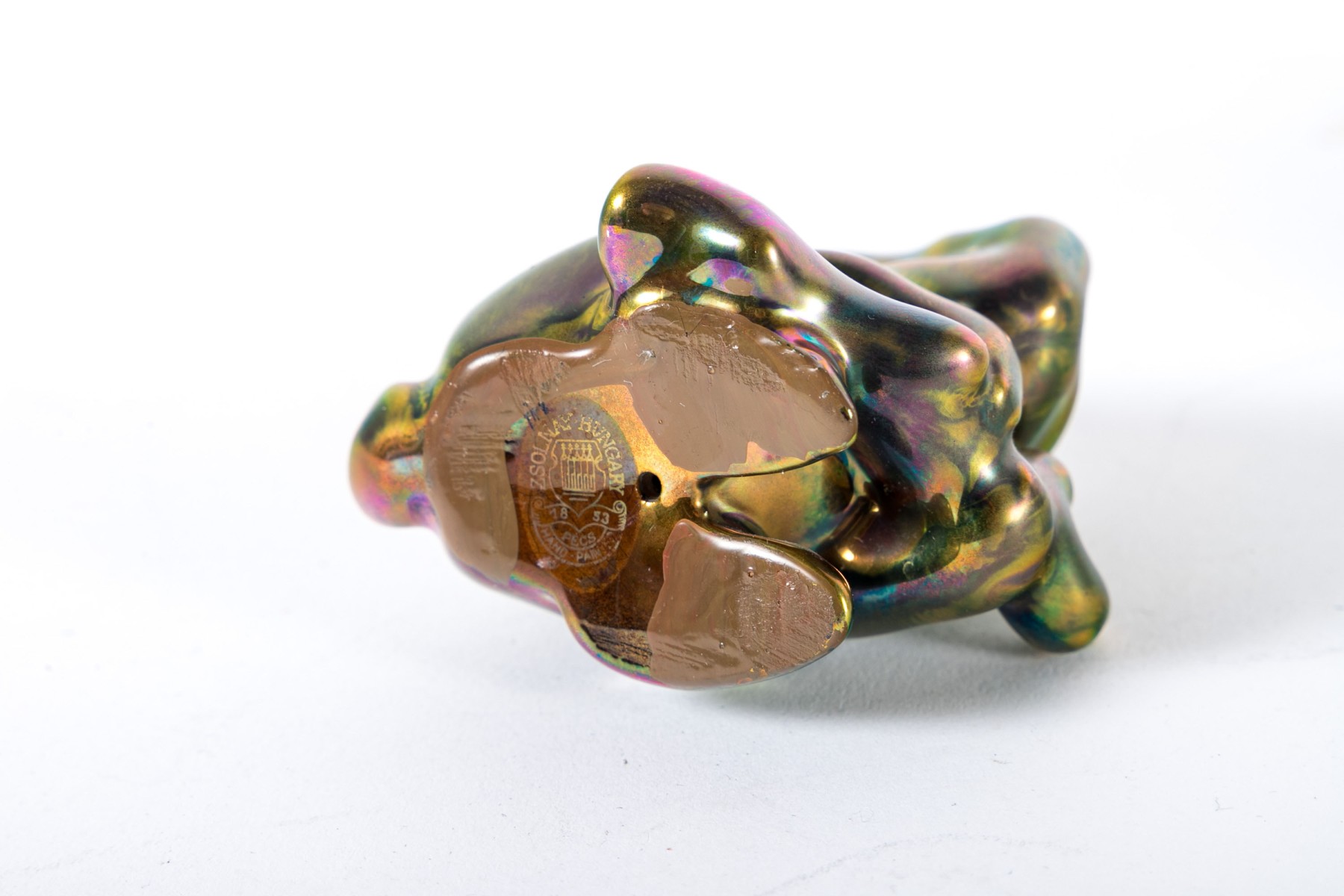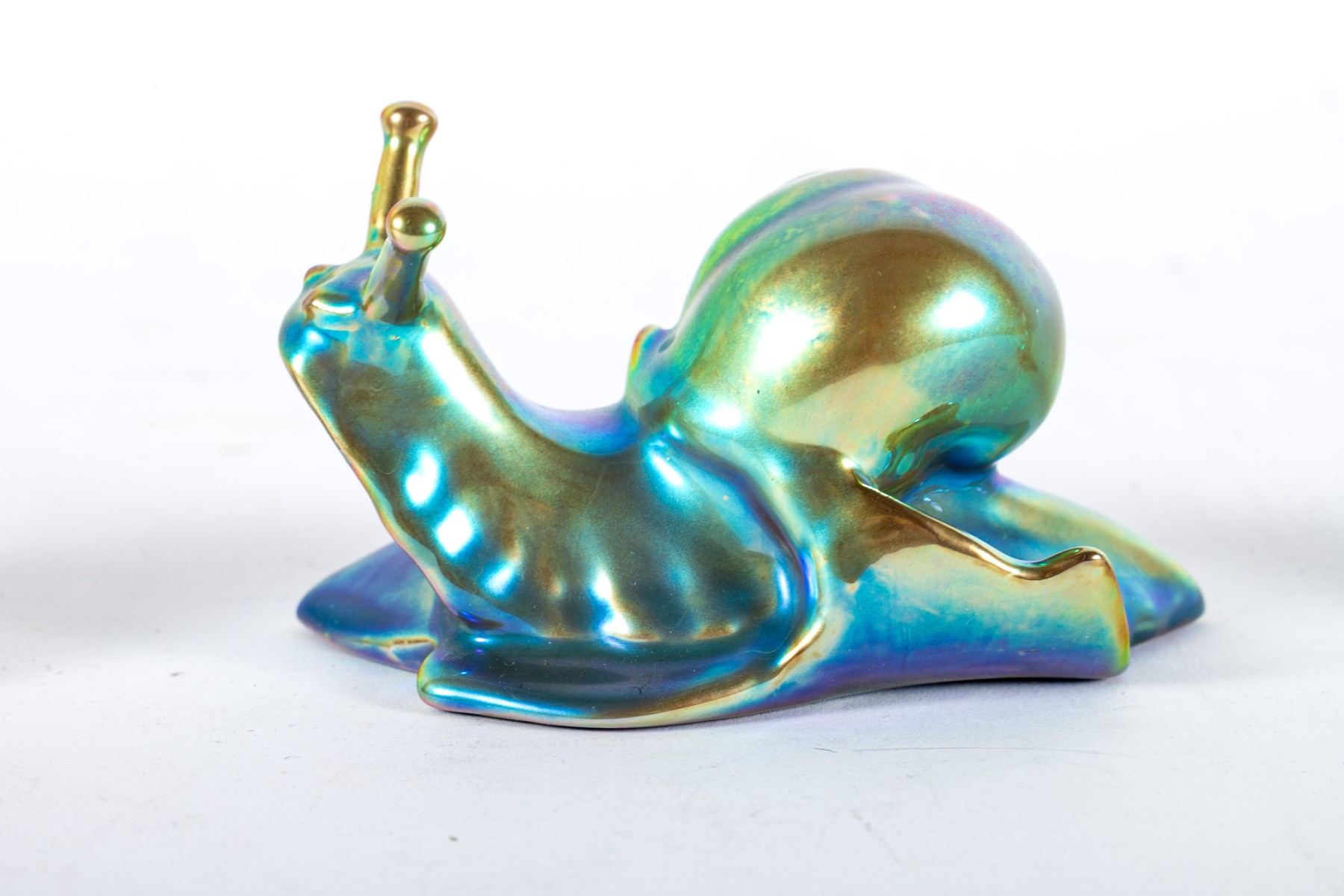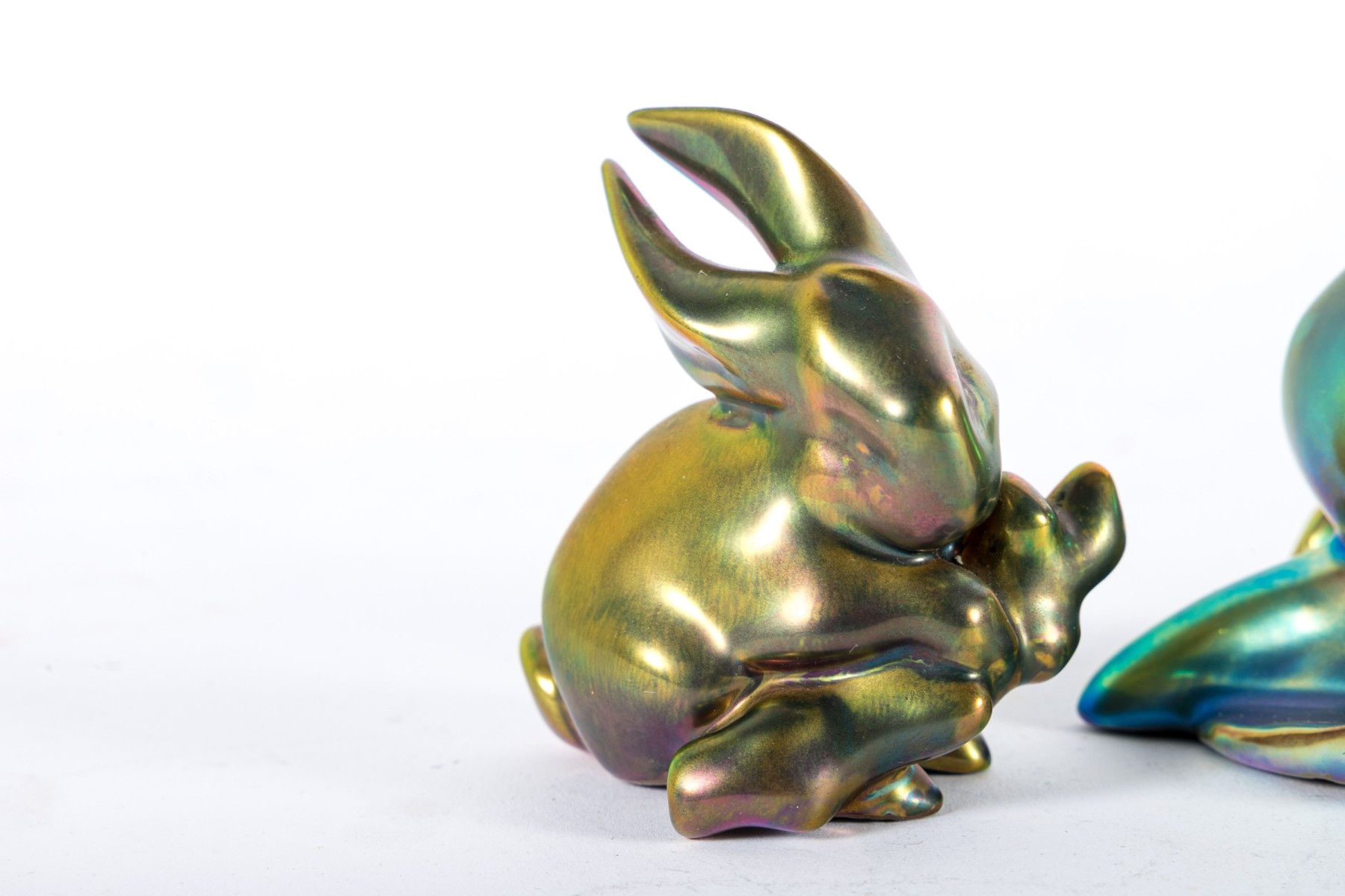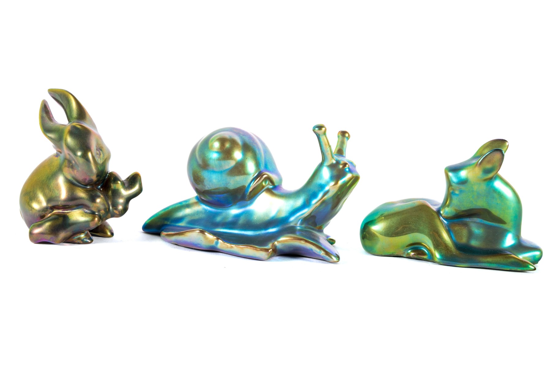 A trio of Zsolnay Hungary eosin ceramic animal figurines with gorgeous iridescent hues of green, yellow, and blue. Includes a snail, a fawn, and a rabbit. Marked on the underside.