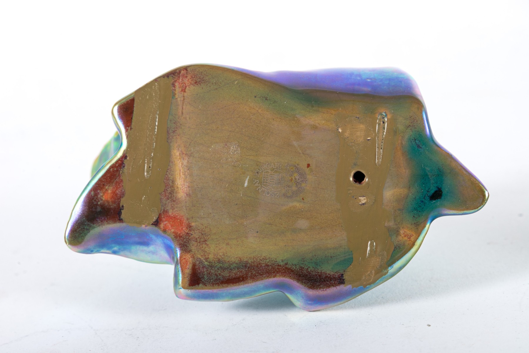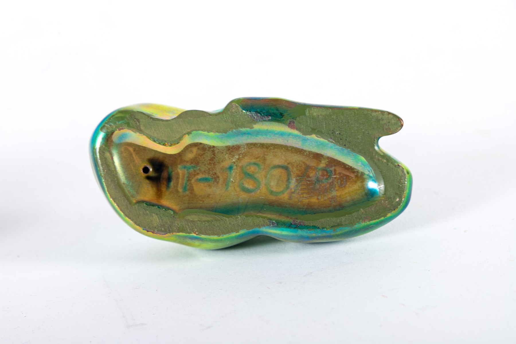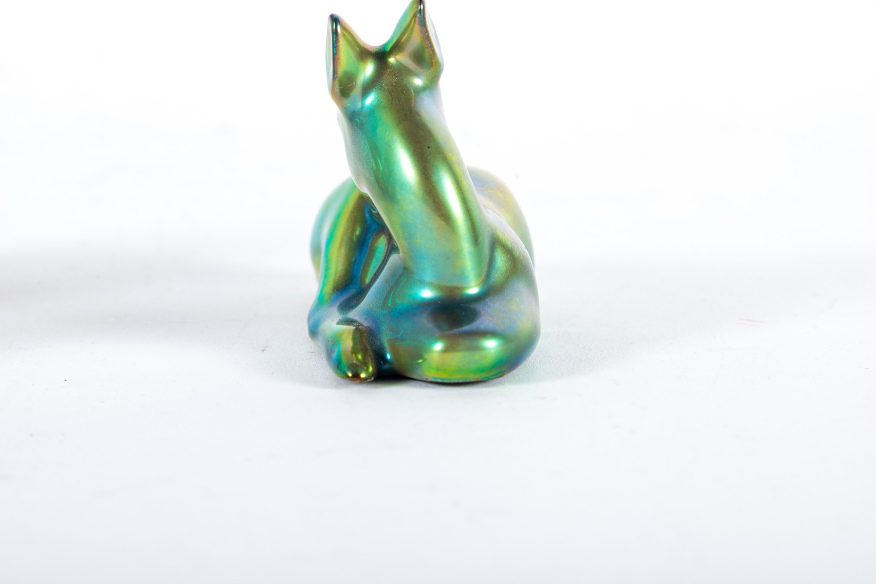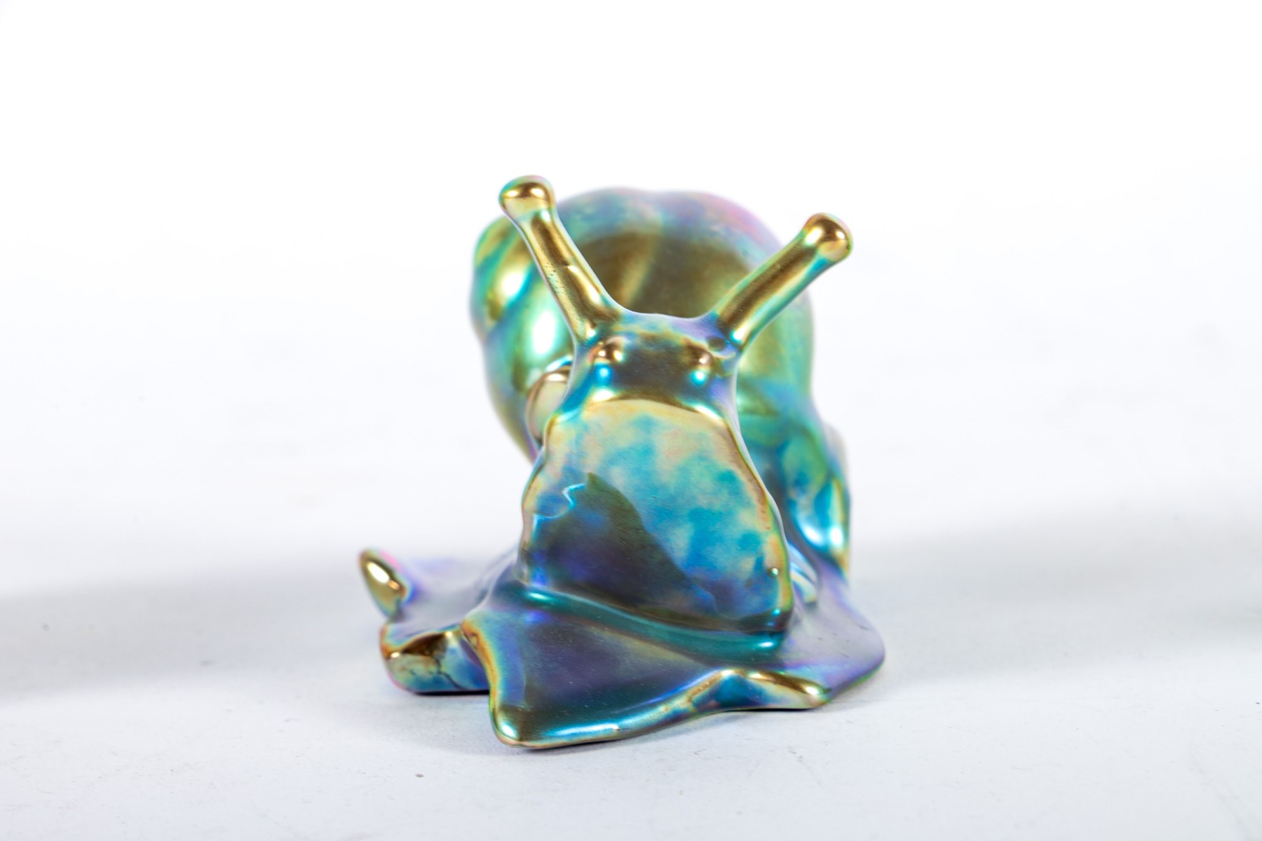 A trio of Zsolnay Hungary eosin ceramic animal figurines with gorgeous iridescent hues of green, yellow, and blue. Includes a snail, a fawn, and a rabbit. Marked on the underside.