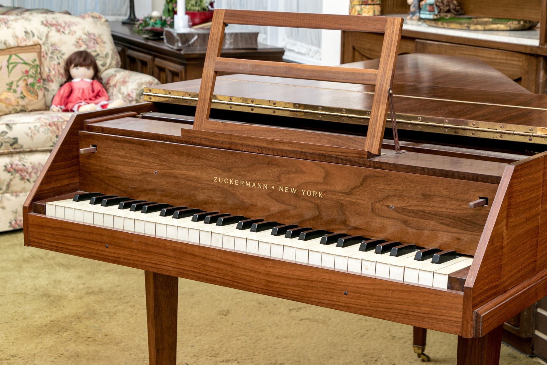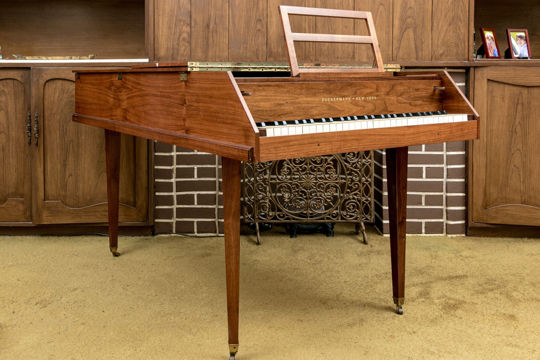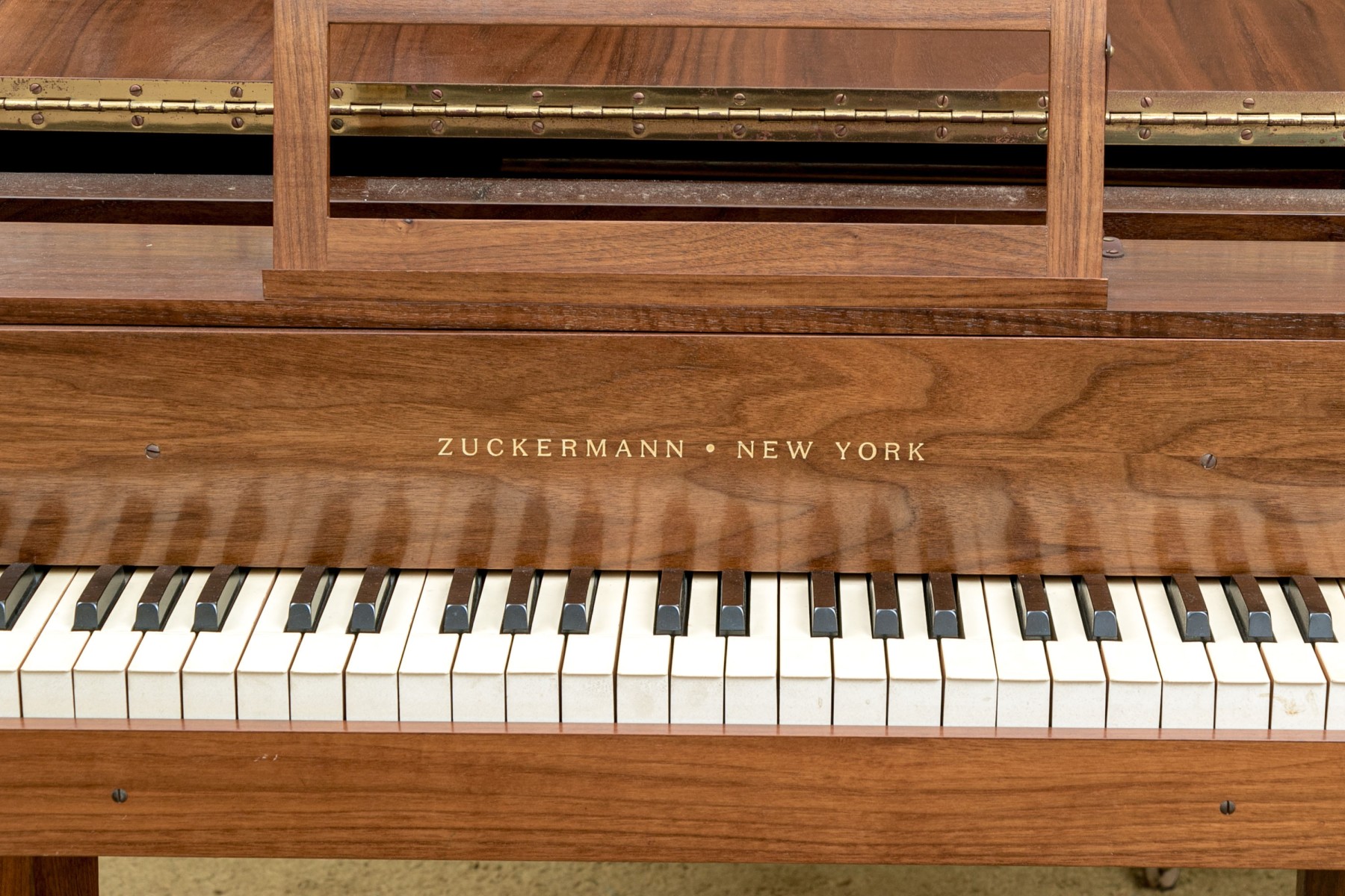 A fantastic Zuckermann New York piano #137-196 in beautiful honeyed medium brown finished wood. On brass capped feet with casters for ease of mobility.