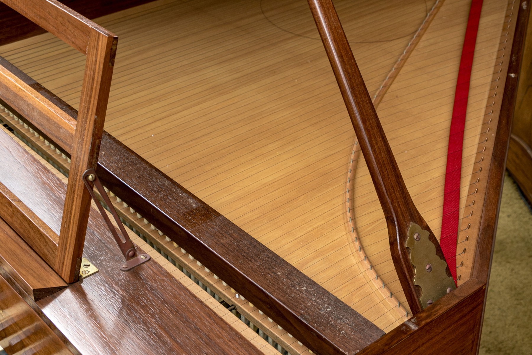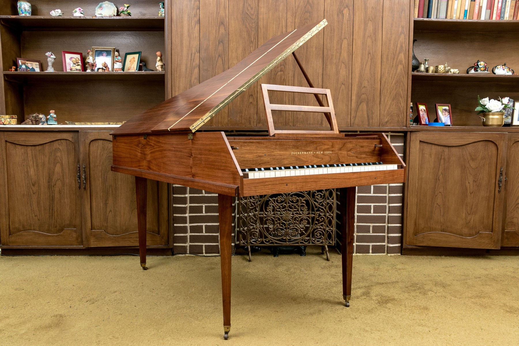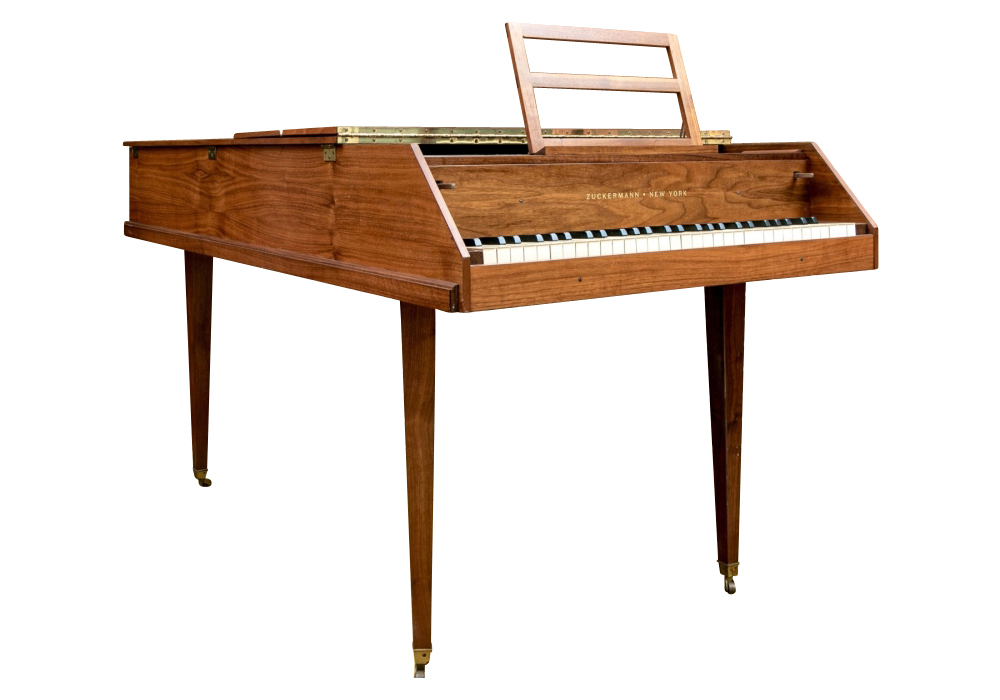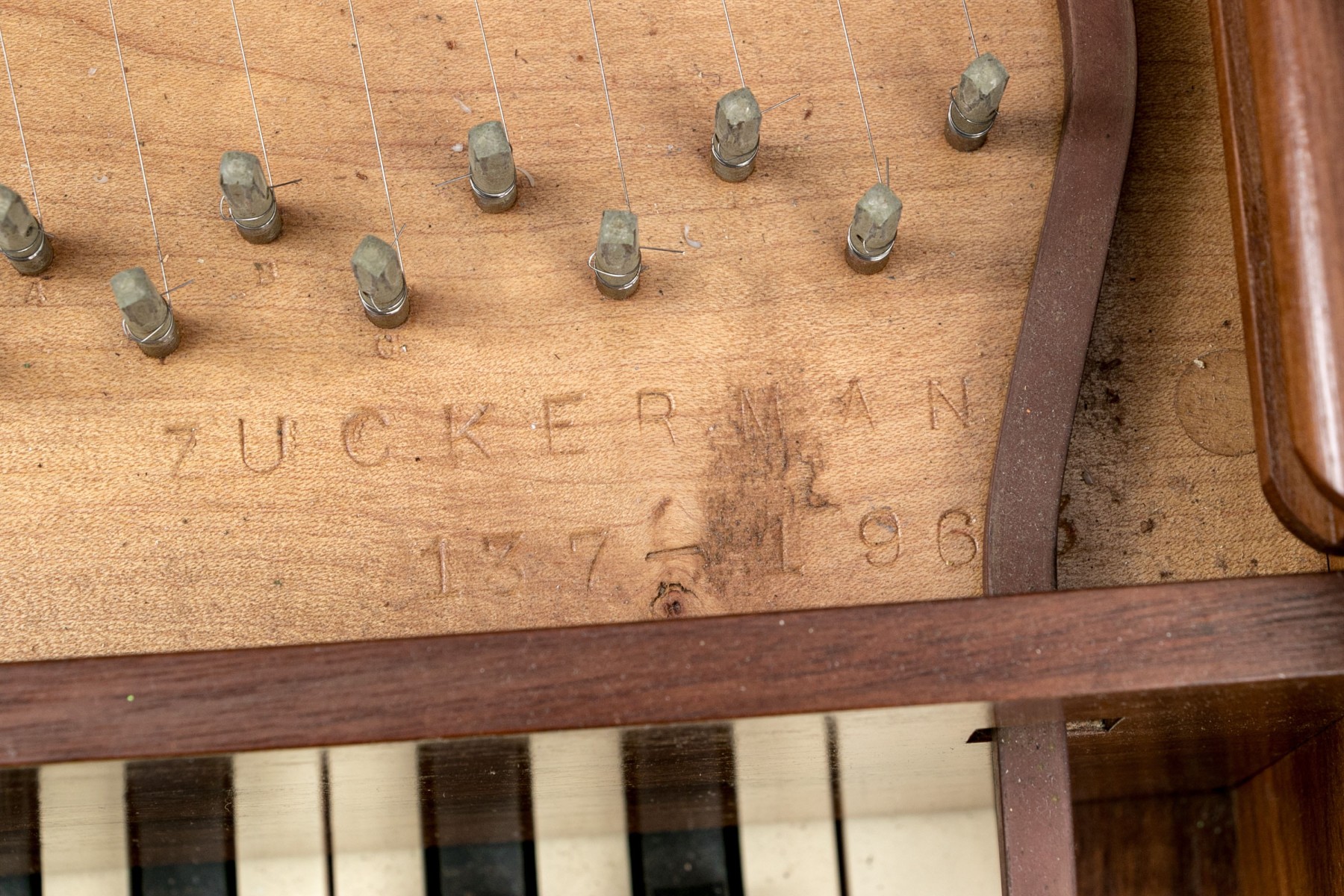 A fantastic Zuckermann New York piano #137-196 in beautiful honeyed medium brown finished wood. On brass capped feet with casters for ease of mobility.