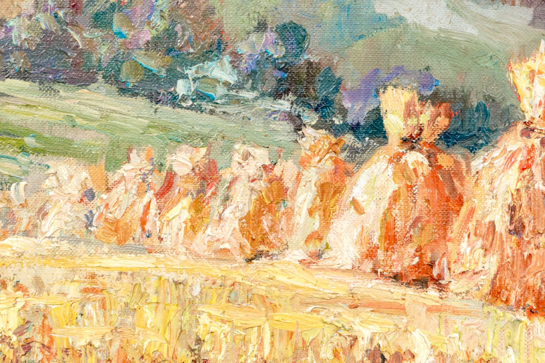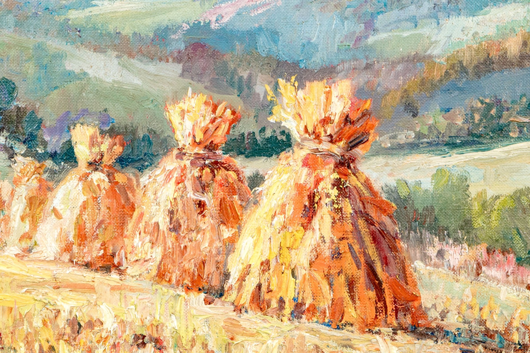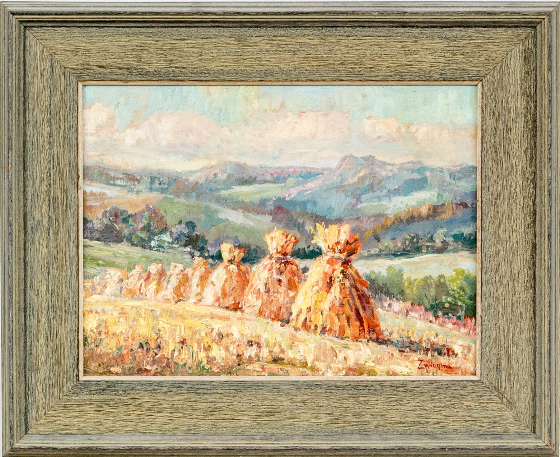 Zwiagina (Polish, 20th Century) oil painting on canvas panel depicting a charming impressionist rural cene of haystacks lined up along a field leading to a view of rolling farm fields and mountains on the horizon beneath a clouded blue, pink, and yellow sky. Signed lower right.